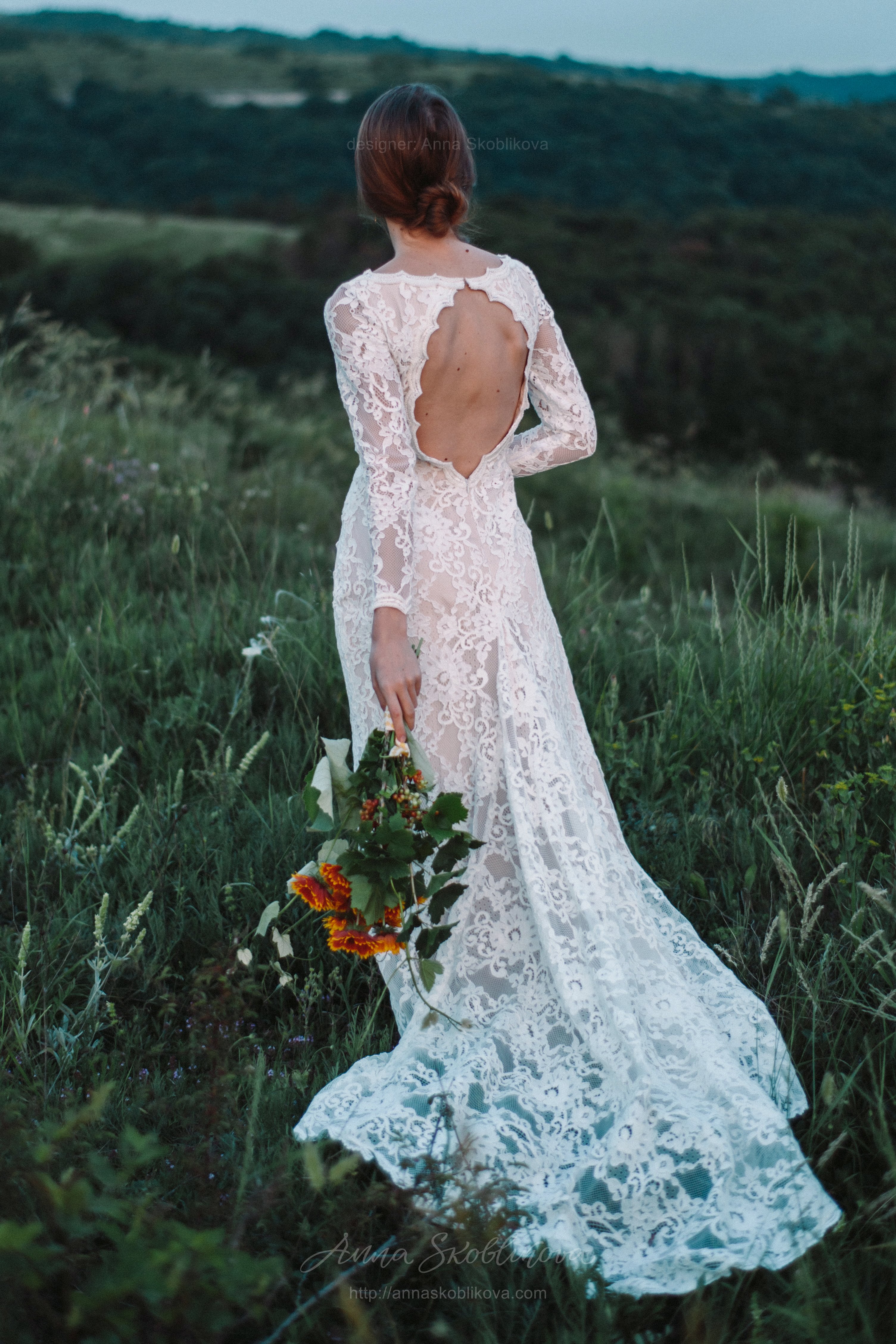 Backless wedding dress with shaped cut from behind and milk chantilly lace adorned with narrow lace during a line of v-neck cut and sleeves.