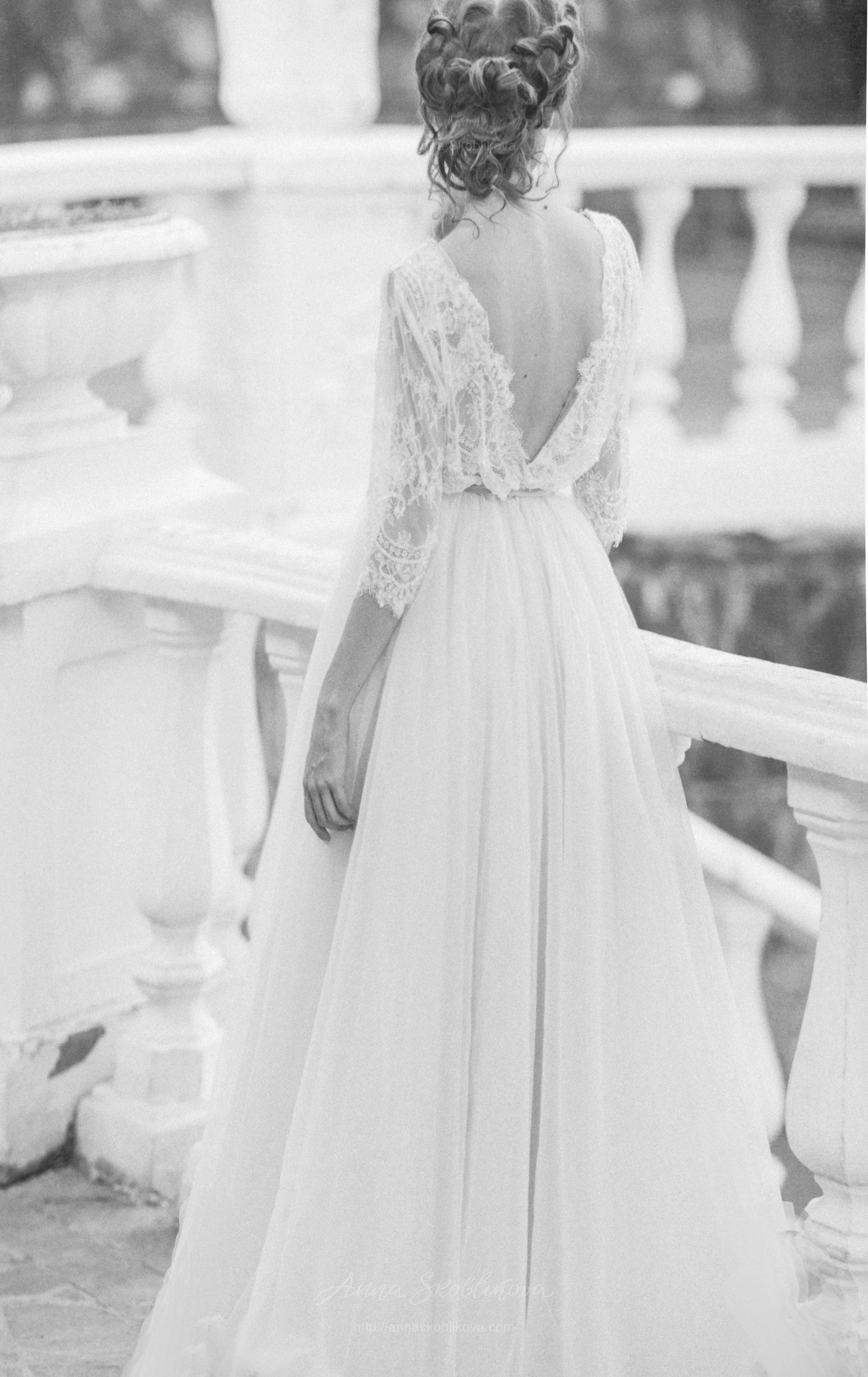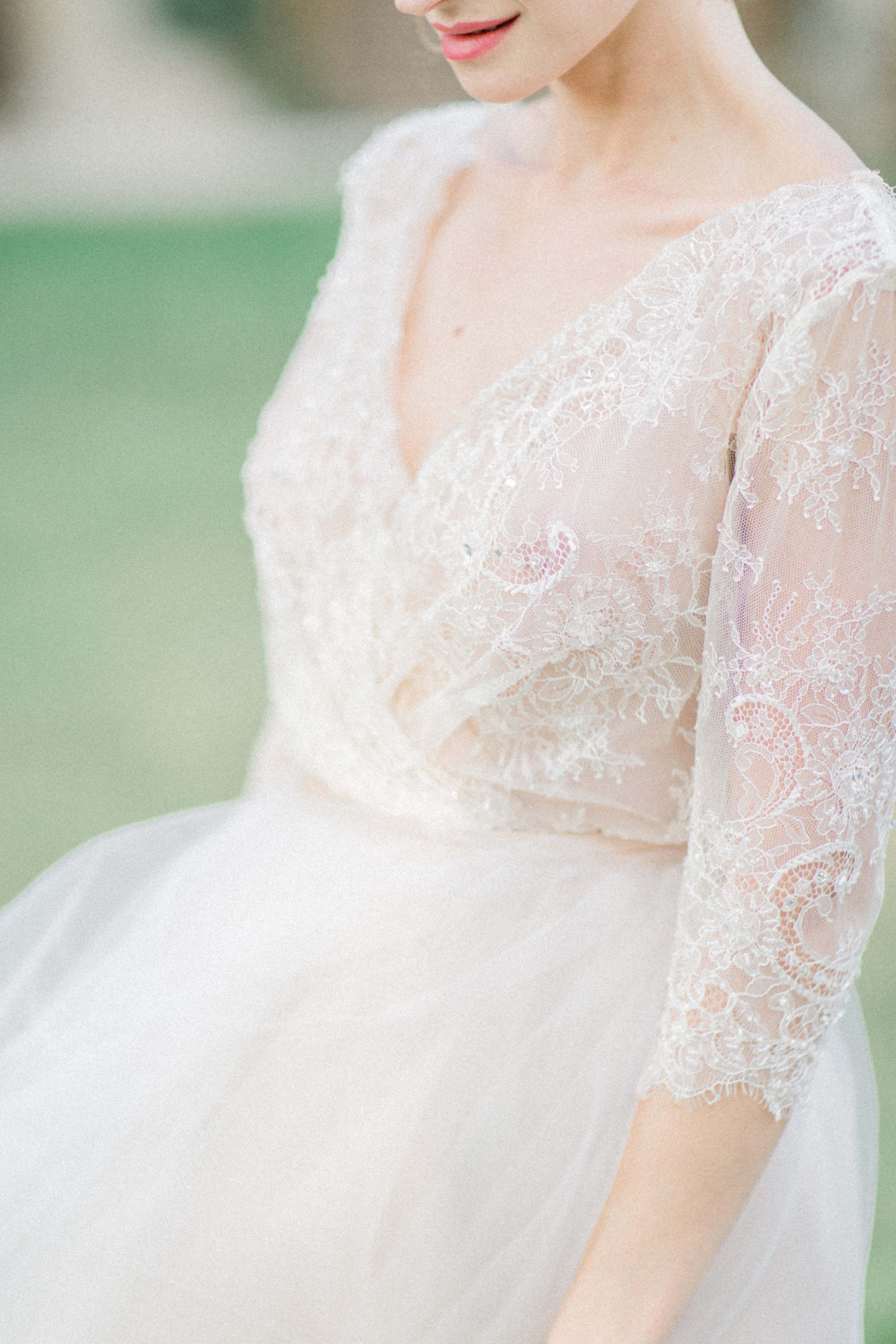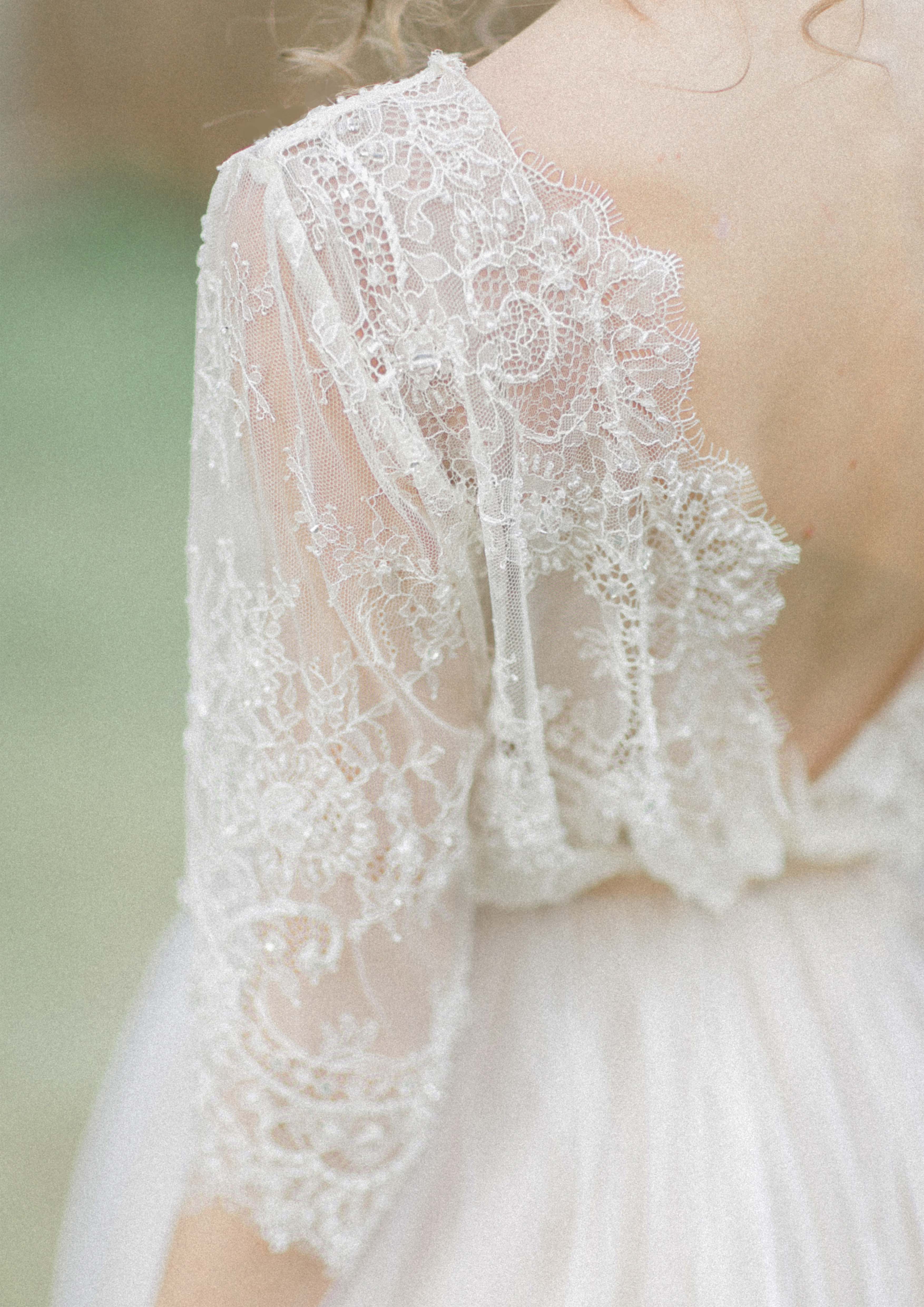 The mesh used inside the bodice is the finest and softest tulle. Its powdery color emphasizes the milk lace and makes the bodice look transparent but opaque.