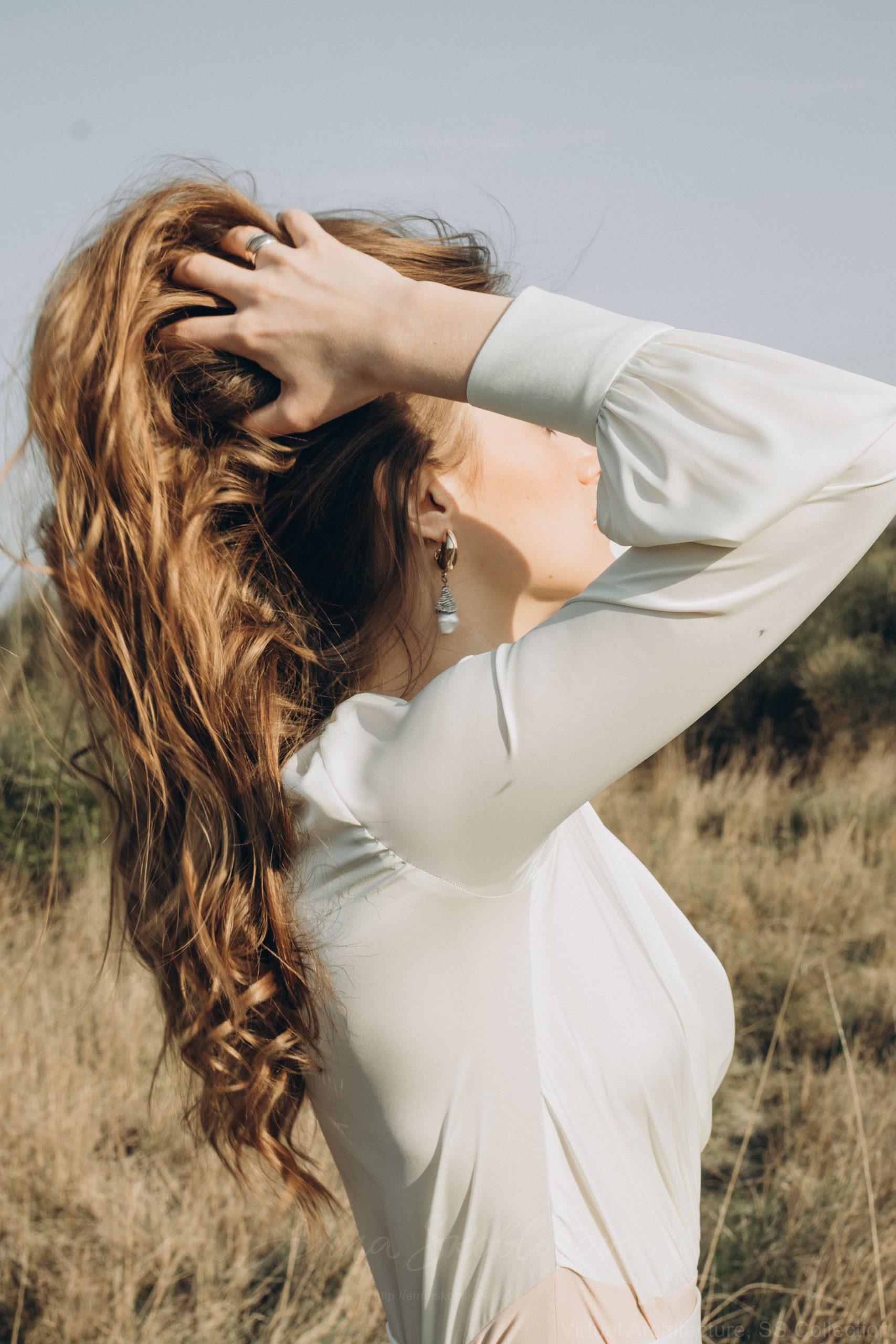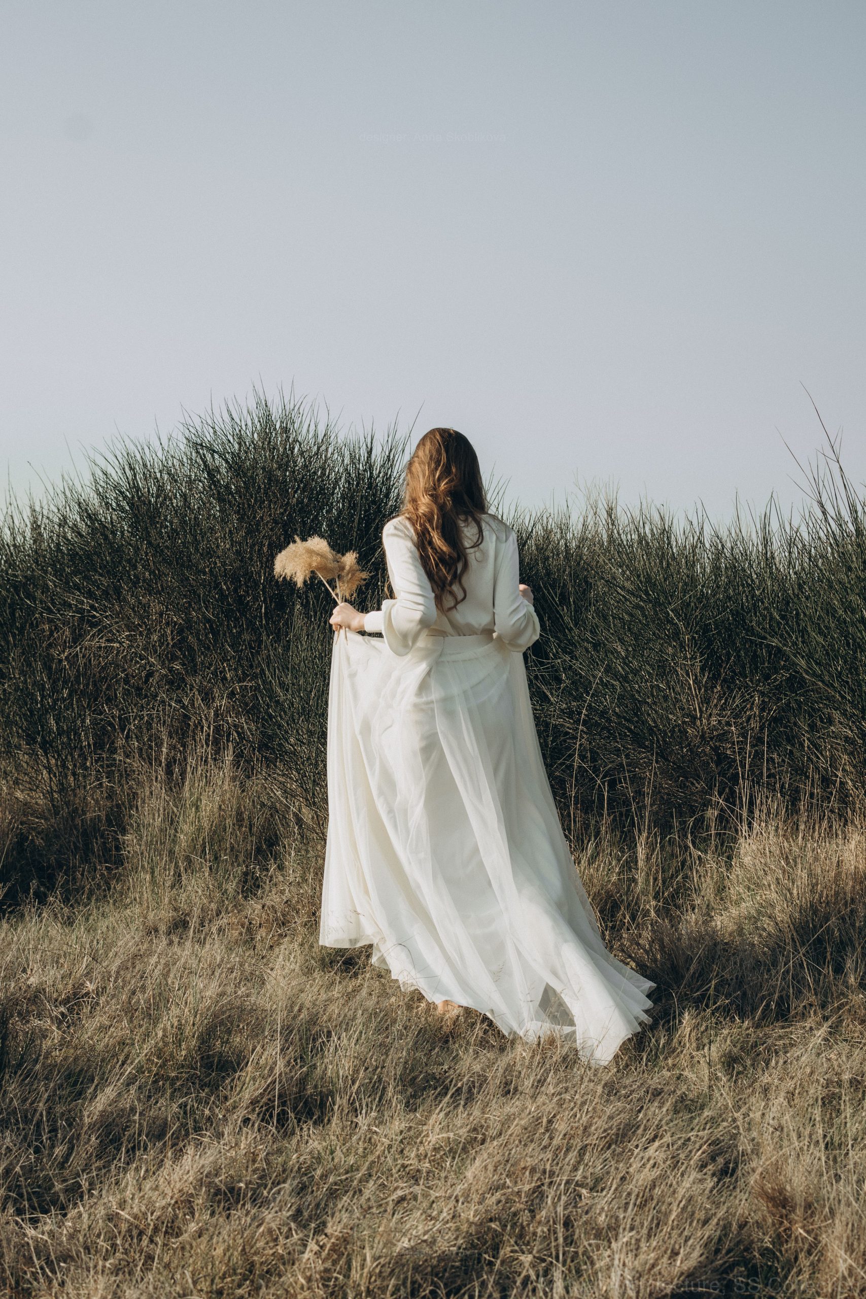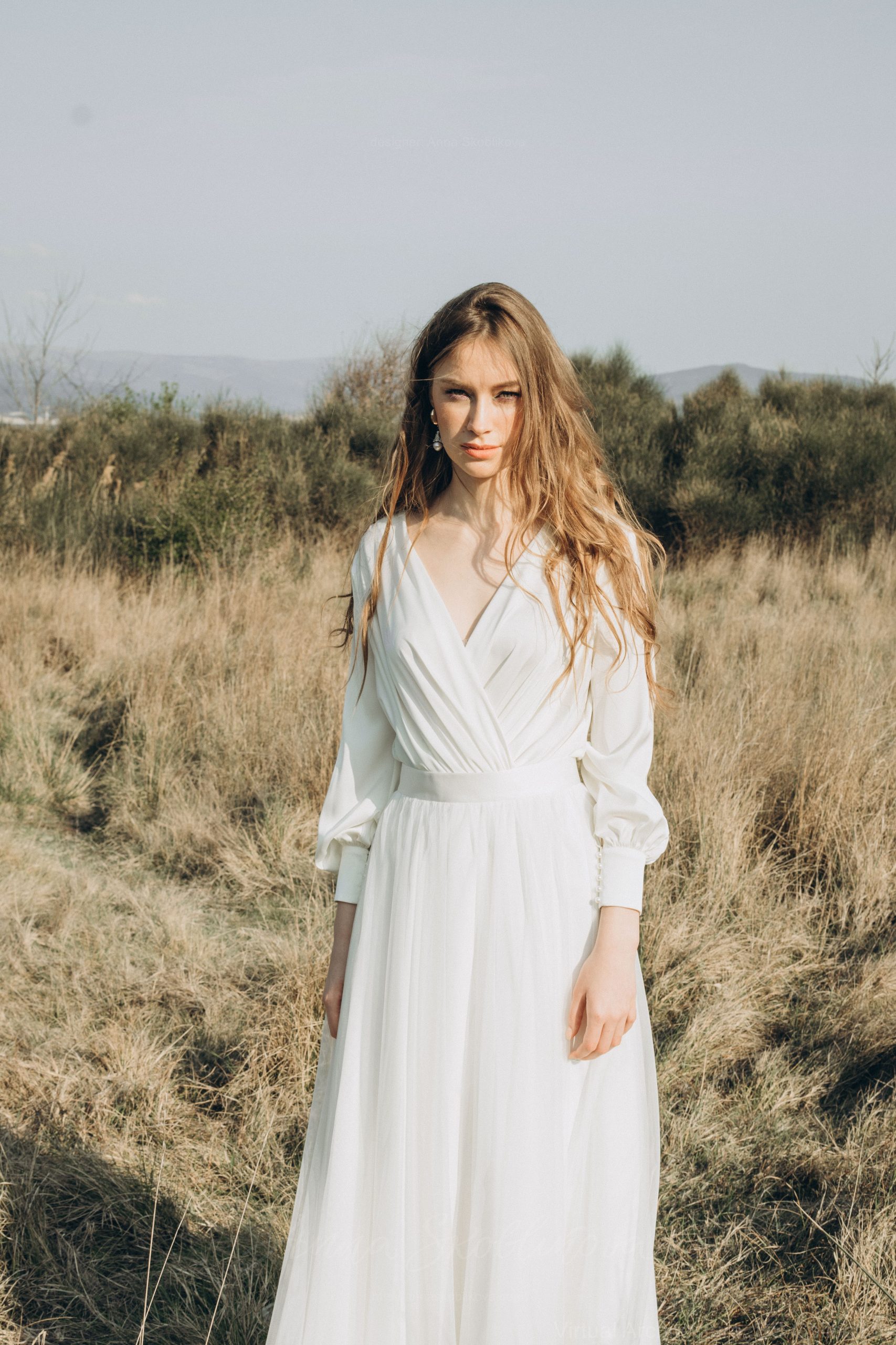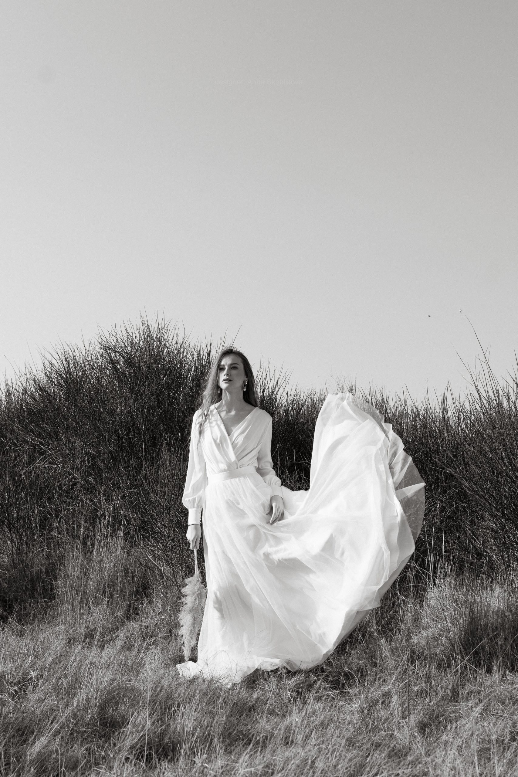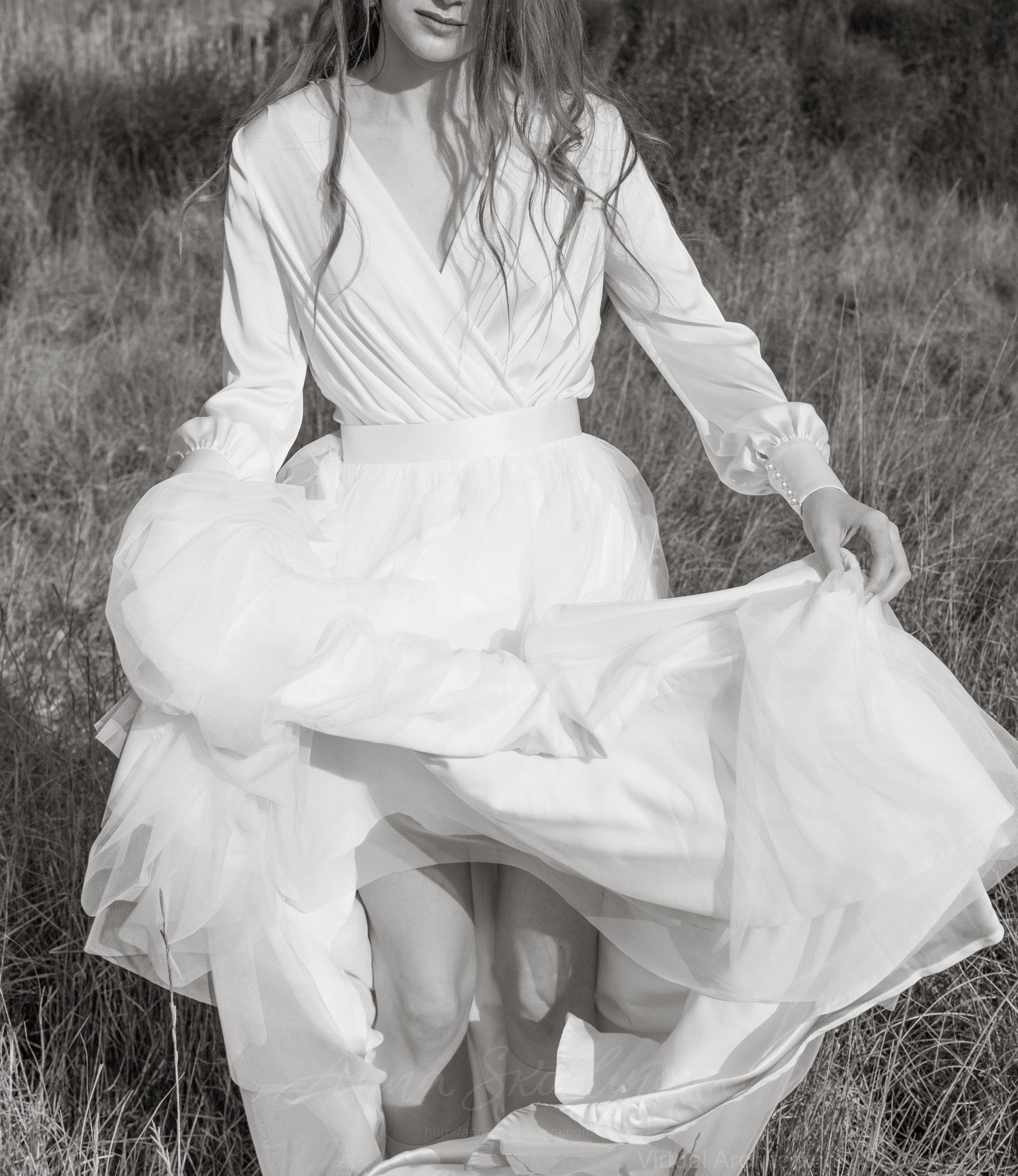Country style wedding dress \ set – Annabel consists of a silk cross-body wrap bodysuit with pleats and a smooth-waisted mesh skirt. The wedding dress bodysuit is made of a single layer of thin artificial silk. It features a wrap design with pleats. The wedding dress bodysuit sleeves are wide, with gathering at the cuff – bishop sleeves.