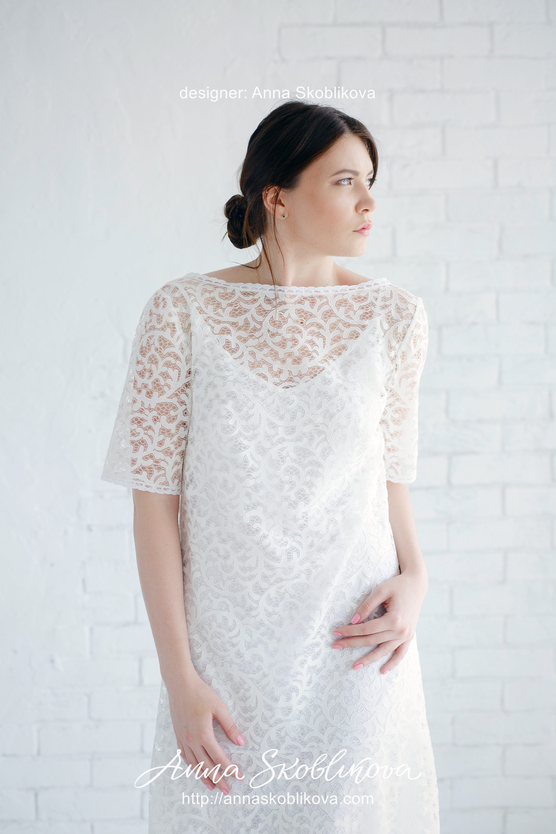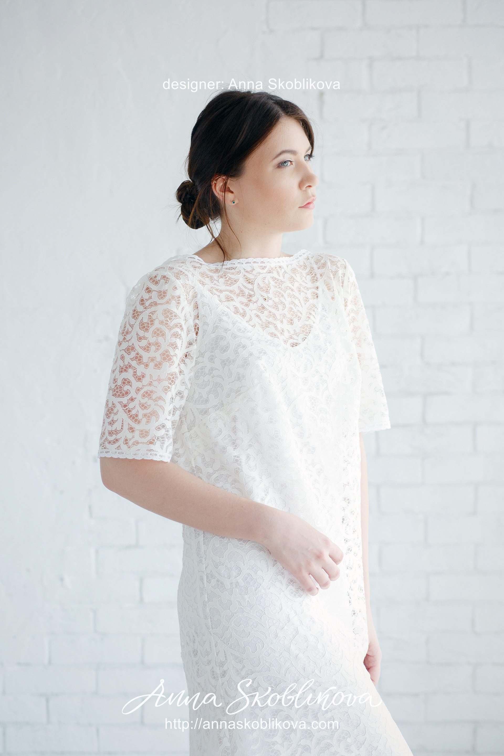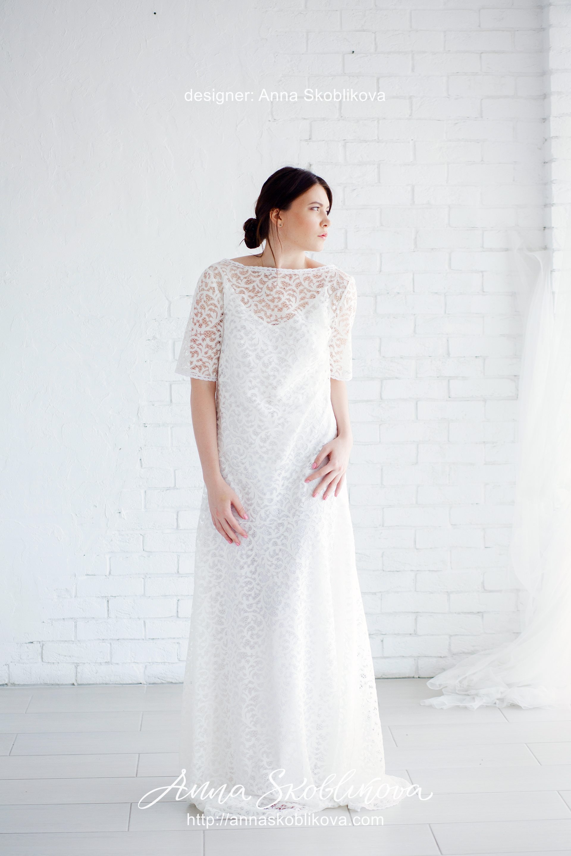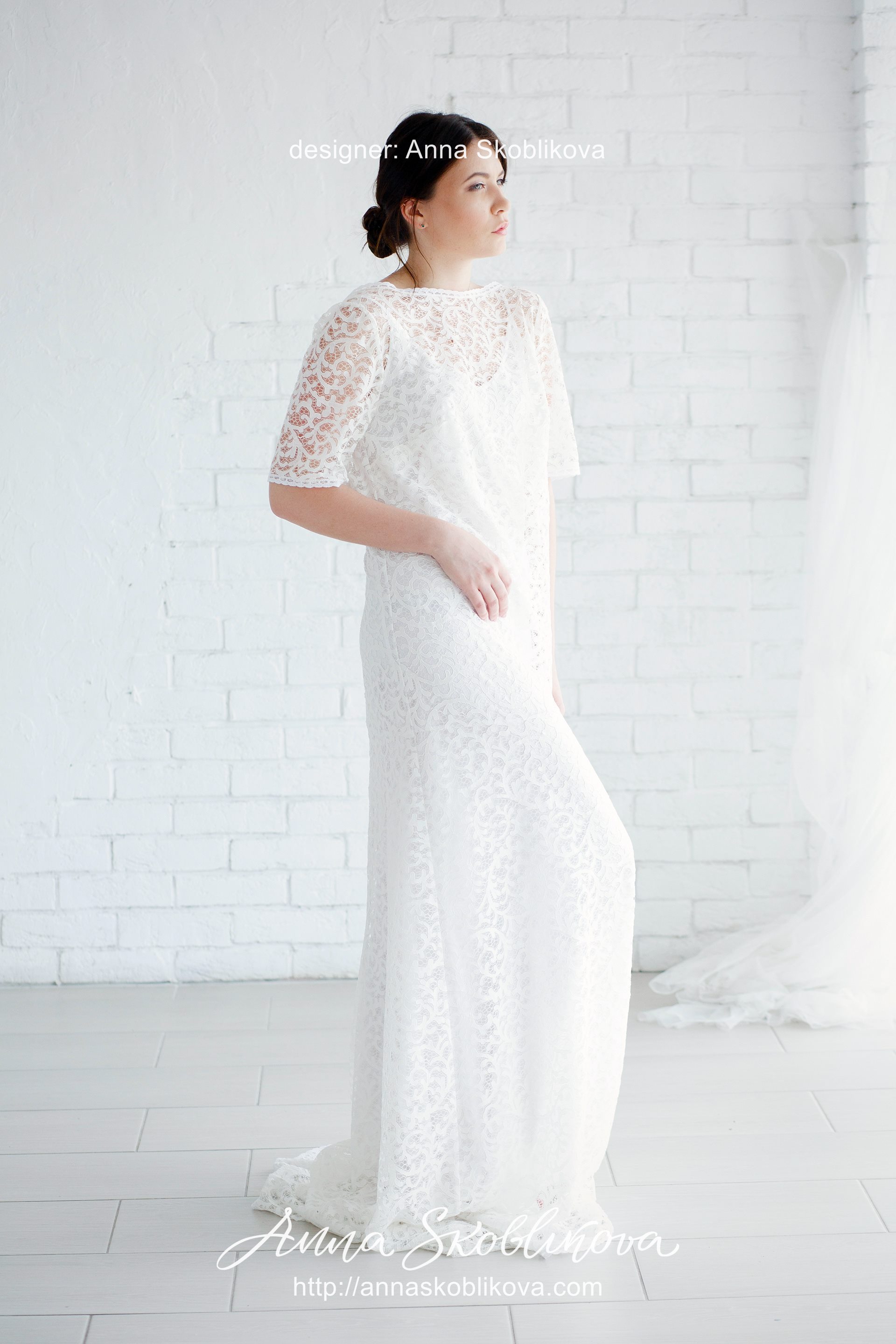 The lace upper dress is fitted and has a small flare under the knees. Sleeves are of elbow length, the back of the dress is with a round cut and lower back comes with a zipper. The fitted under dress is of natural silk with V-neck cut in front. Delicate two-piece wedding dress: the upper dress made of lace and silk under dress on straps.