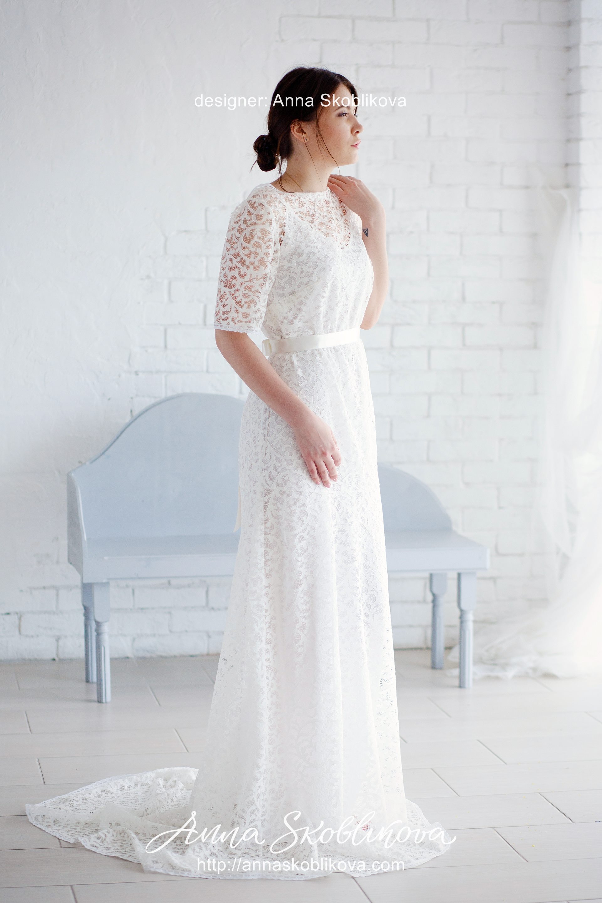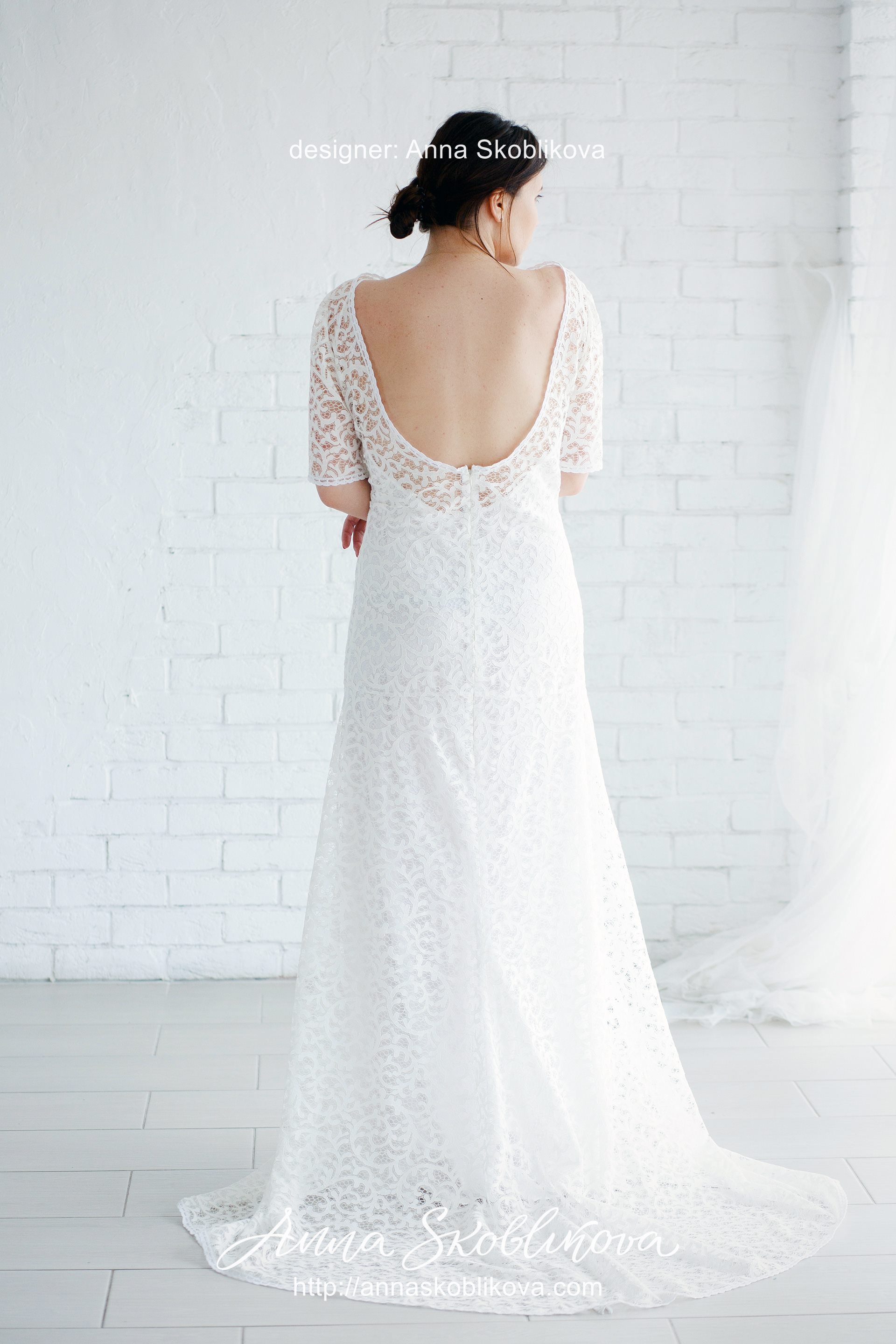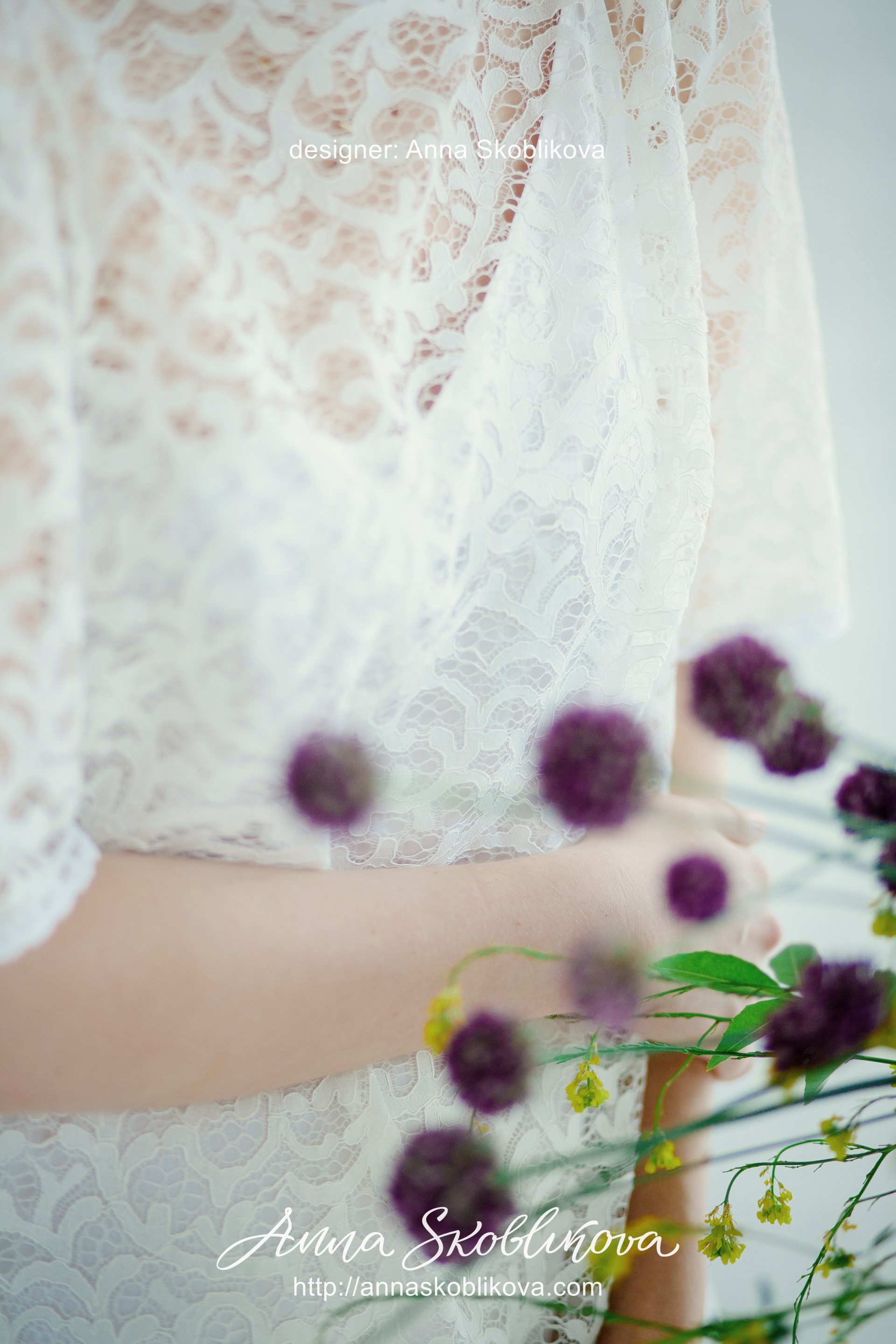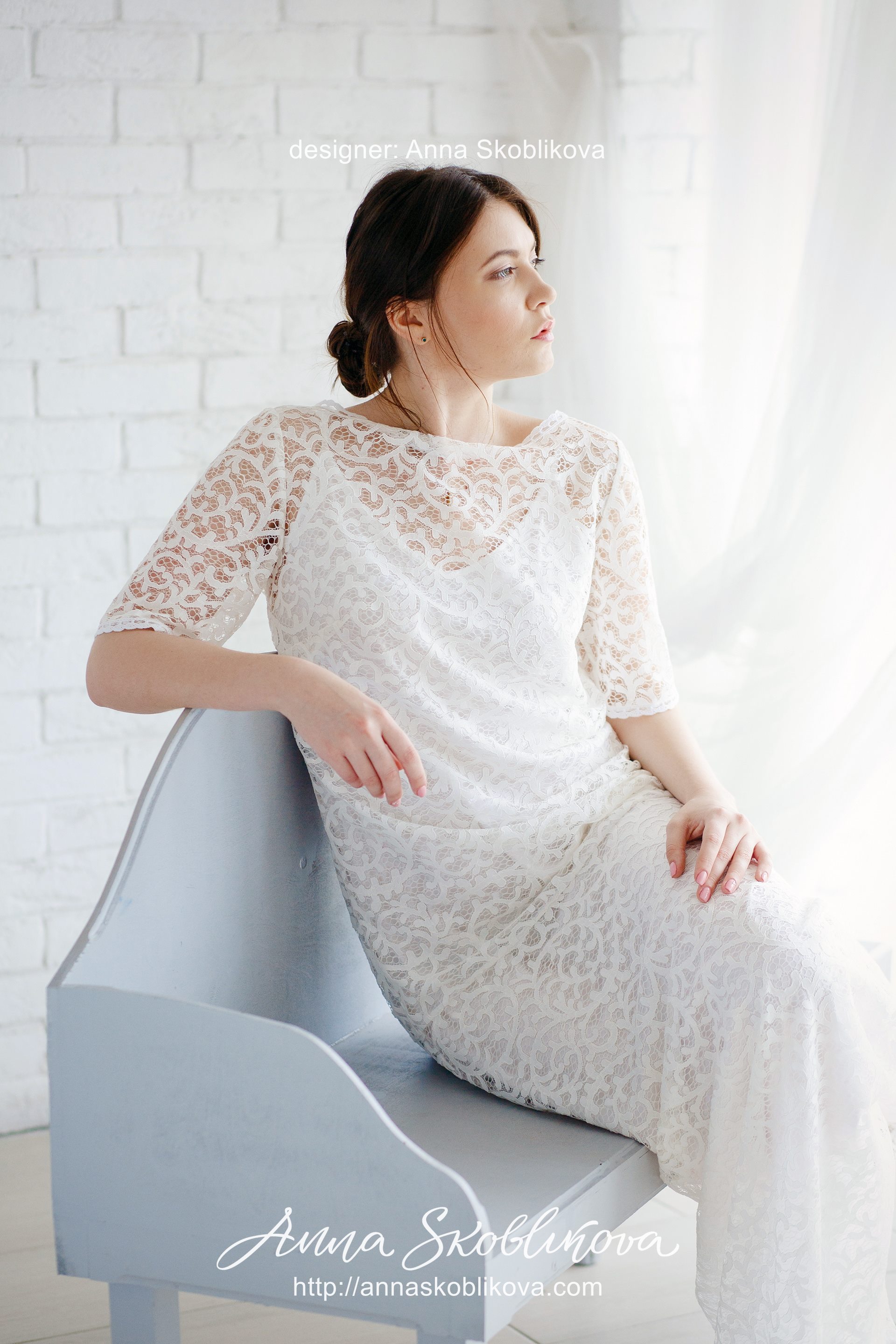 The lace upper dress is fitted and has a small flare under the knees. Sleeves are of elbow length, the back of the dress is with a round cut and lower back comes with a zipper. The fitted under dress is of natural silk with V-neck cut in front. Delicate two-piece wedding dress: the upper dress made of lace and silk under dress on straps.