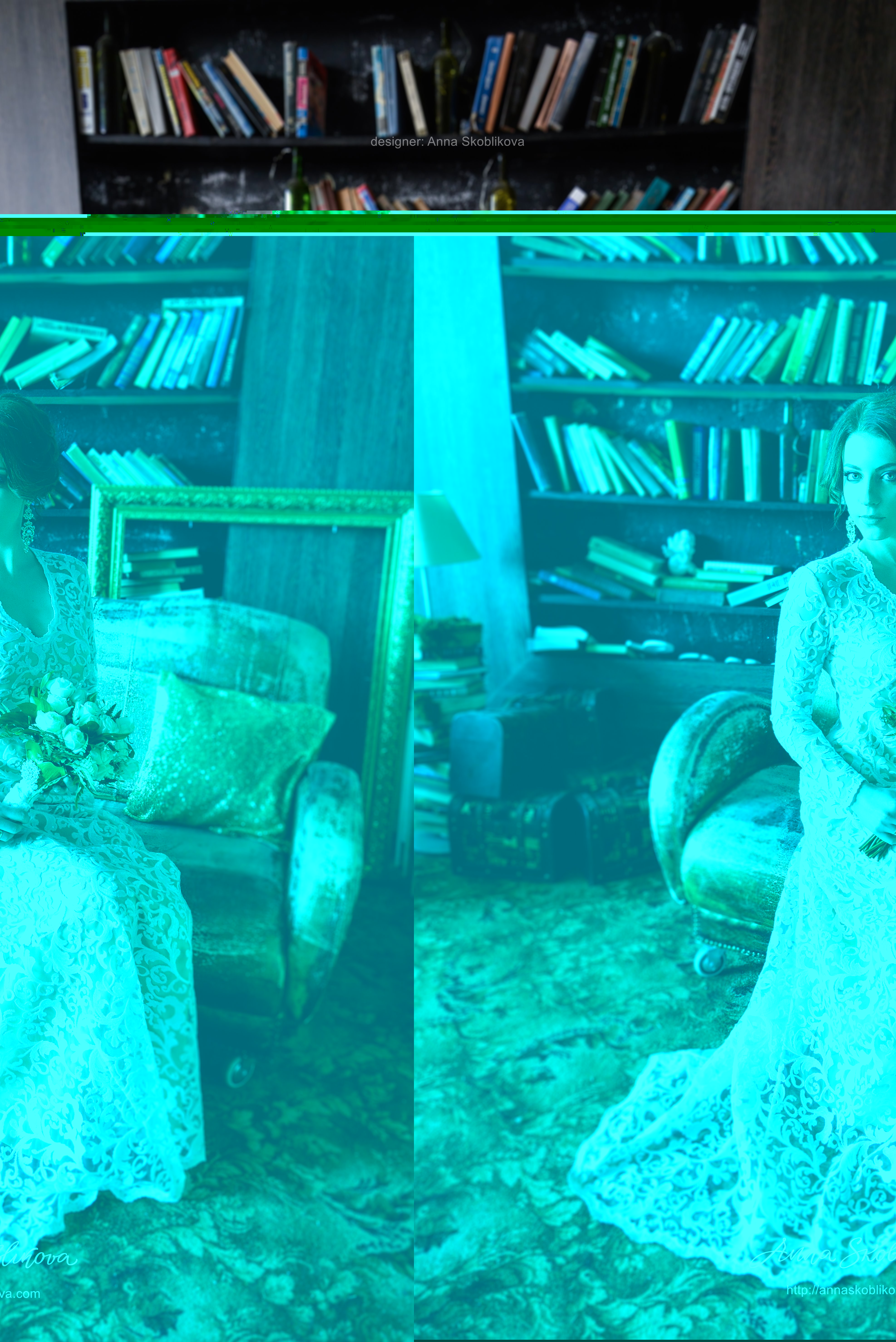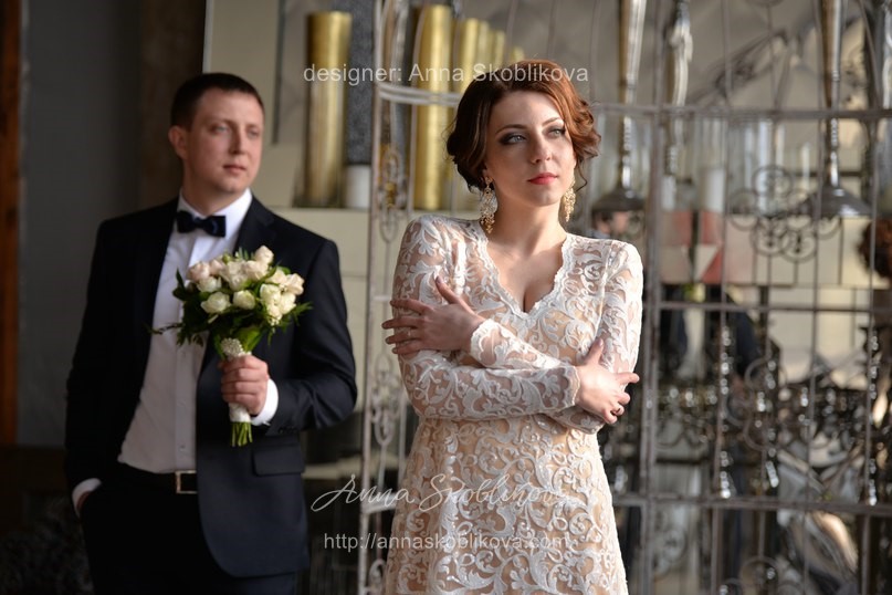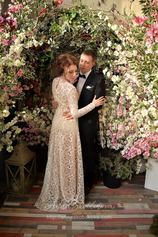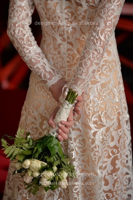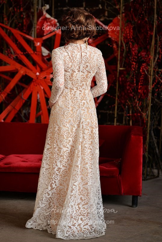 Rather modest and closed dress with long sleeves, which is perfect for autumn or winter celebrations, as well as being for the wedding ceremony.
