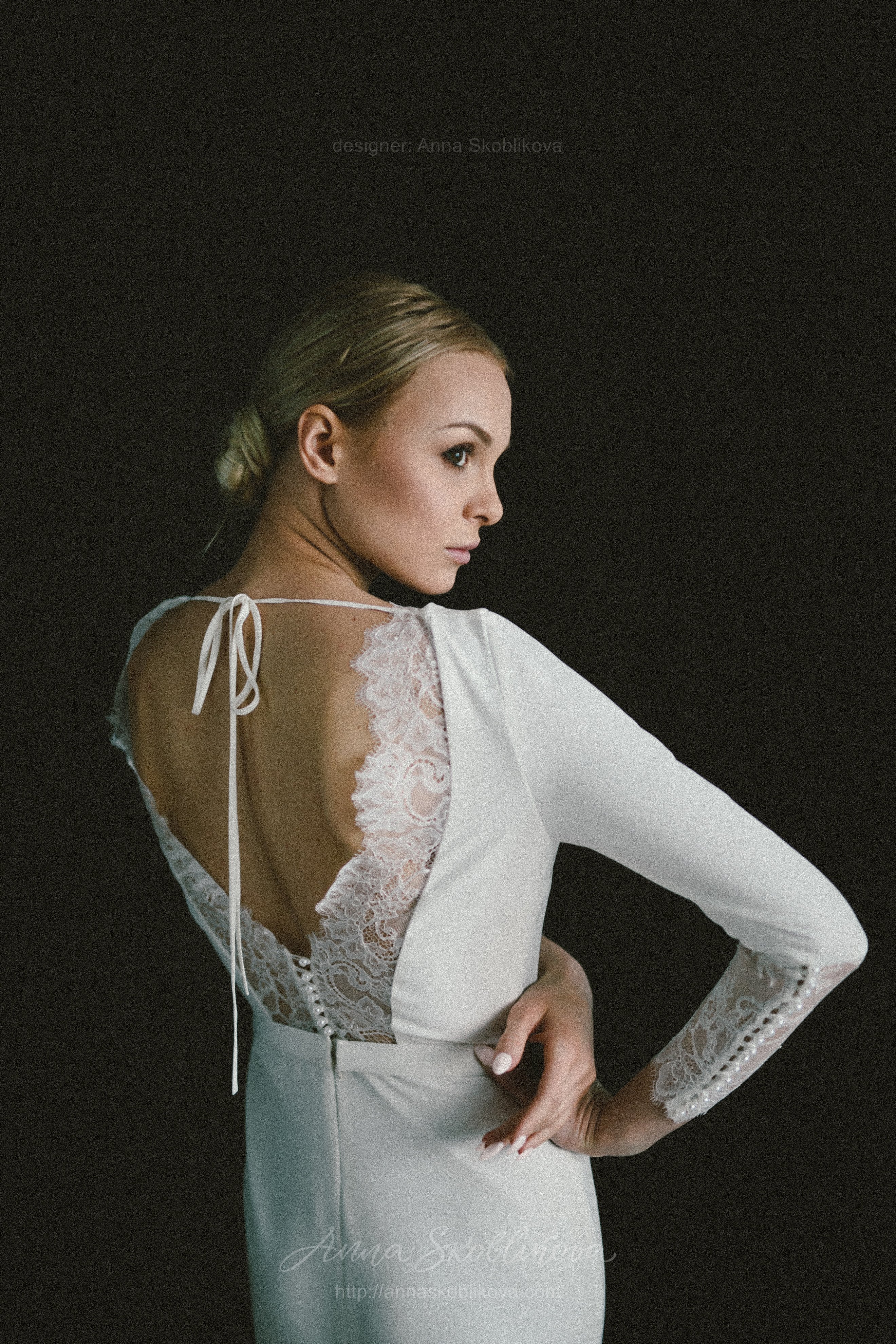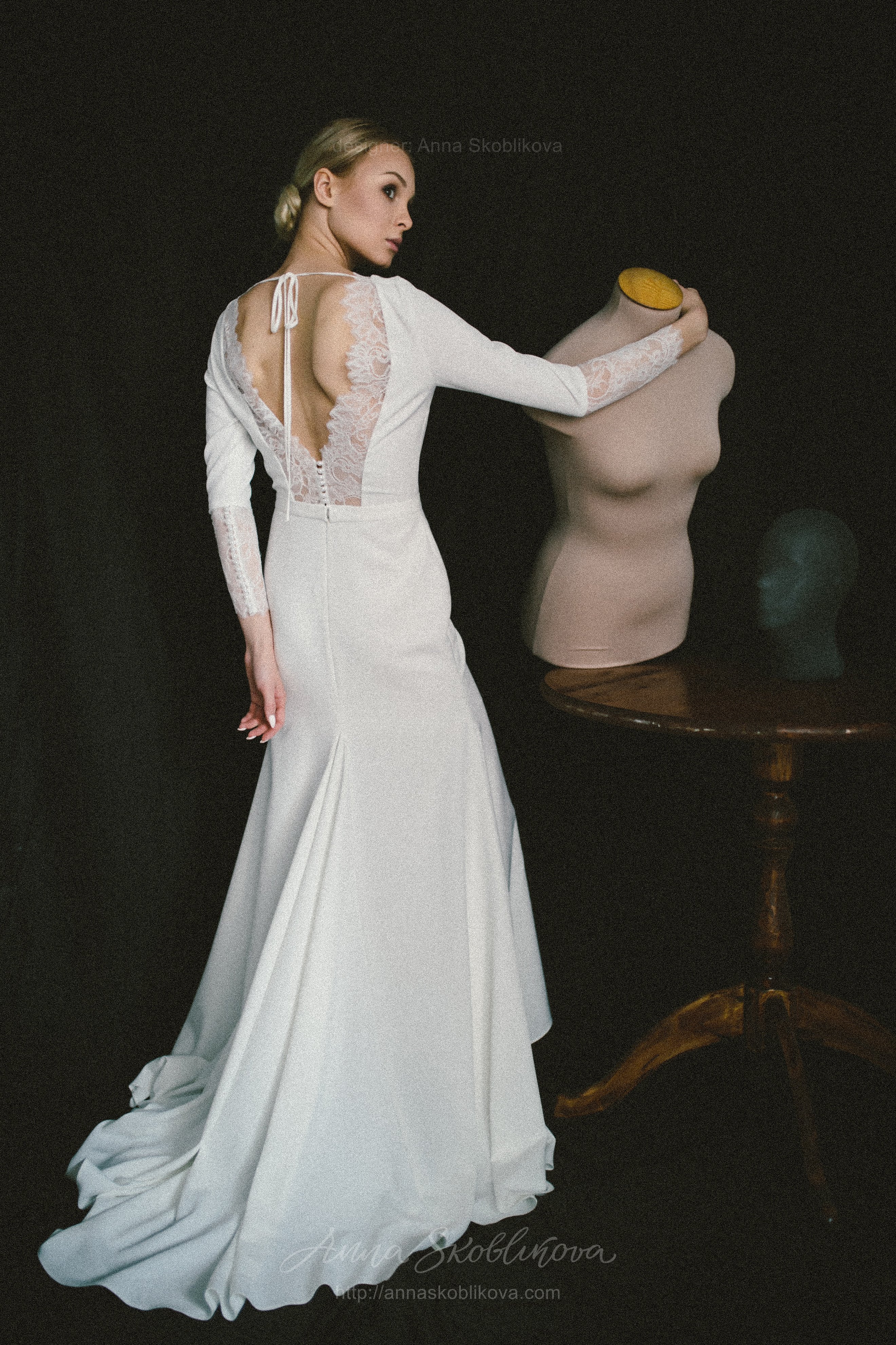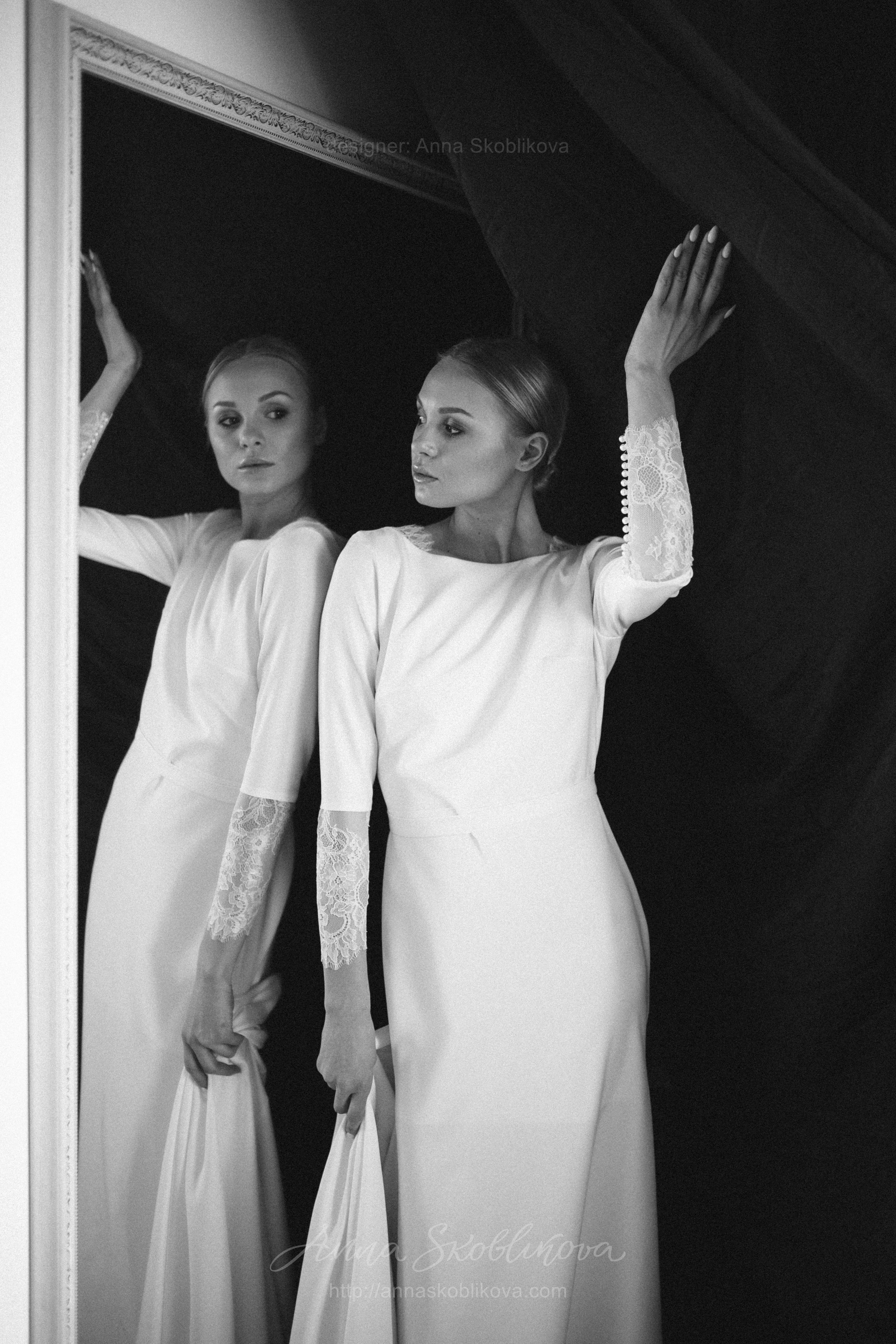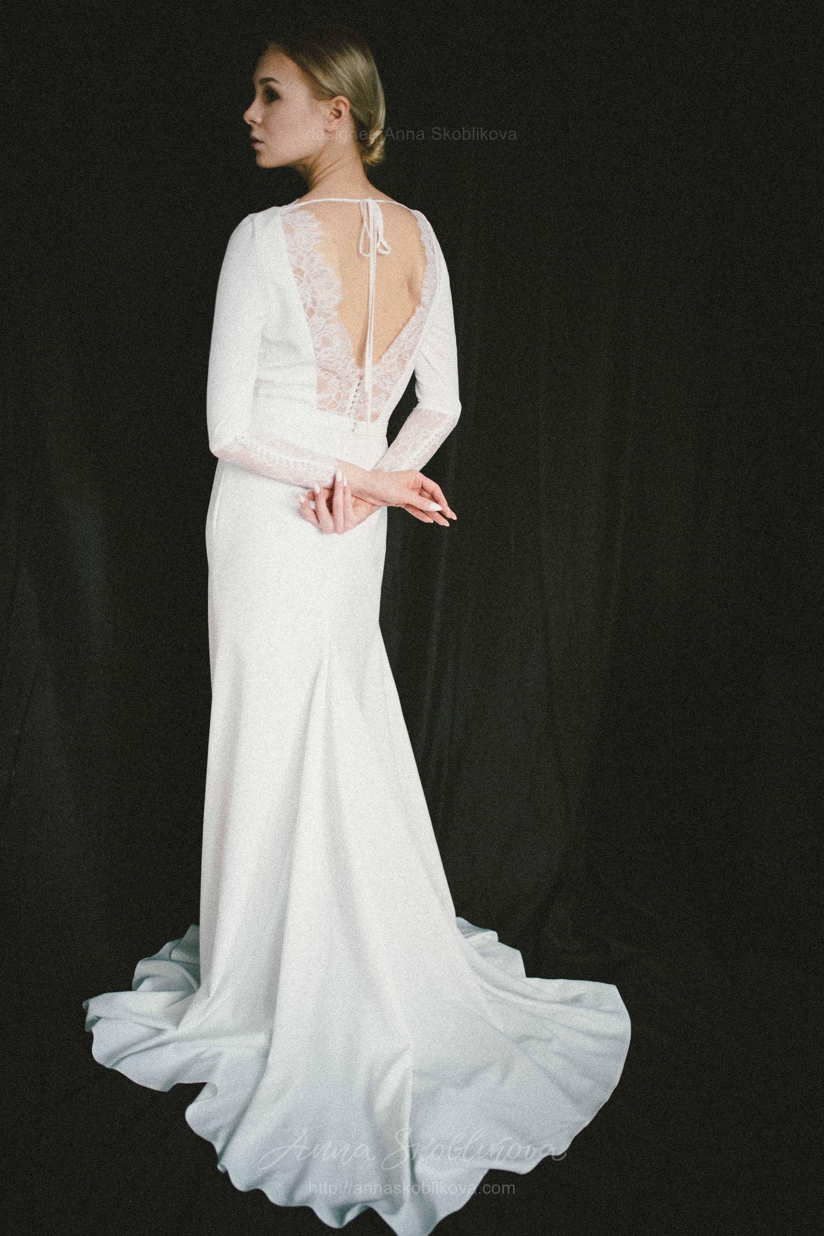 Elegant wedding dress of costume crepe and Chantilly lace. Lace trim on the back cutout and lace cuffs with buttons underline the dress`s nobility and elegance. The lower part is in the shape of a mermaid with a gusset behind. Natural lining inside.