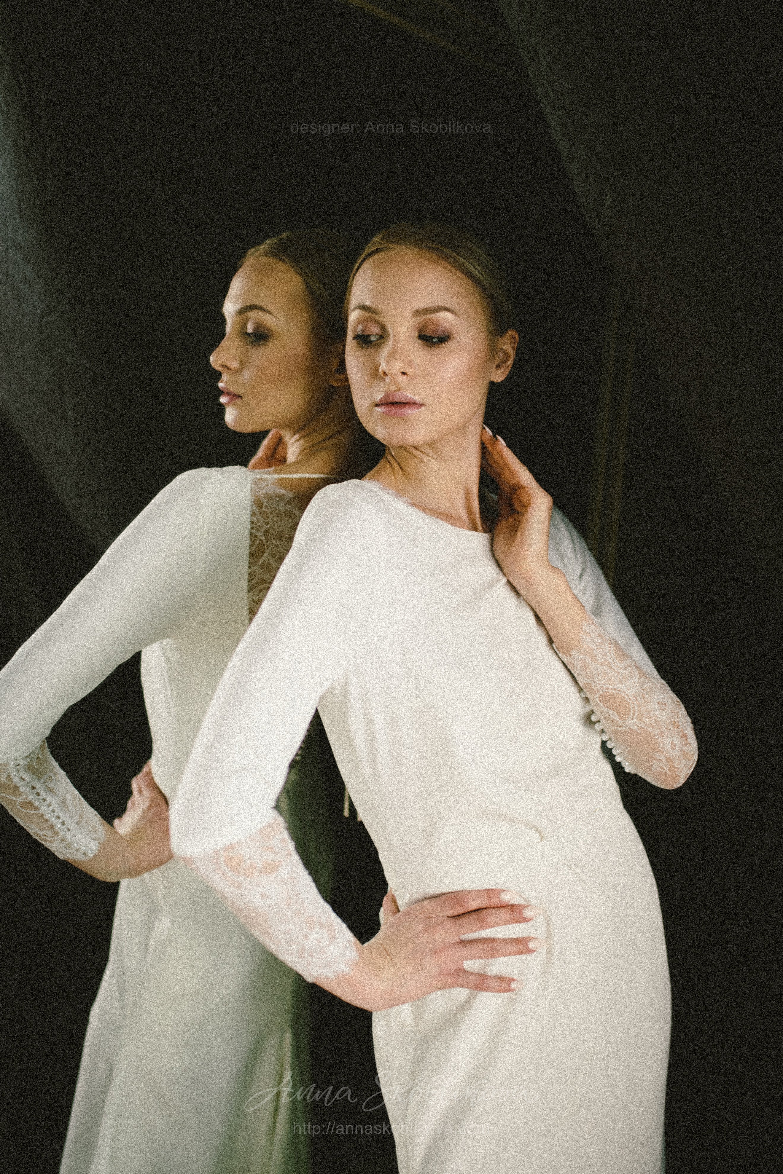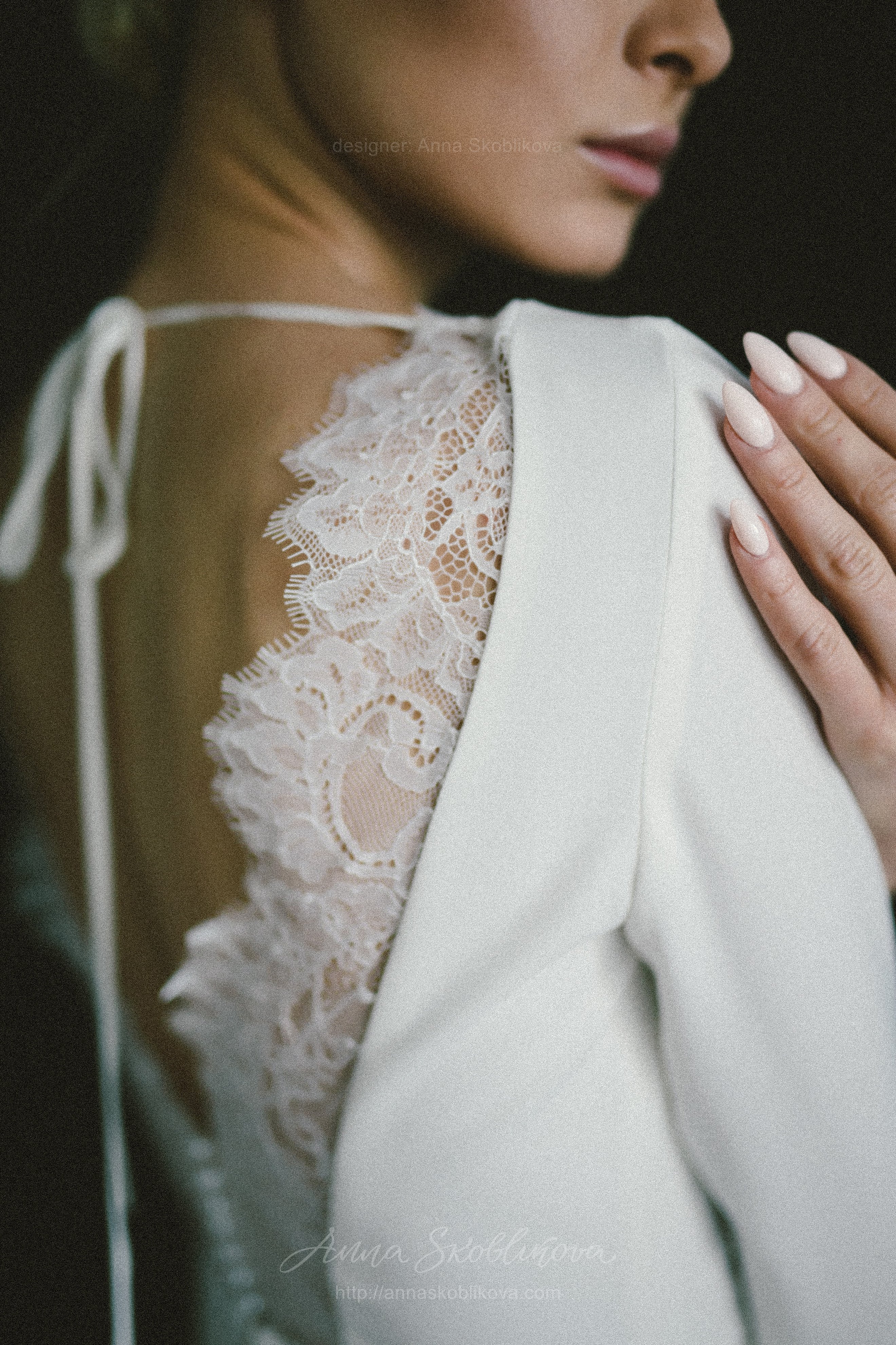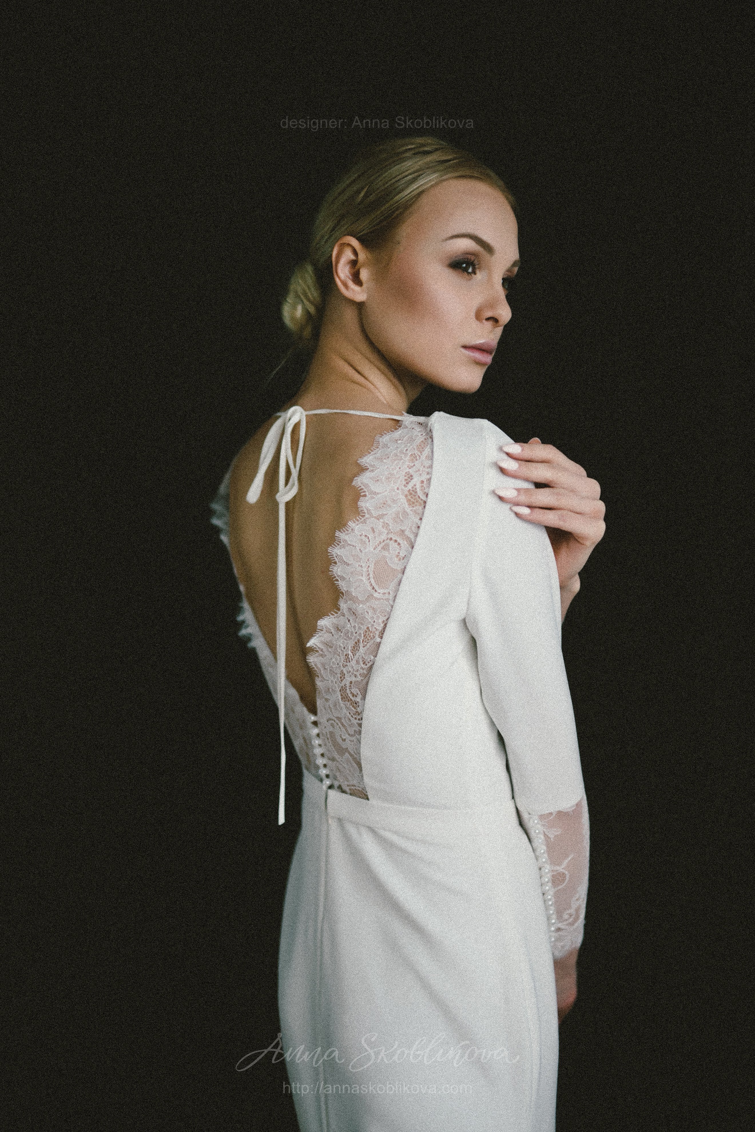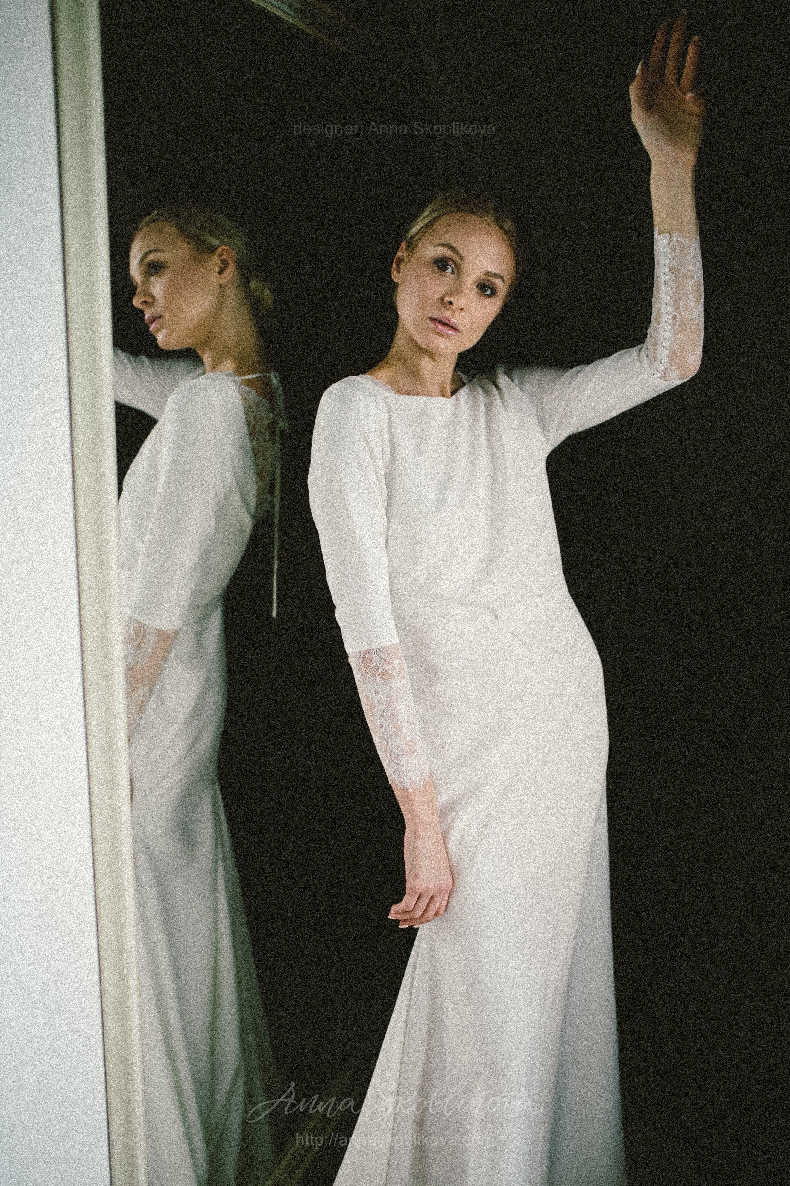 Elegant wedding dress of costume crepe and Chantilly lace. Lace trim on the back cutout and lace cuffs with buttons underline the dress`s nobility and elegance. The lower part is in the shape of a mermaid with a gusset behind. Natural lining inside.