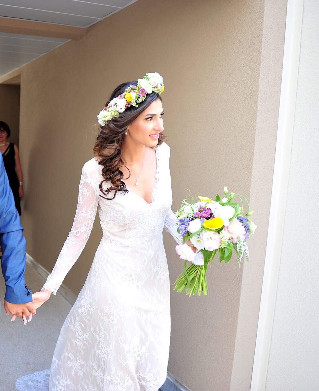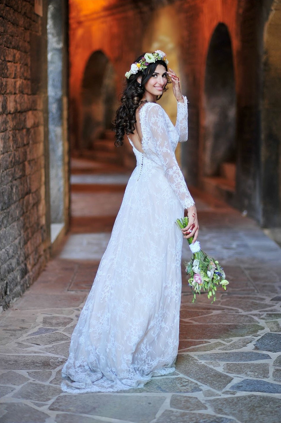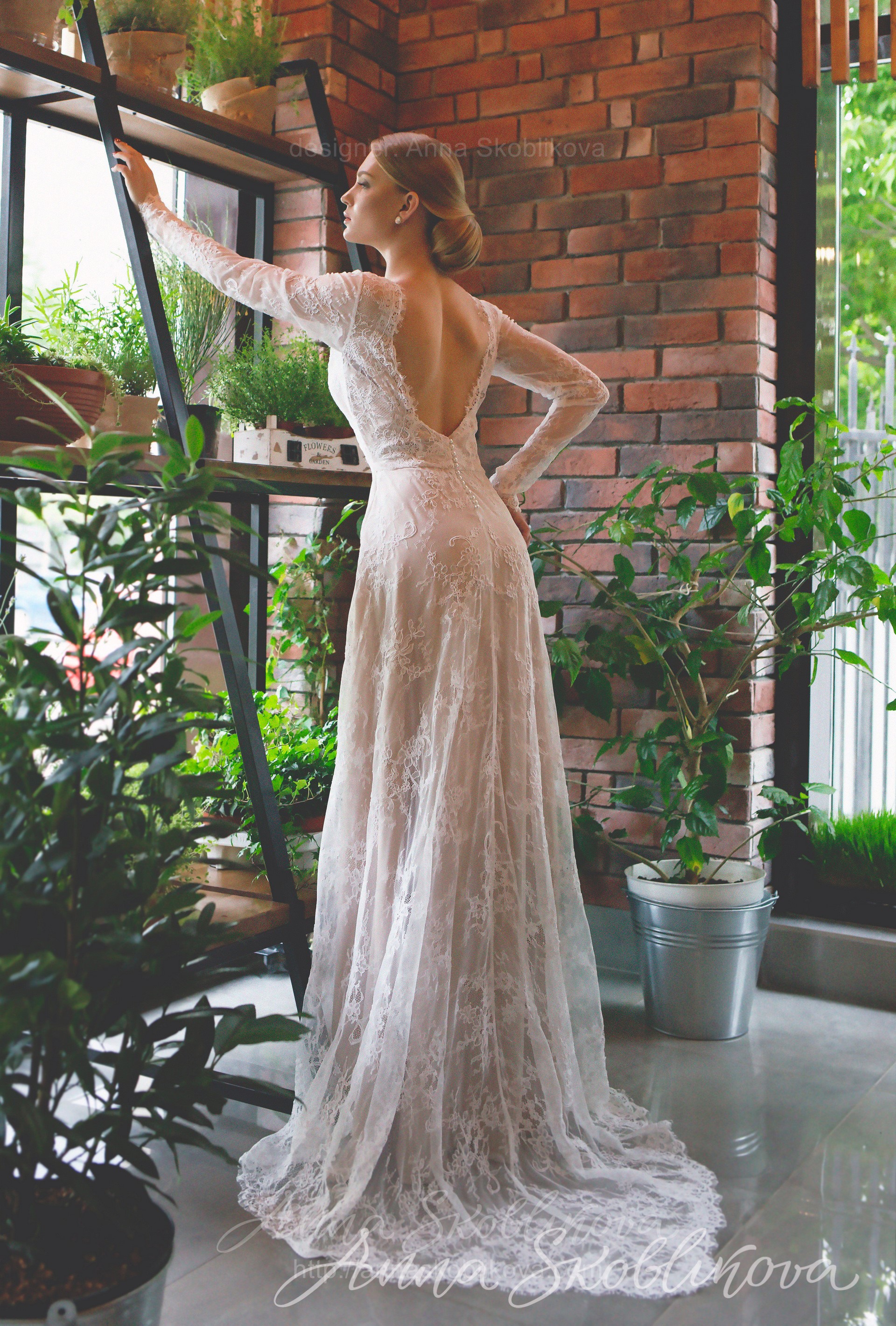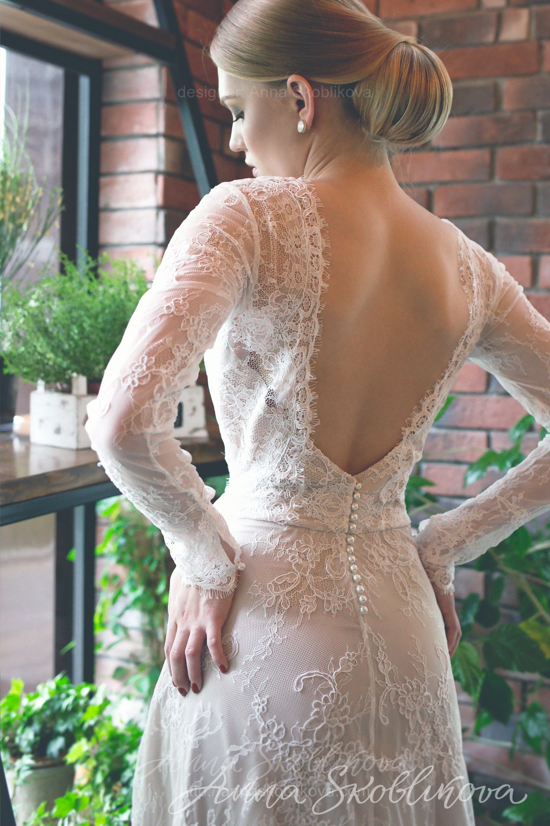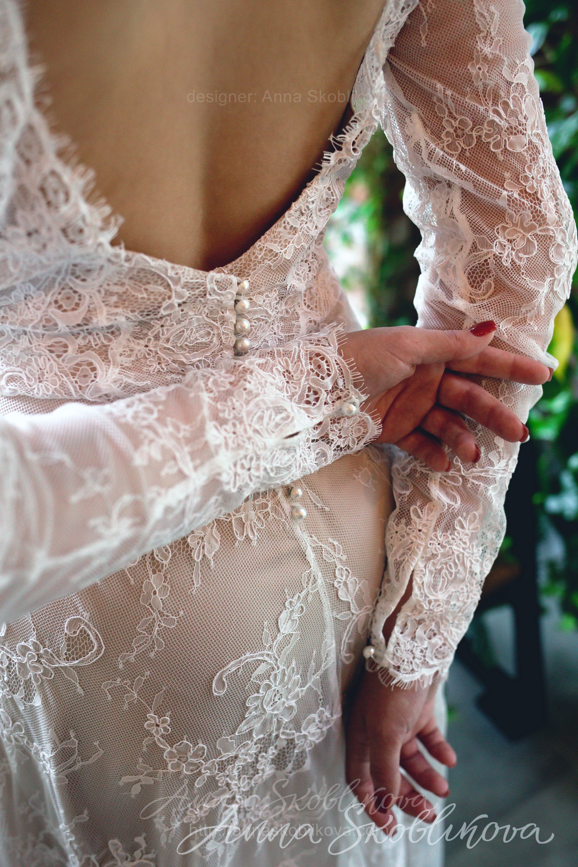 Ivory wedding dress with v-neck cut and open back. Delicate and elegant, made of Chantilly lace.