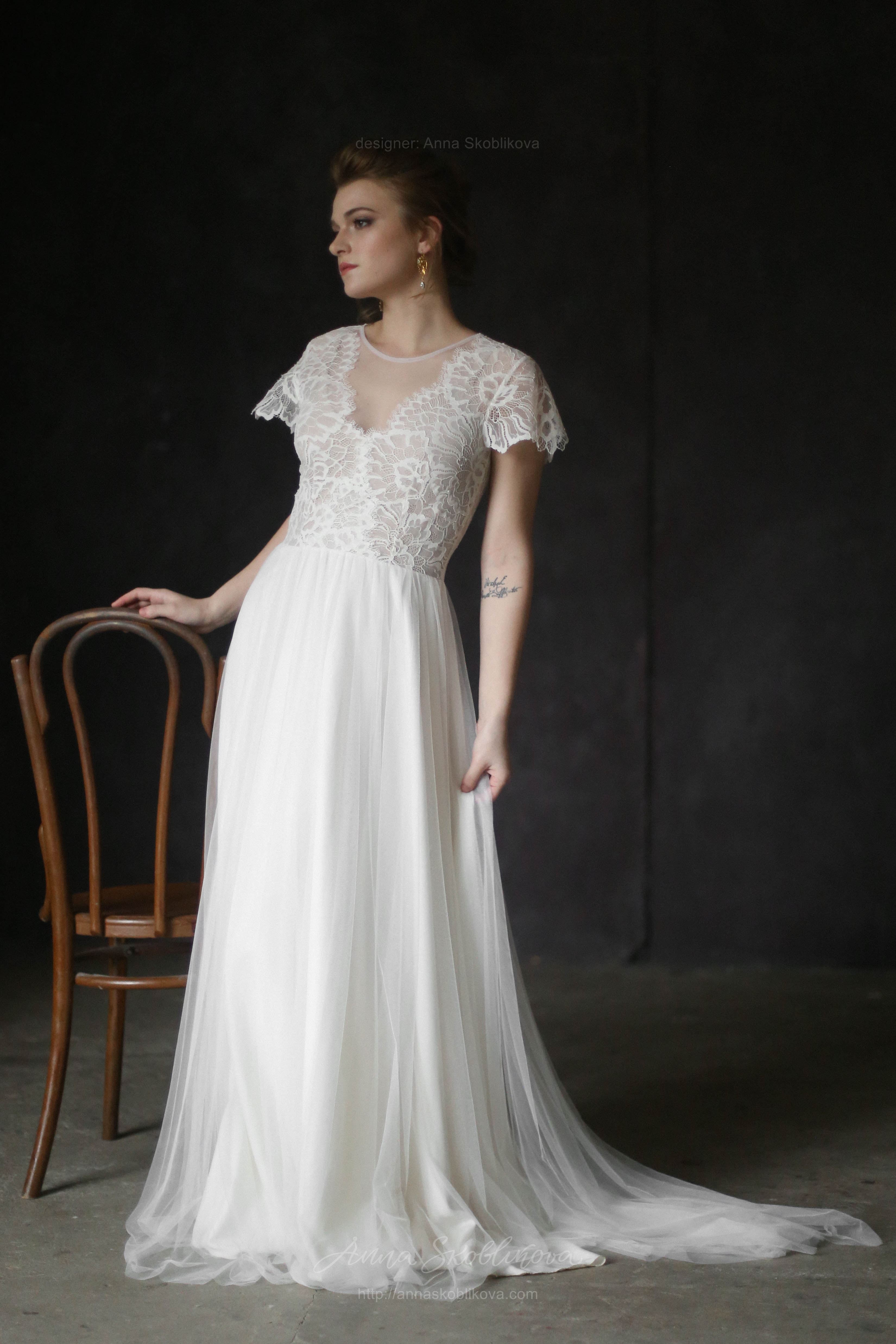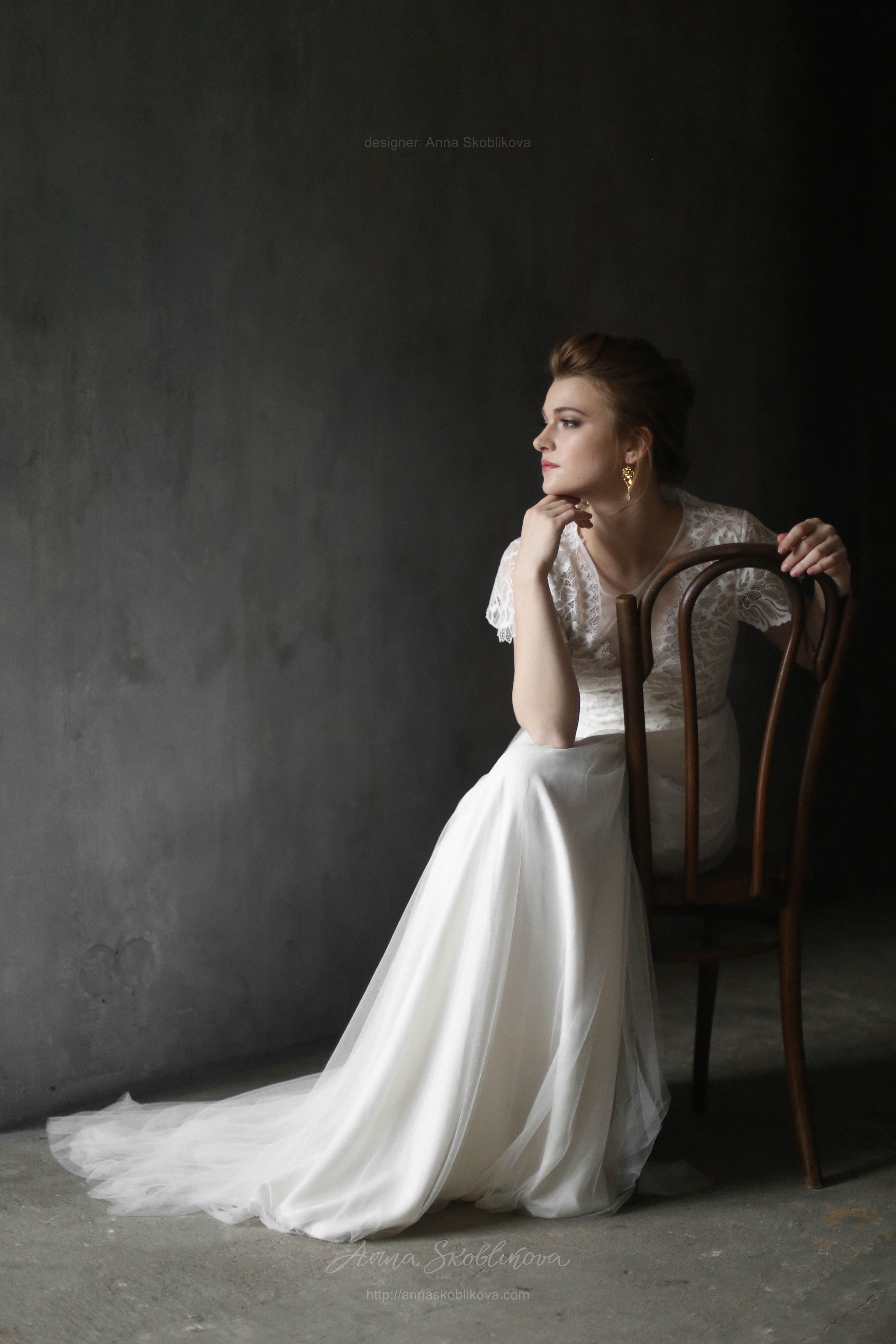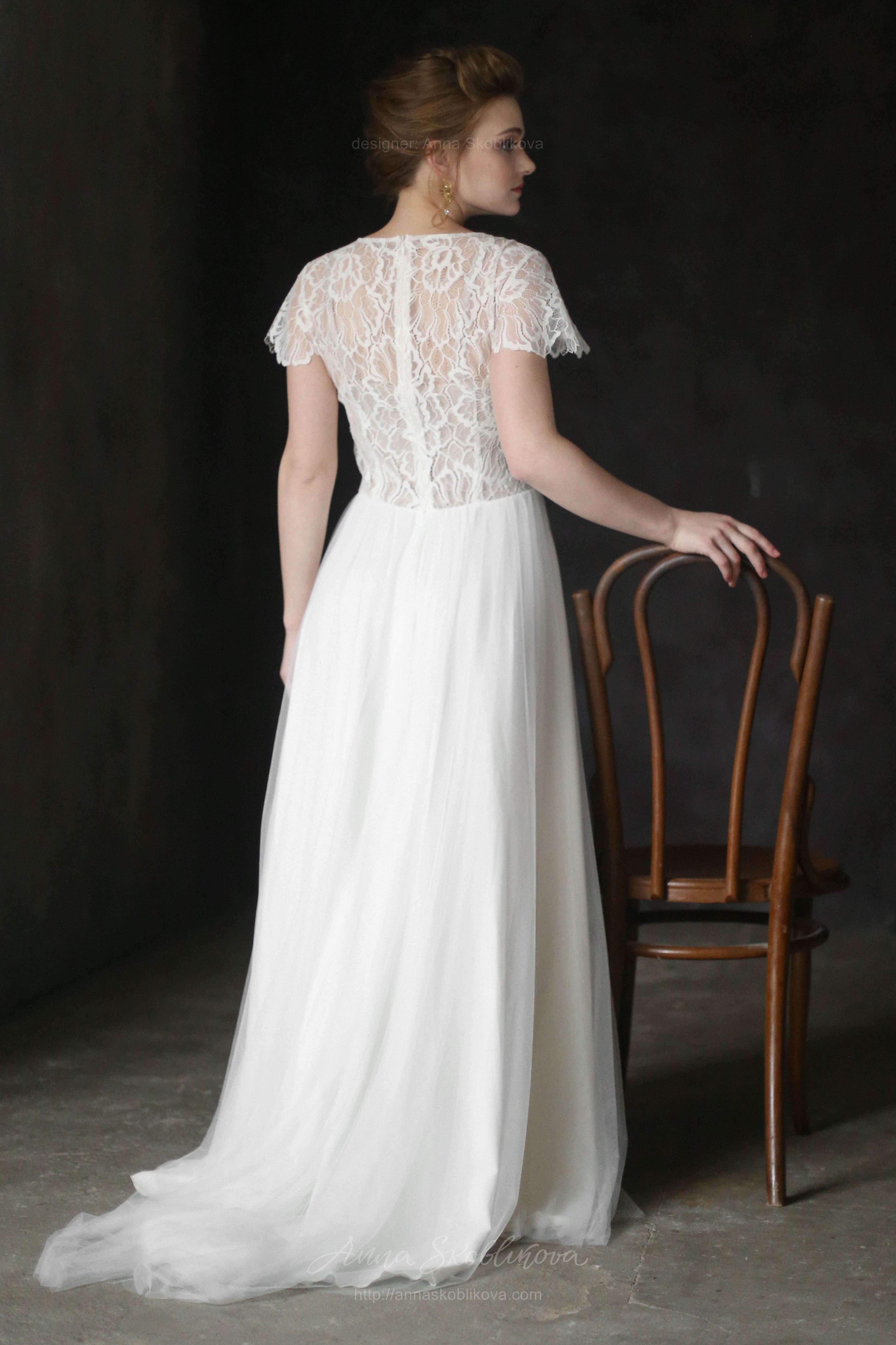 Lace classic wedding dress with delicate Italian grid. Goodly lace top of  ecru color with a modest neckline and holding net in the middle. Lace back with zip. The skirt has 2 layers: the bottom layer is of silk, the top layer – of Italian grid. Dress has a small train.