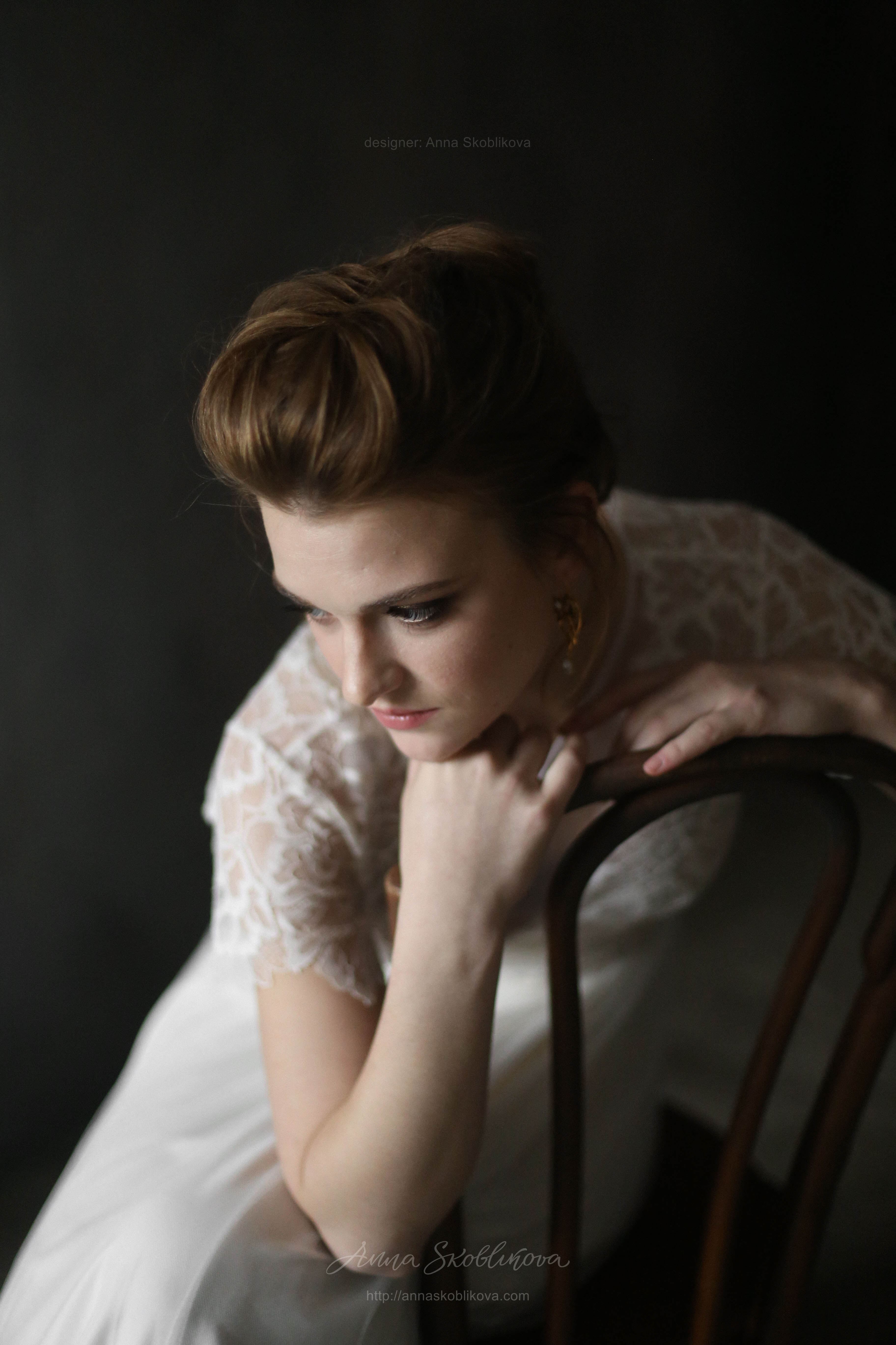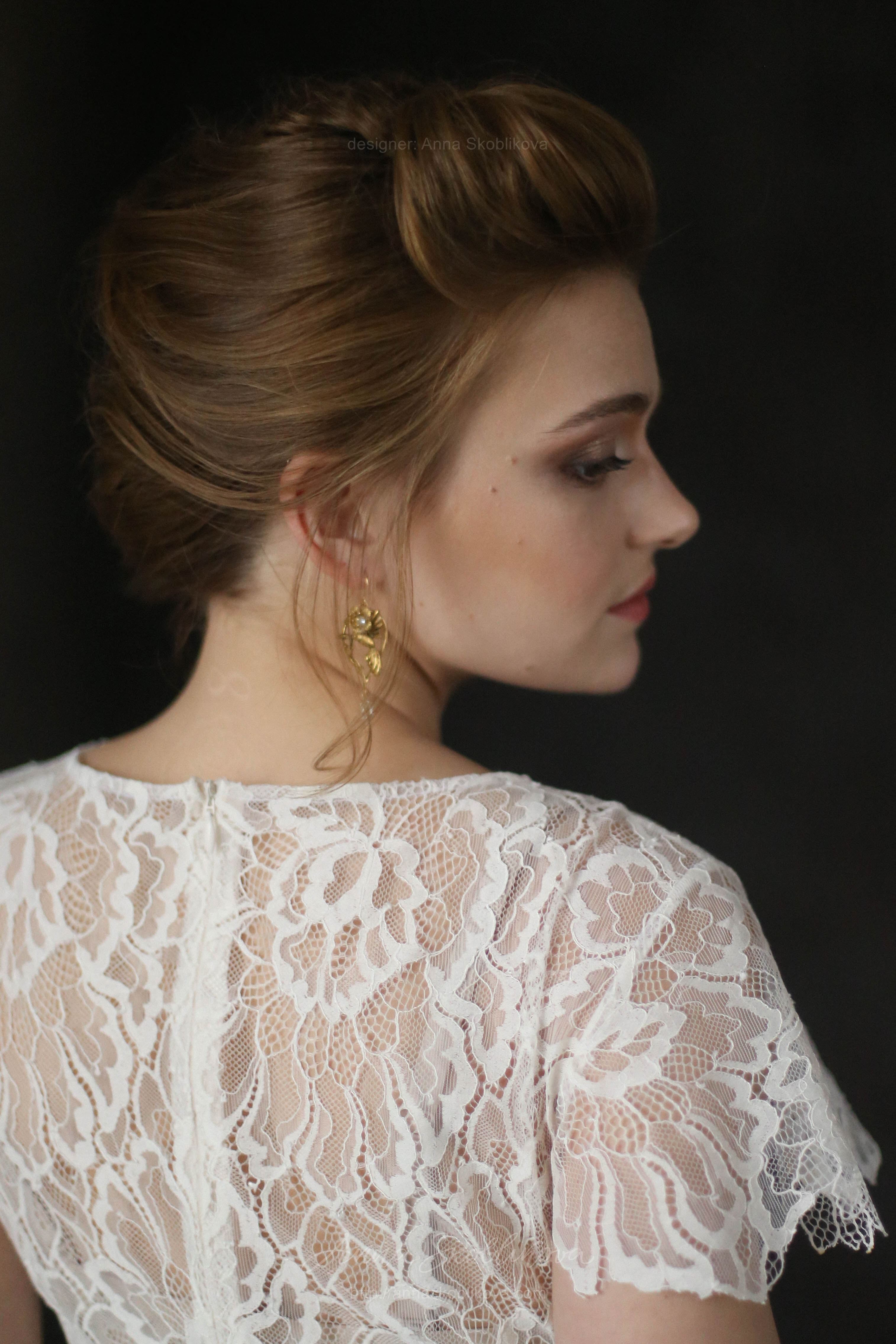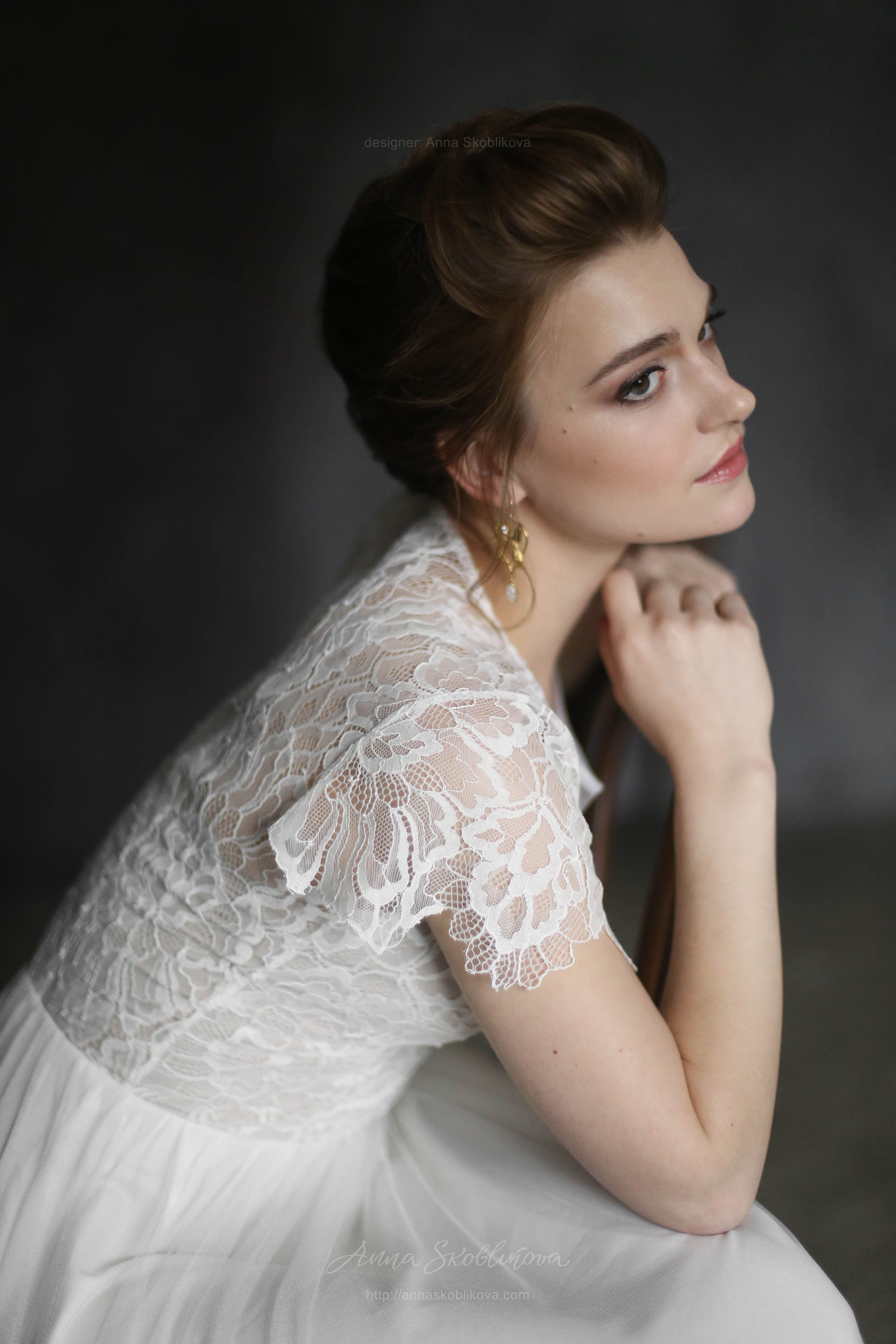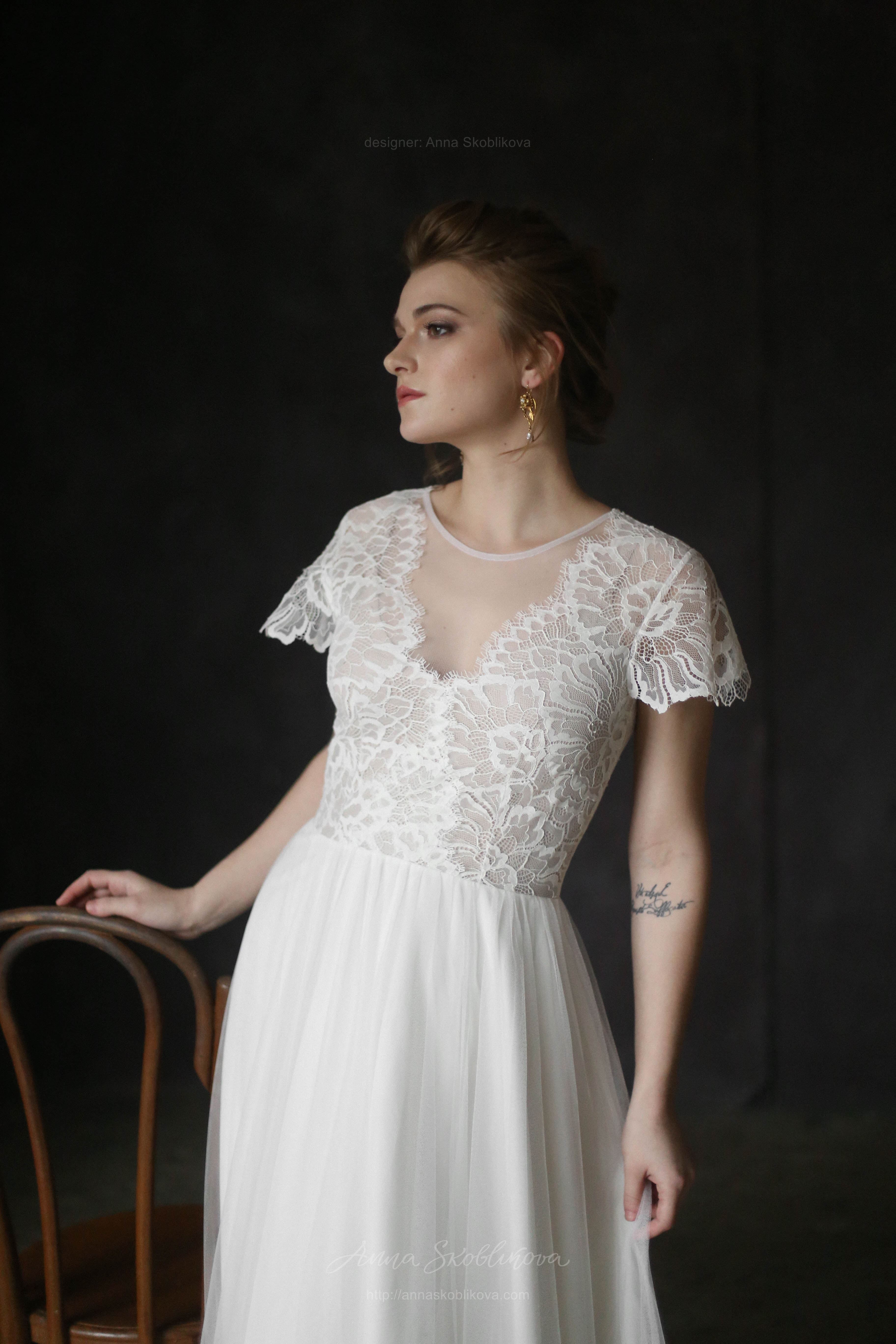 Lace classic wedding dress with delicate Italian grid. Goodly lace top of  ecru color with a modest neckline and holding net in the middle. Lace back with zip. The skirt has 2 layers: the bottom layer is of silk, the top layer – of Italian grid. Dress has a small train.