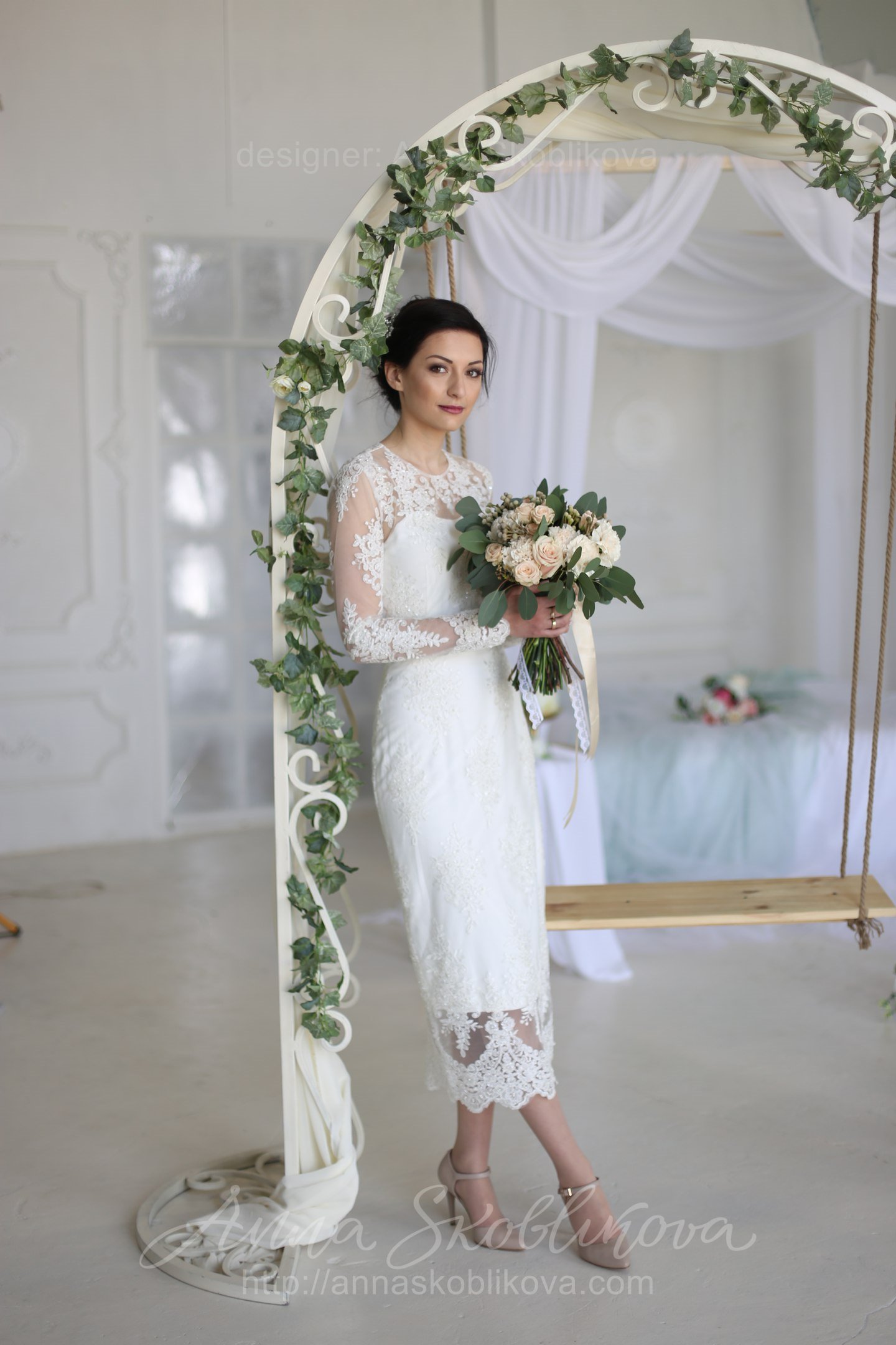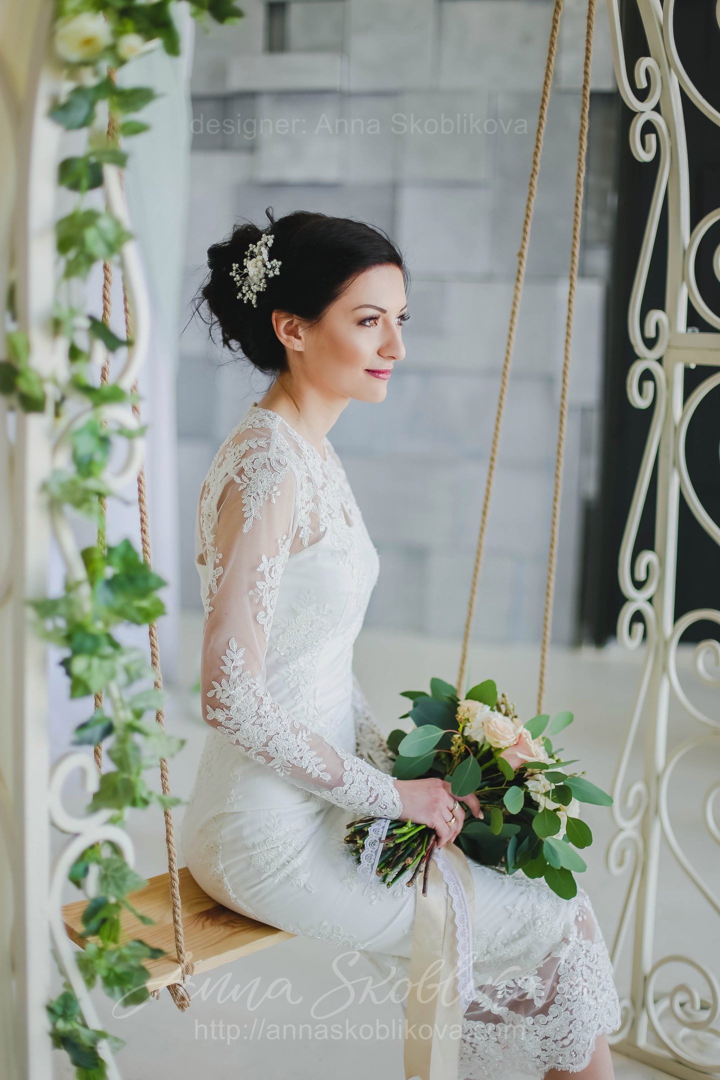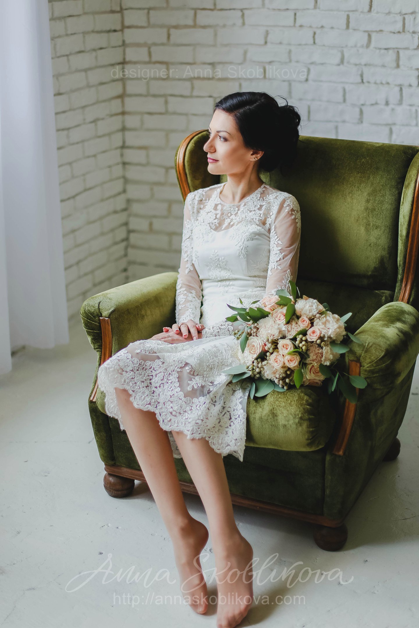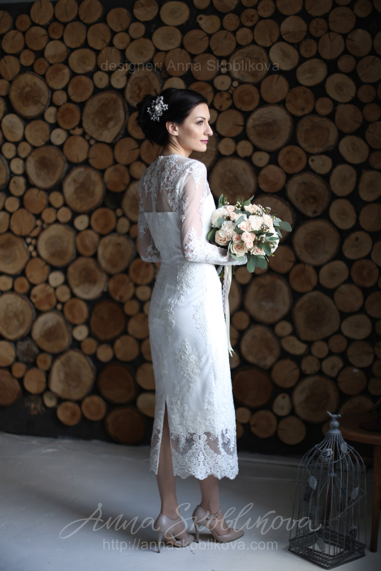 Laconic lace embroidered wedding gown. It has strict lines and looks very feminine at the same time. Sheath gown below the knees will give best fit to a slim girl with a good taste.
