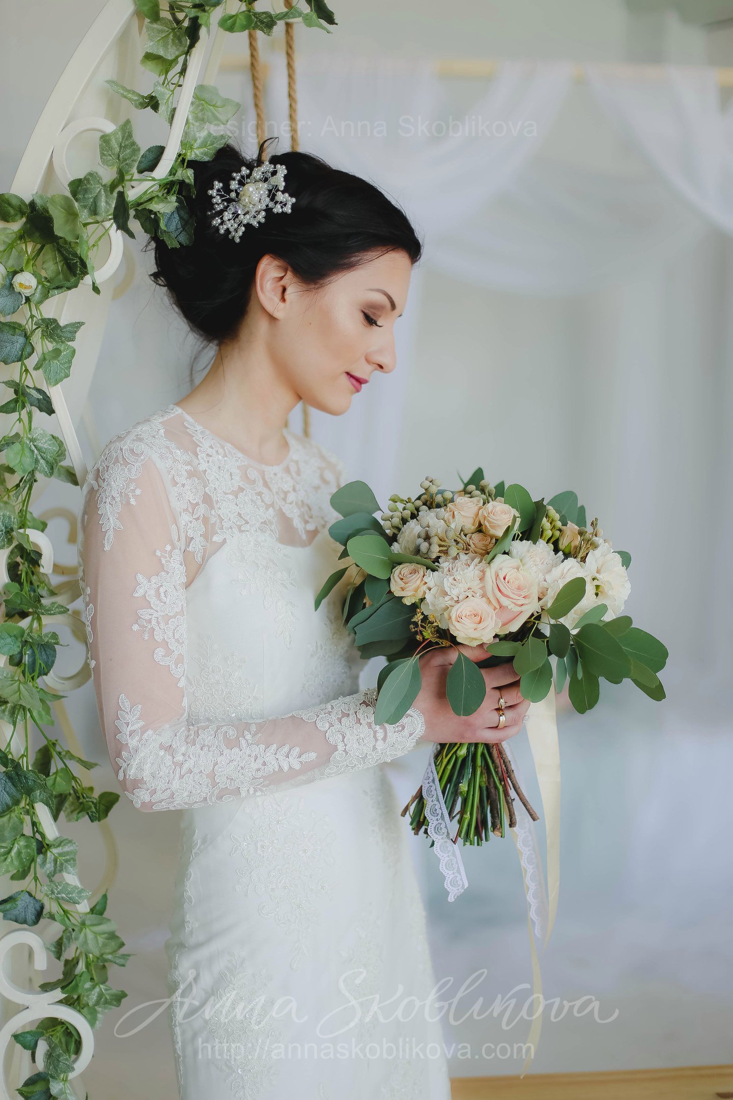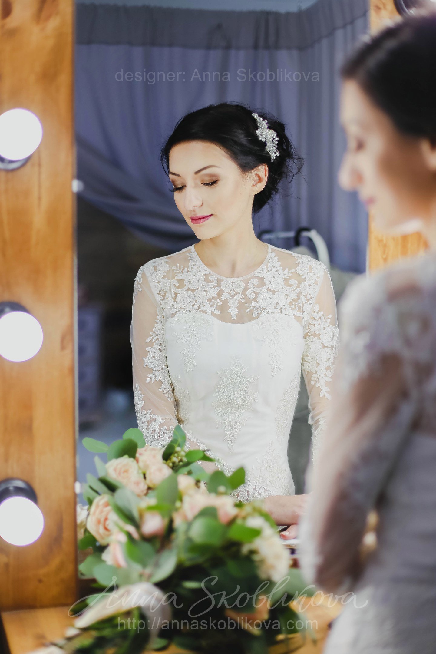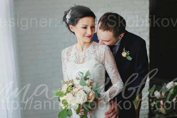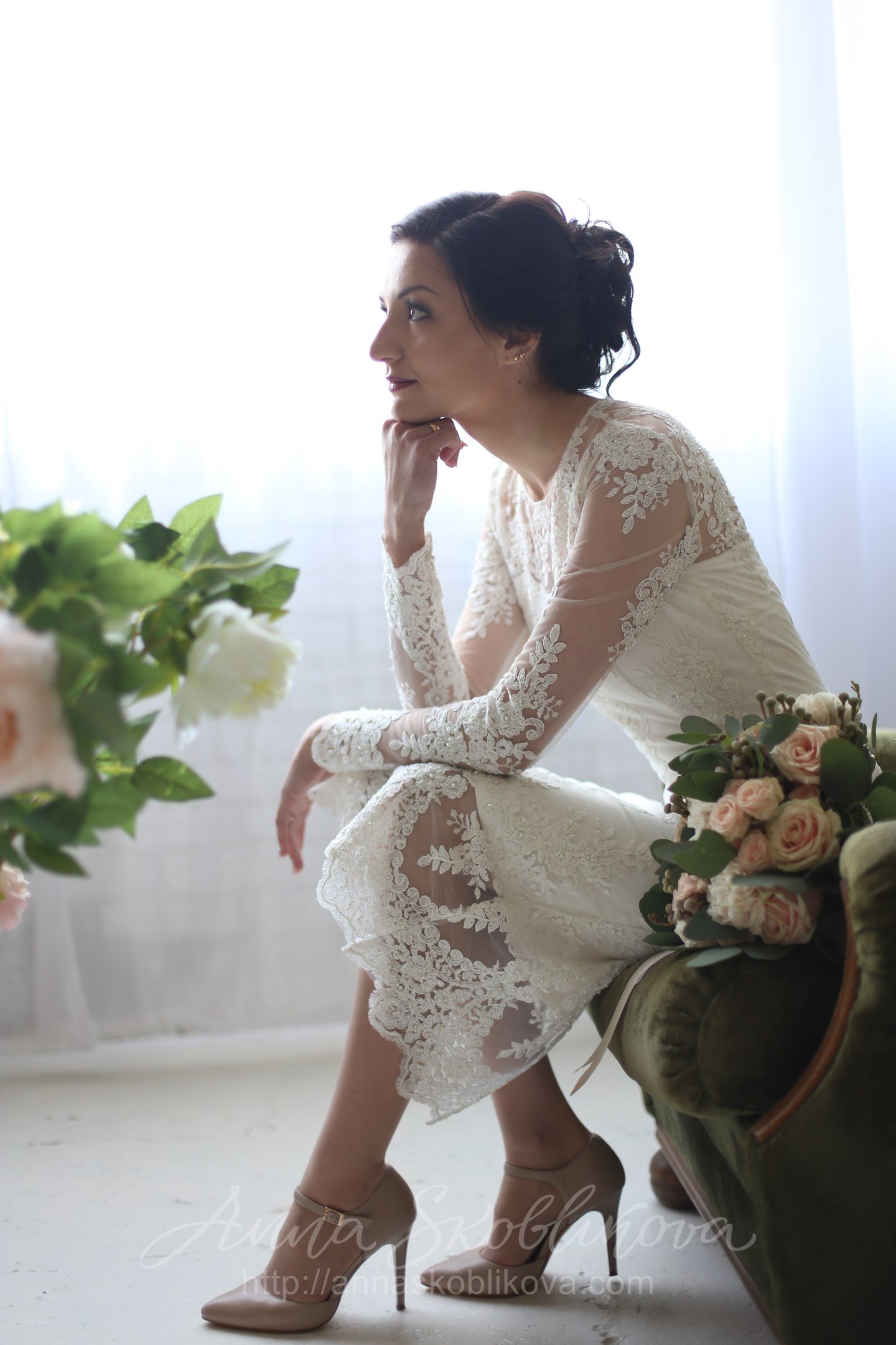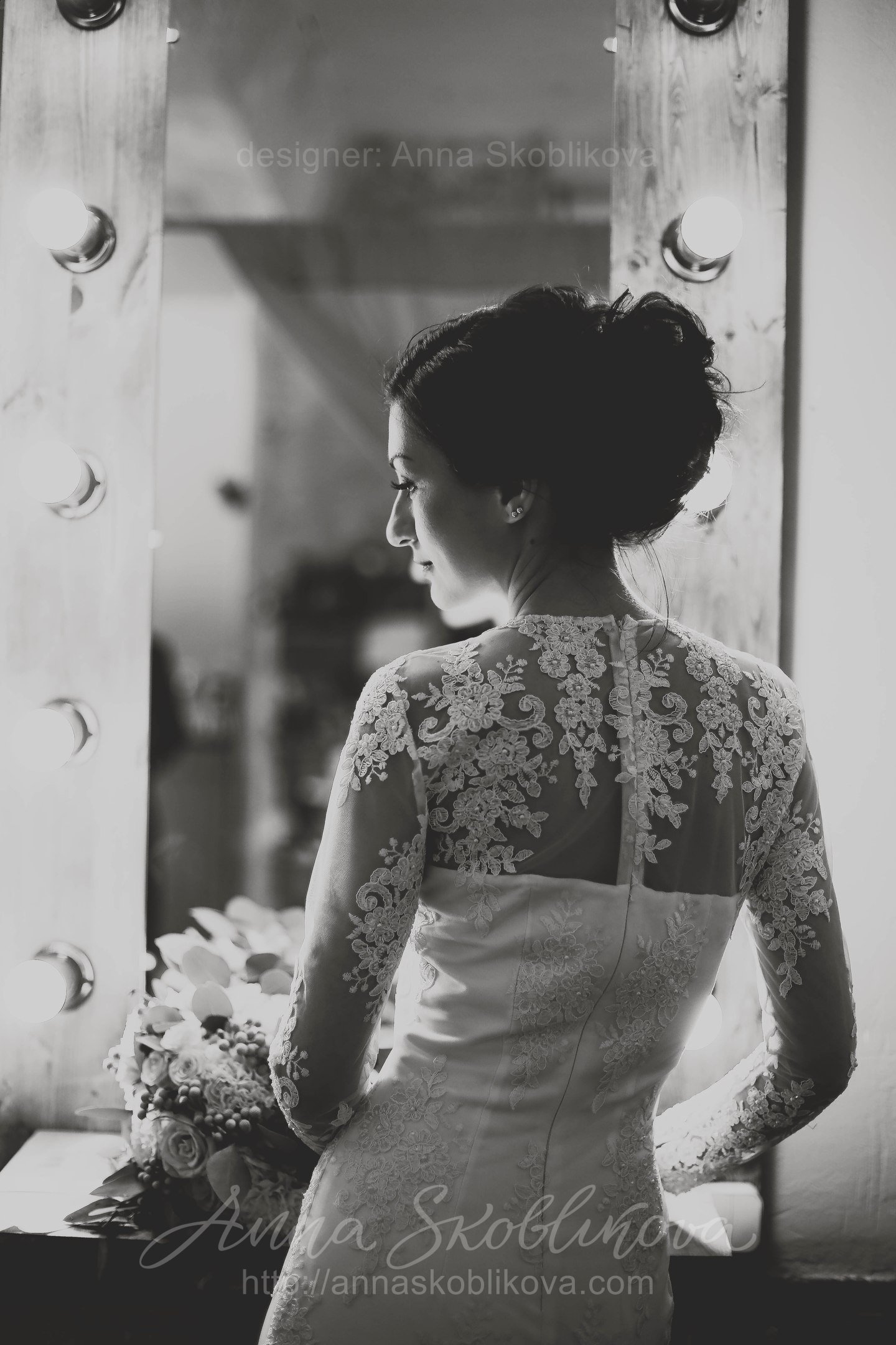 Laconic lace embroidered wedding gown. It has strict lines and looks very feminine at the same time. Sheath gown below the knees will give best fit to a slim girl with a good taste.