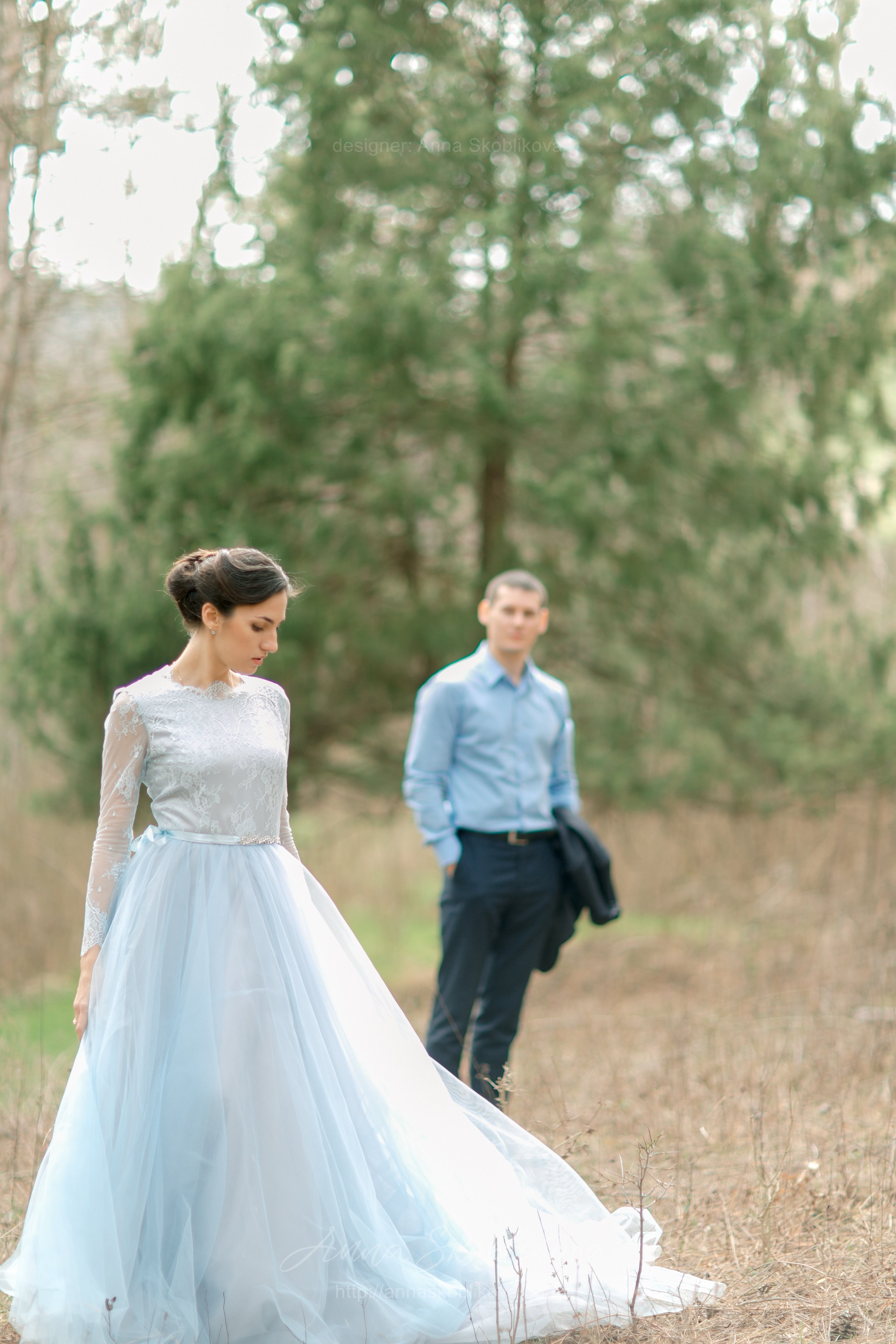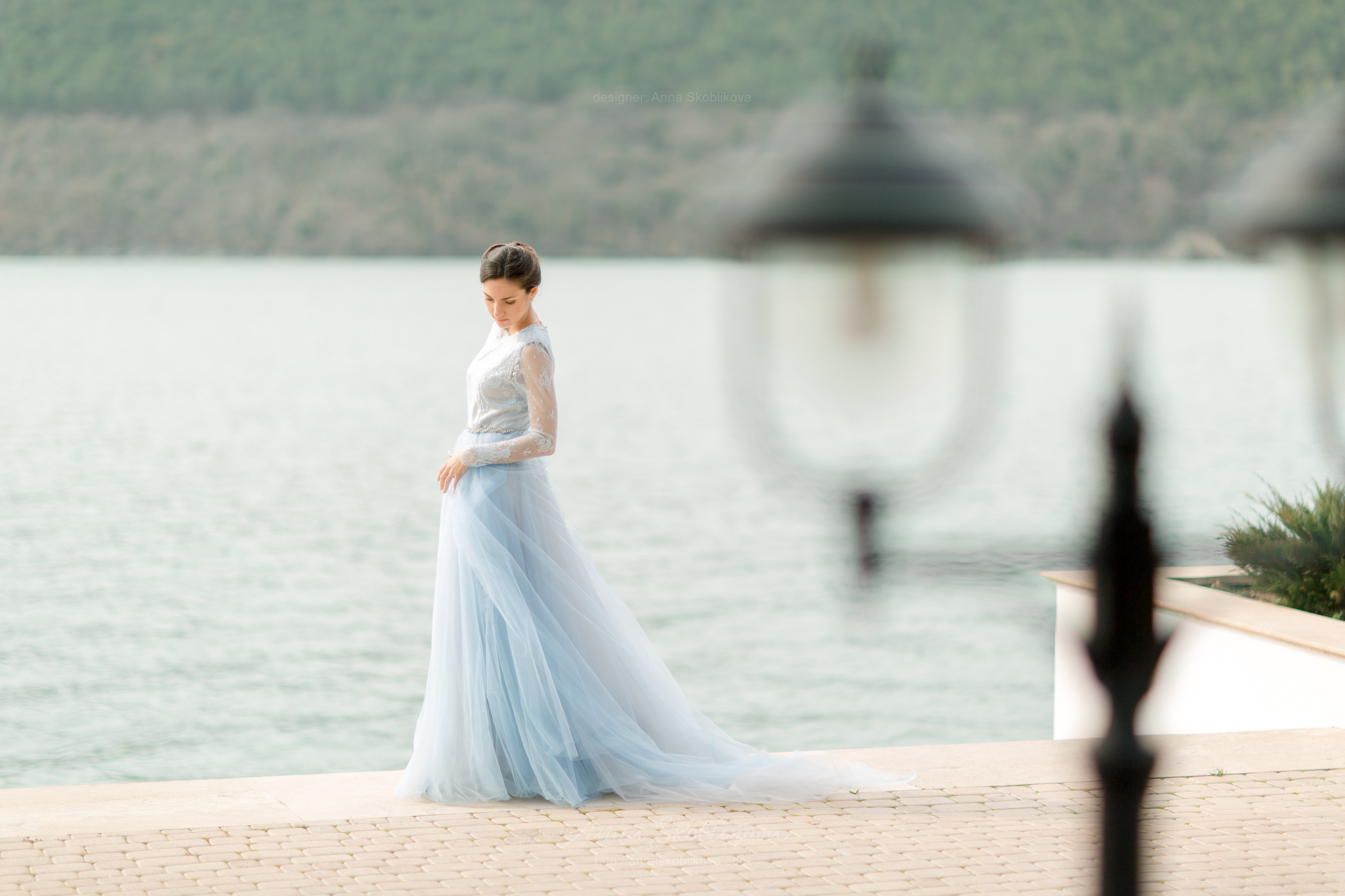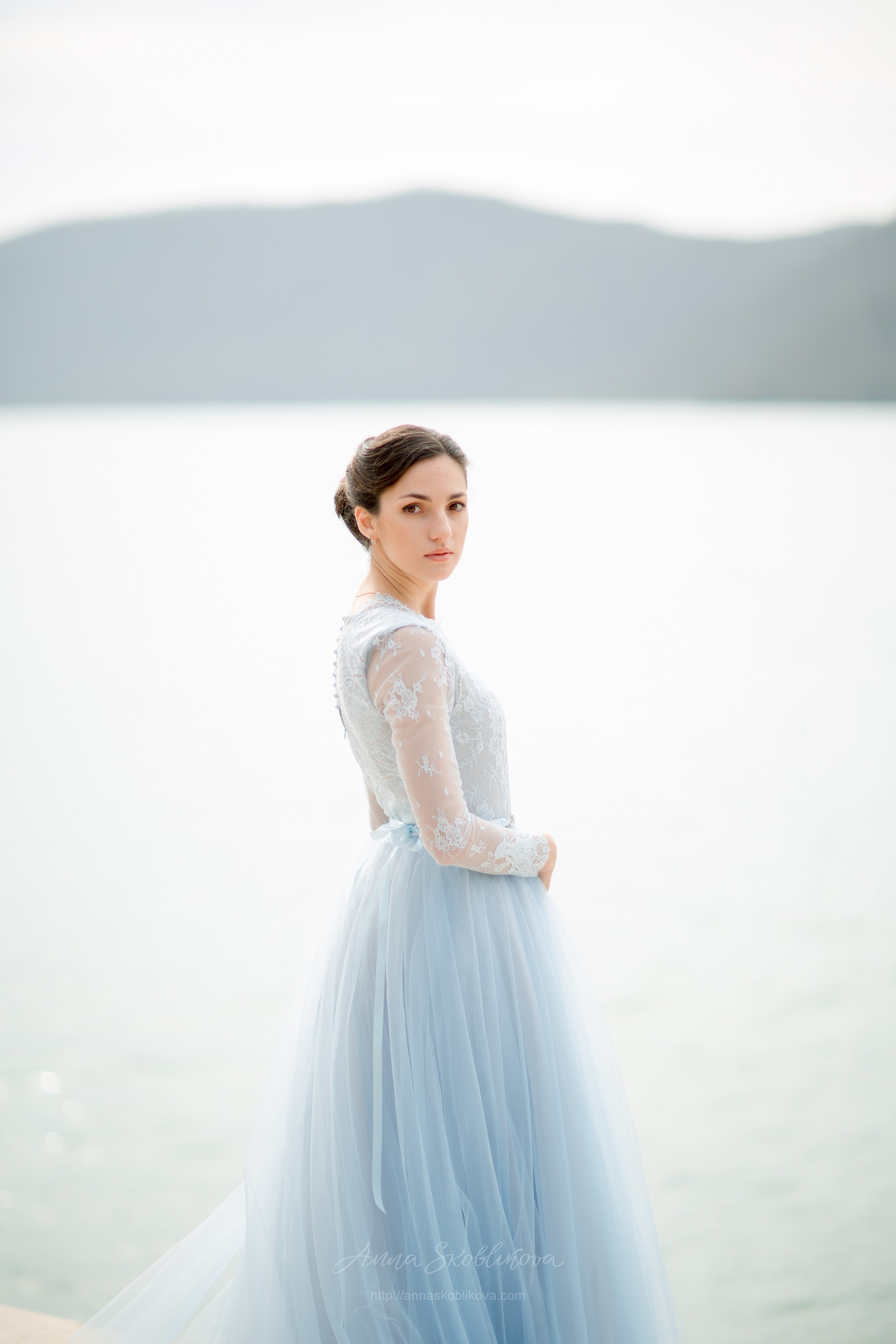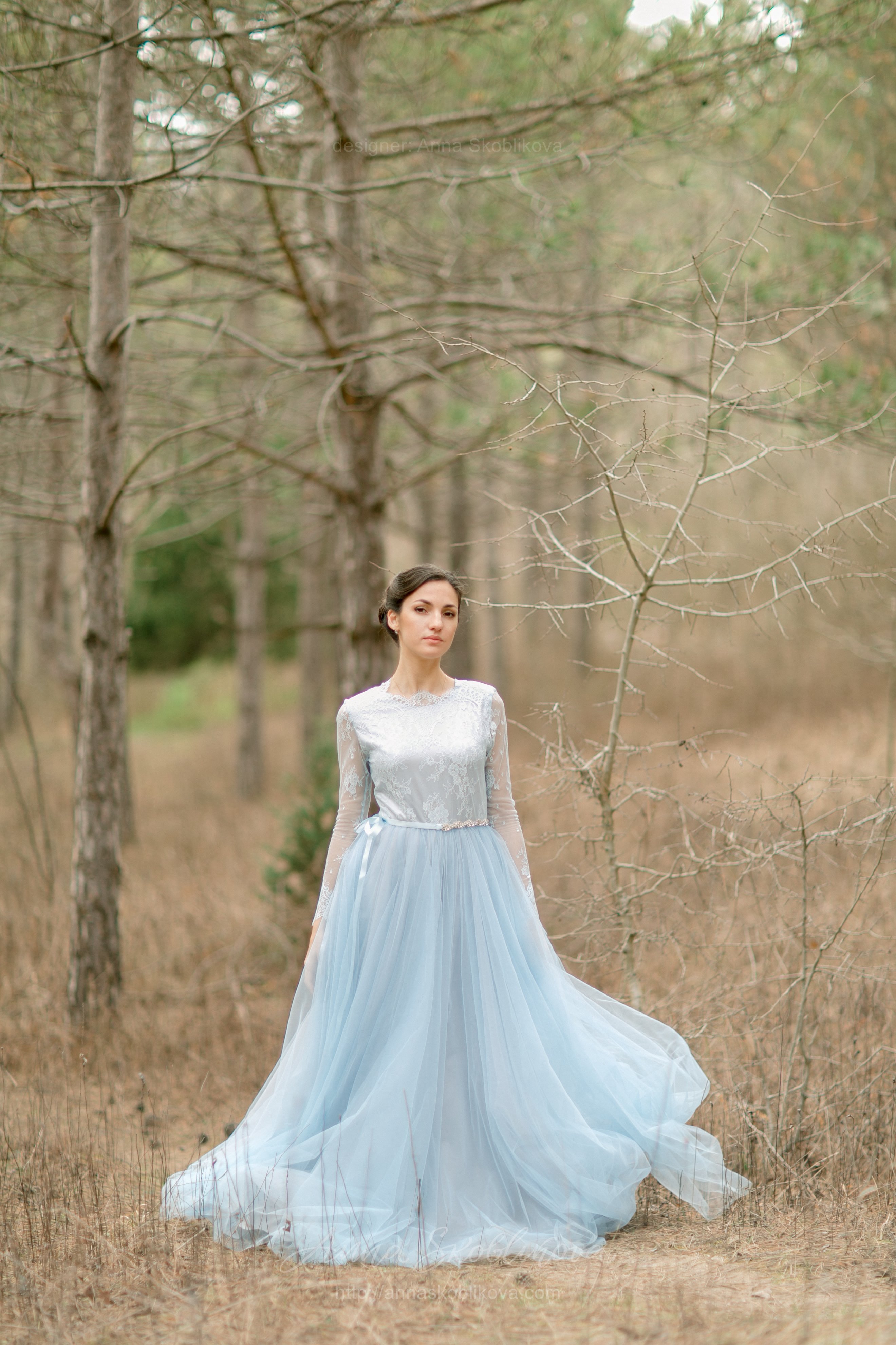 Light Blue Wedding Dress – unusual and very stylish bride choice. So airy and light this dress is made from 8 layers of light blue and grey soft tulle. The skirt comes with a train. Fitted bodice has narrow sleeves and a lovely carved festoon neck. The gown is fastened from the back with beautiful pearl buttons.