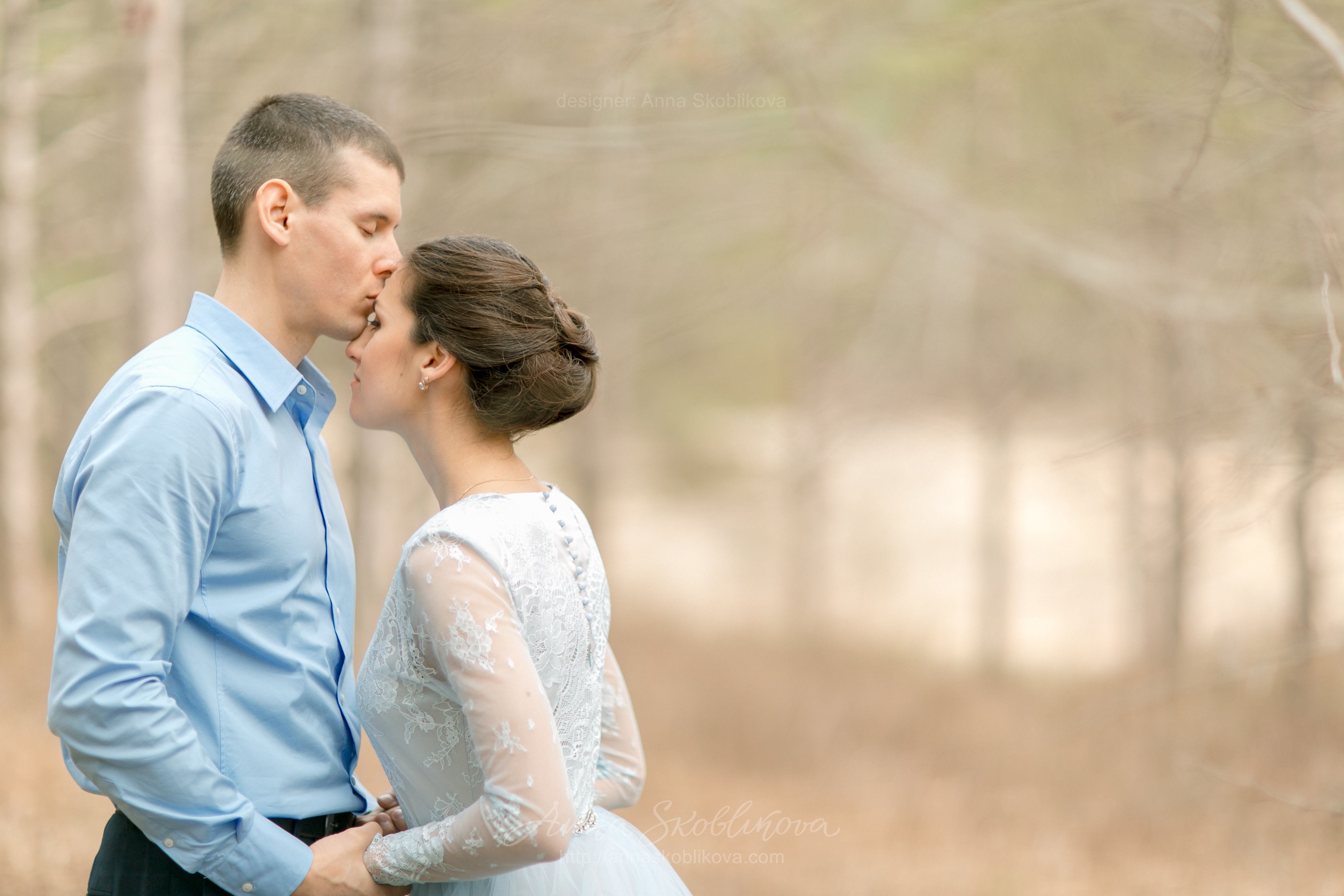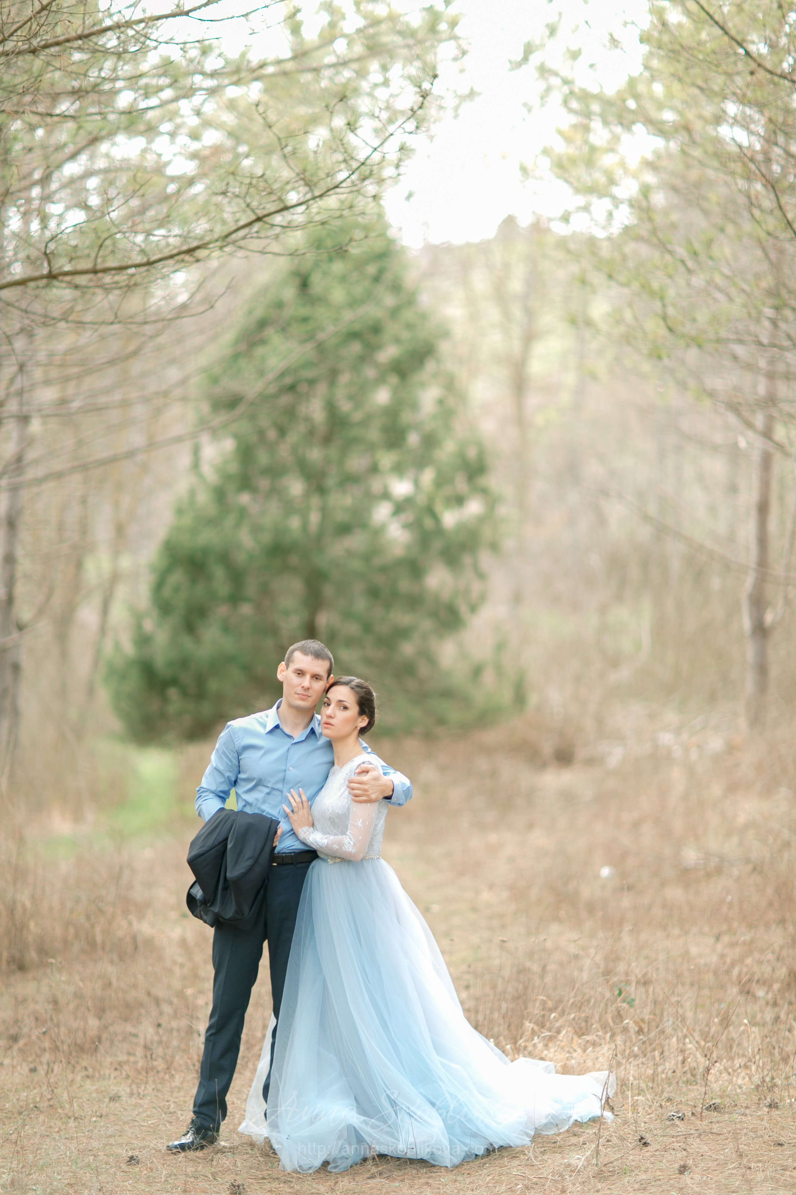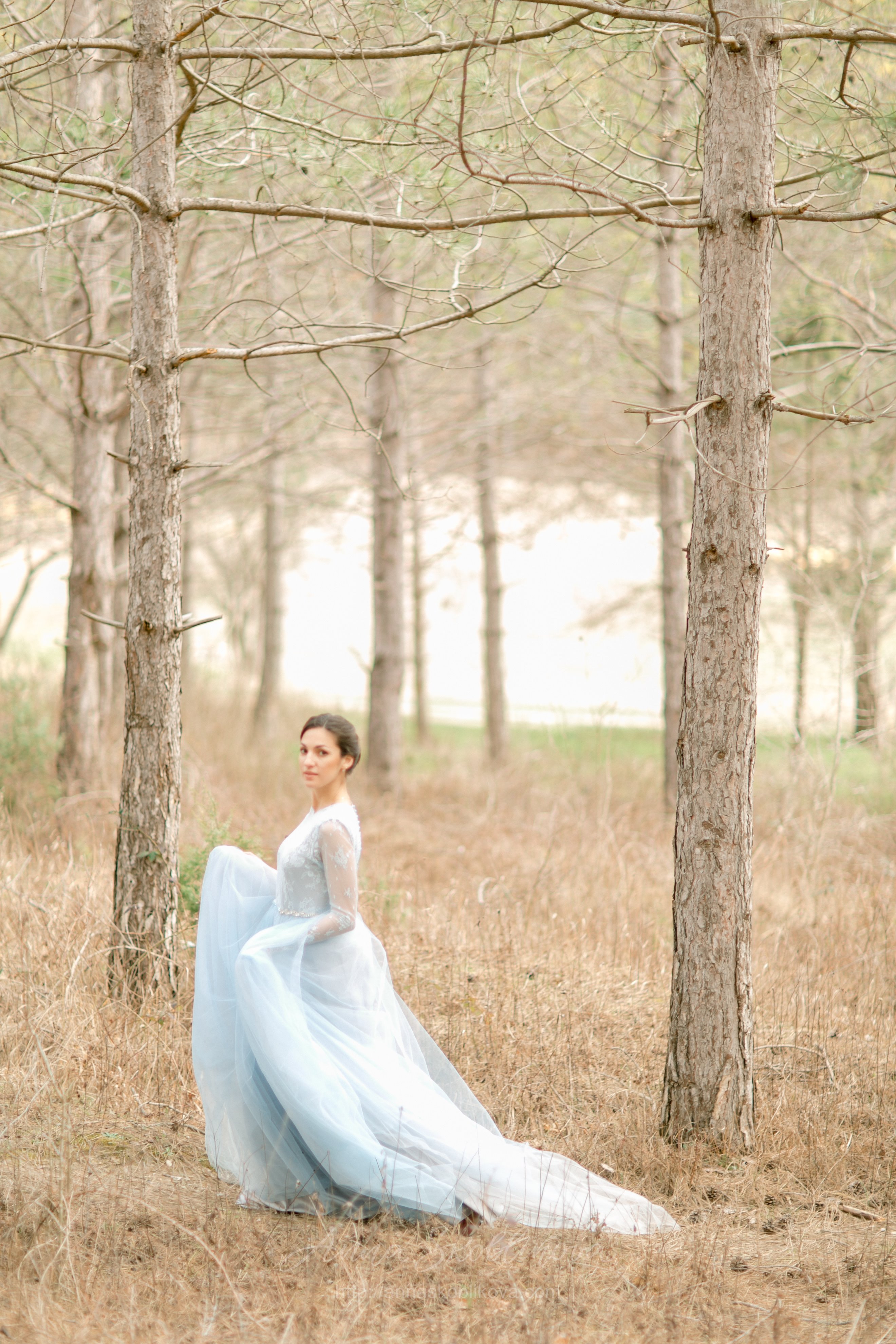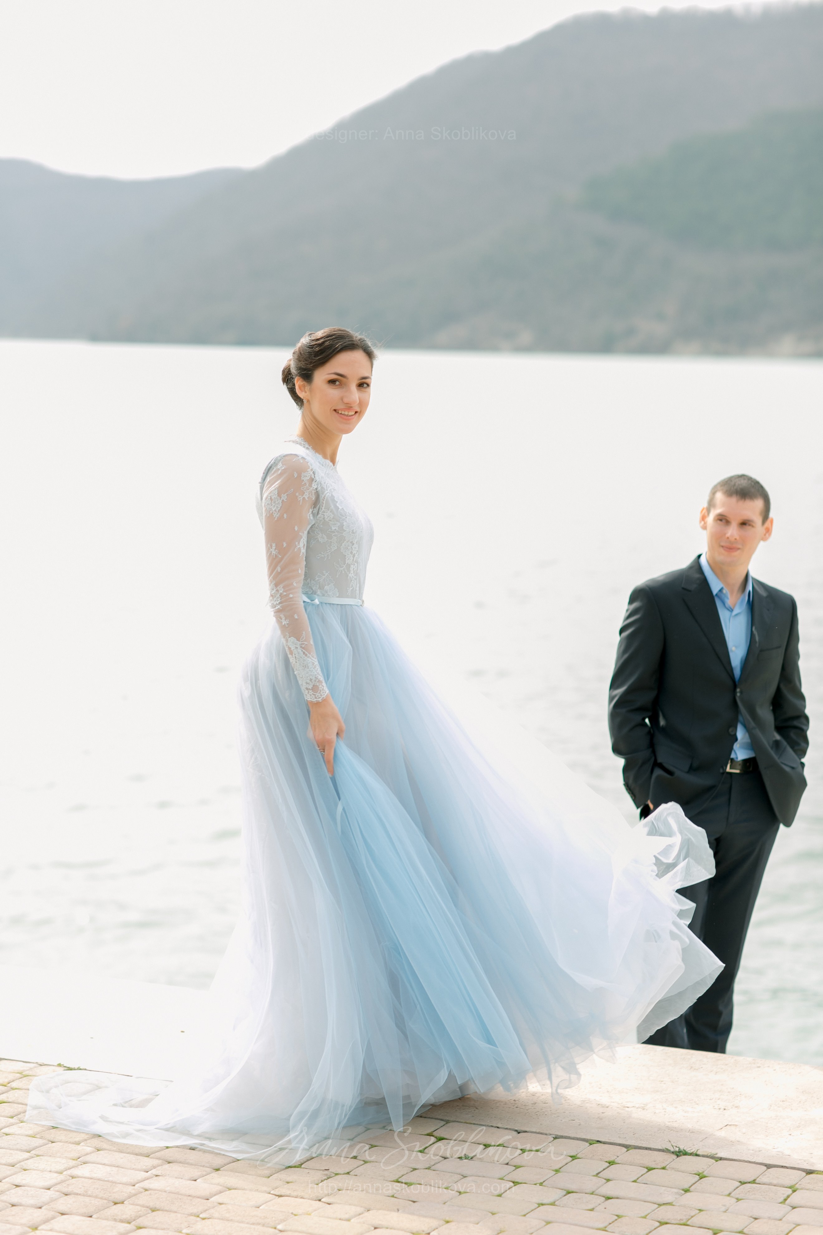 Light Blue Wedding Dress – unusual and very stylish bride choice. So airy and light this dress is made from 8 layers of light blue and grey soft tulle. The skirt comes with a train. Fitted bodice has narrow sleeves and a lovely carved festoon neck. The gown is fastened from the back with beautiful pearl buttons.