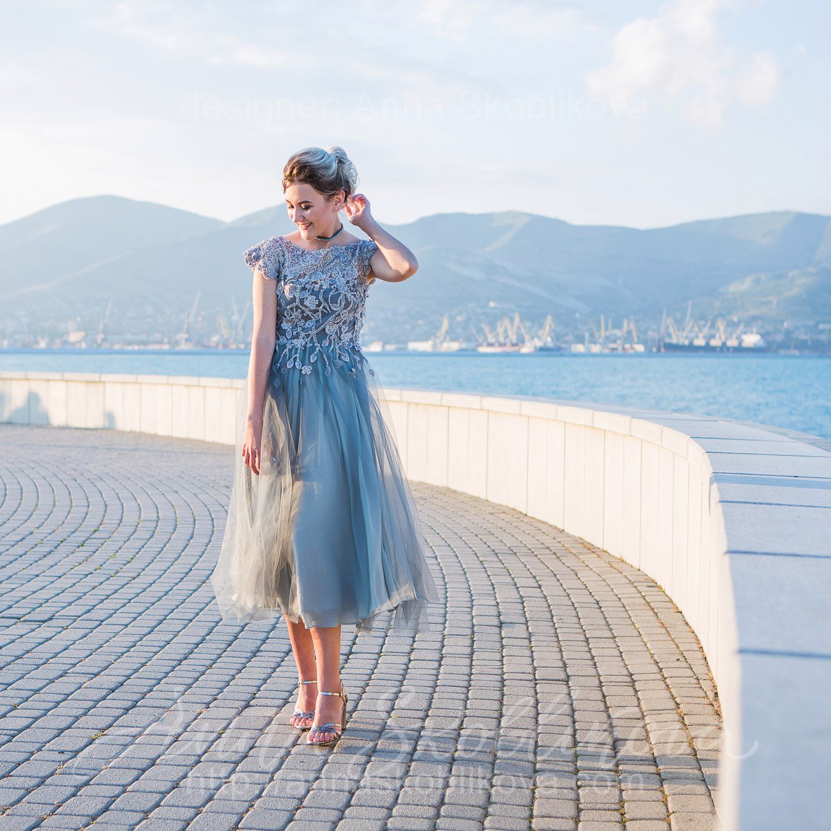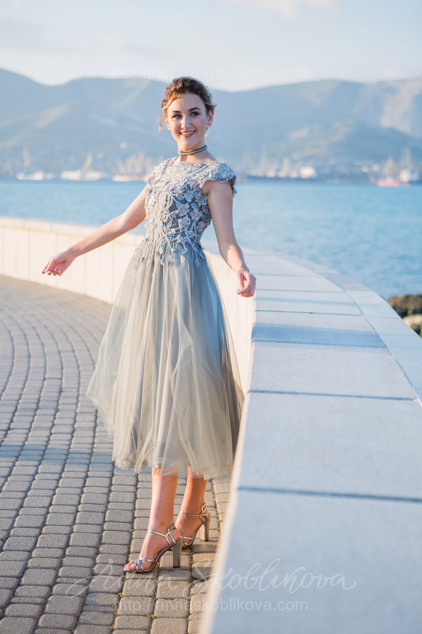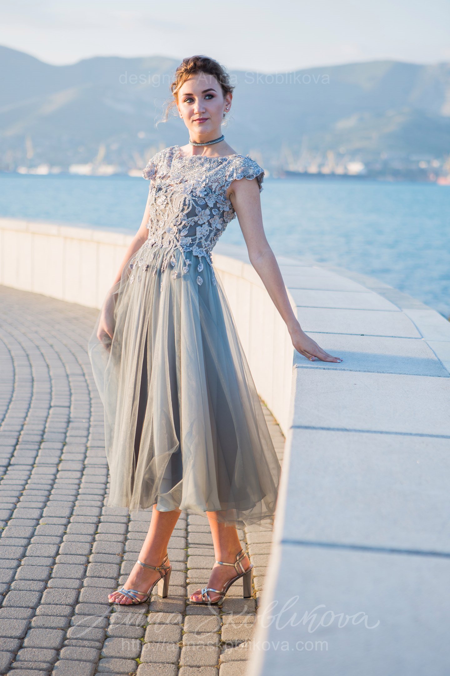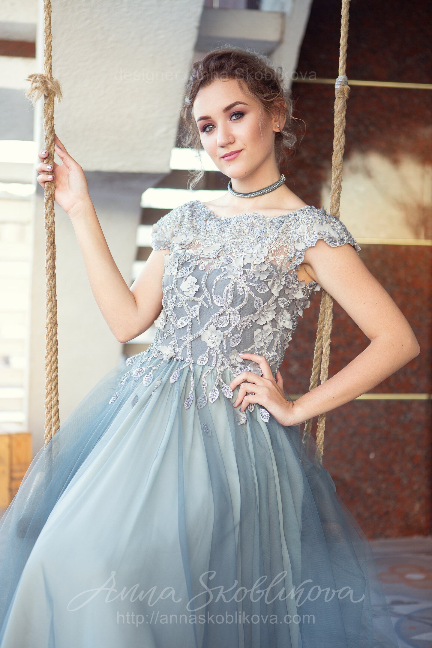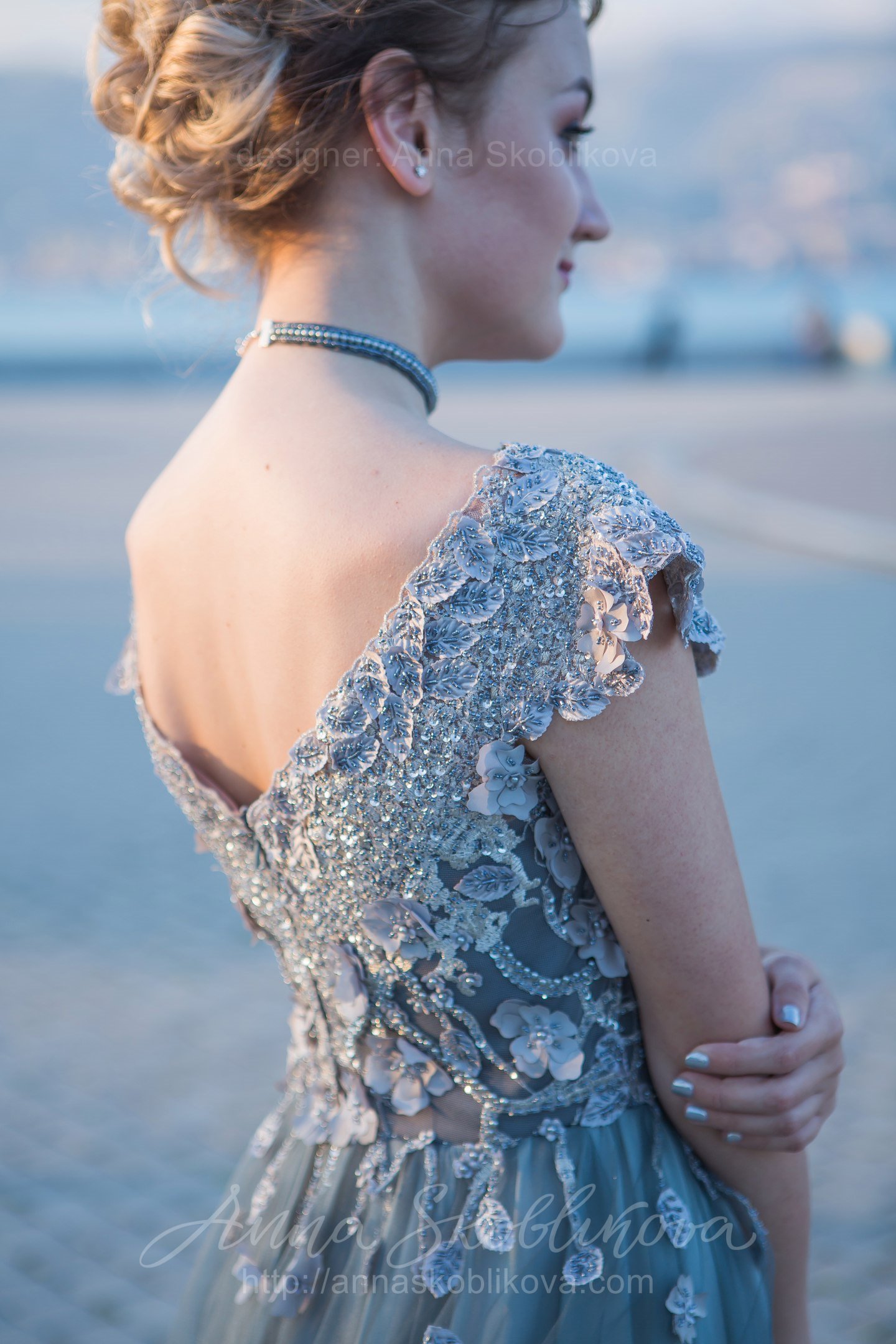 Luxurious gray-green evening gown with handmade embroidery. Unusual compound color makes it unique and unforgettable. Flowers, petals and beads hand embroidery covers the bodice and goes to the skirt. Sleeve is in the form of a small wing for easy movement. Back with non-deep V-neck cut.