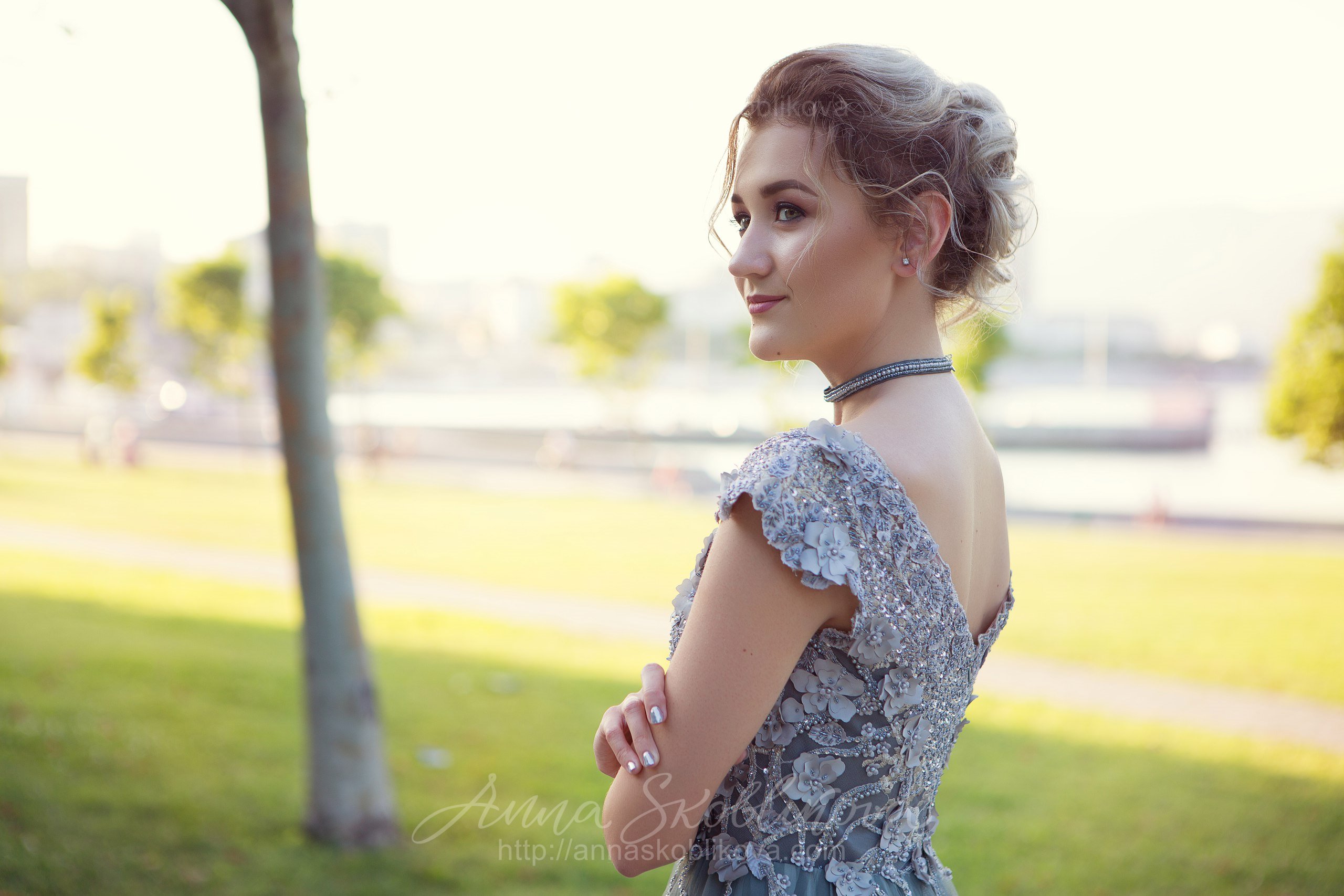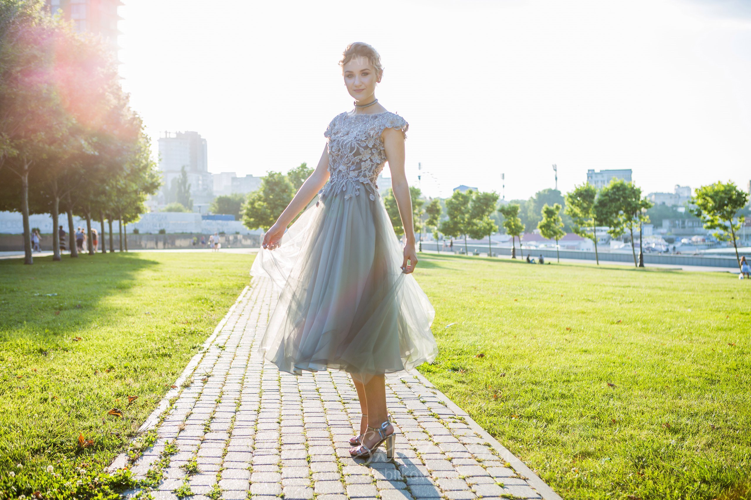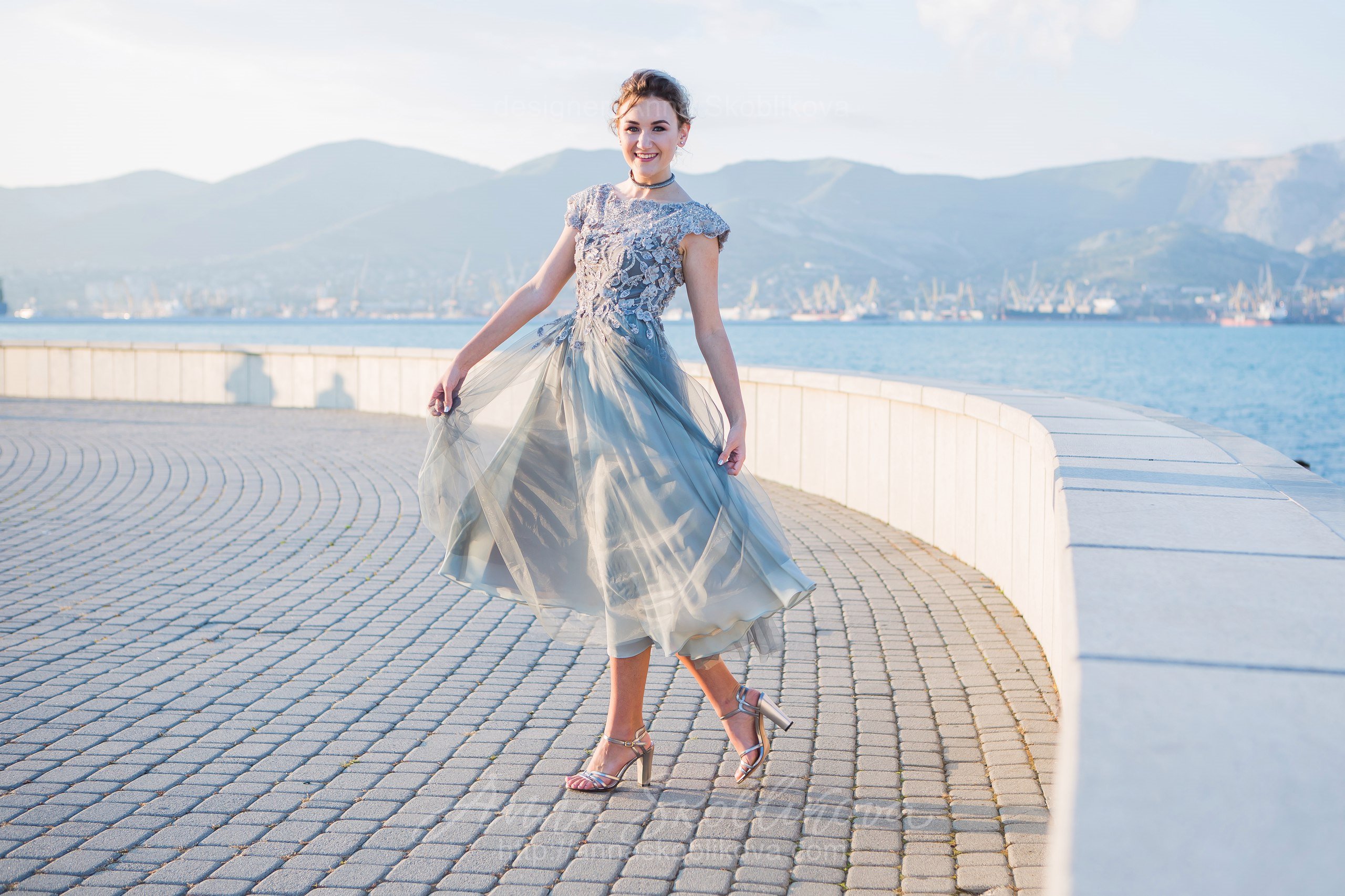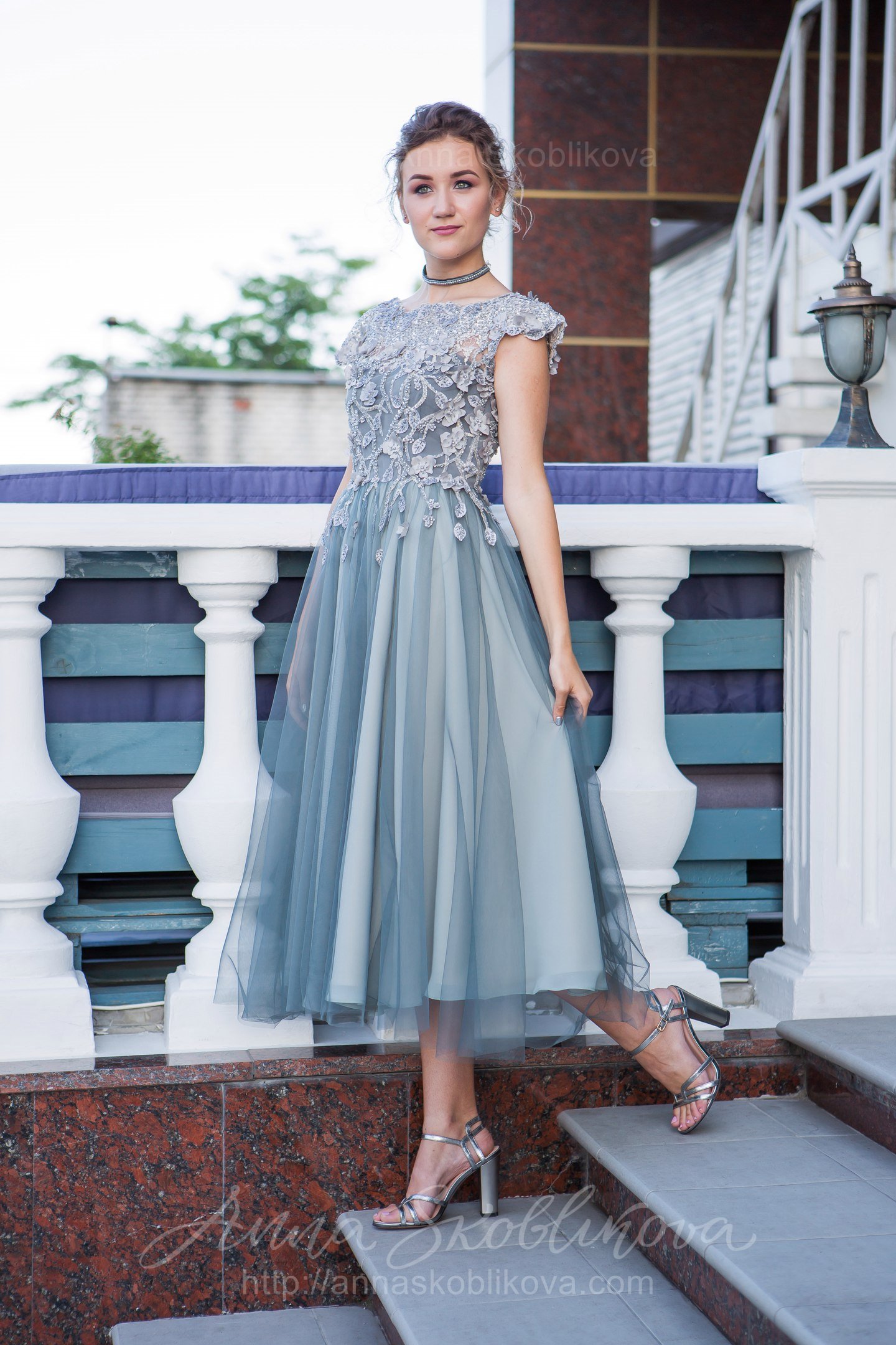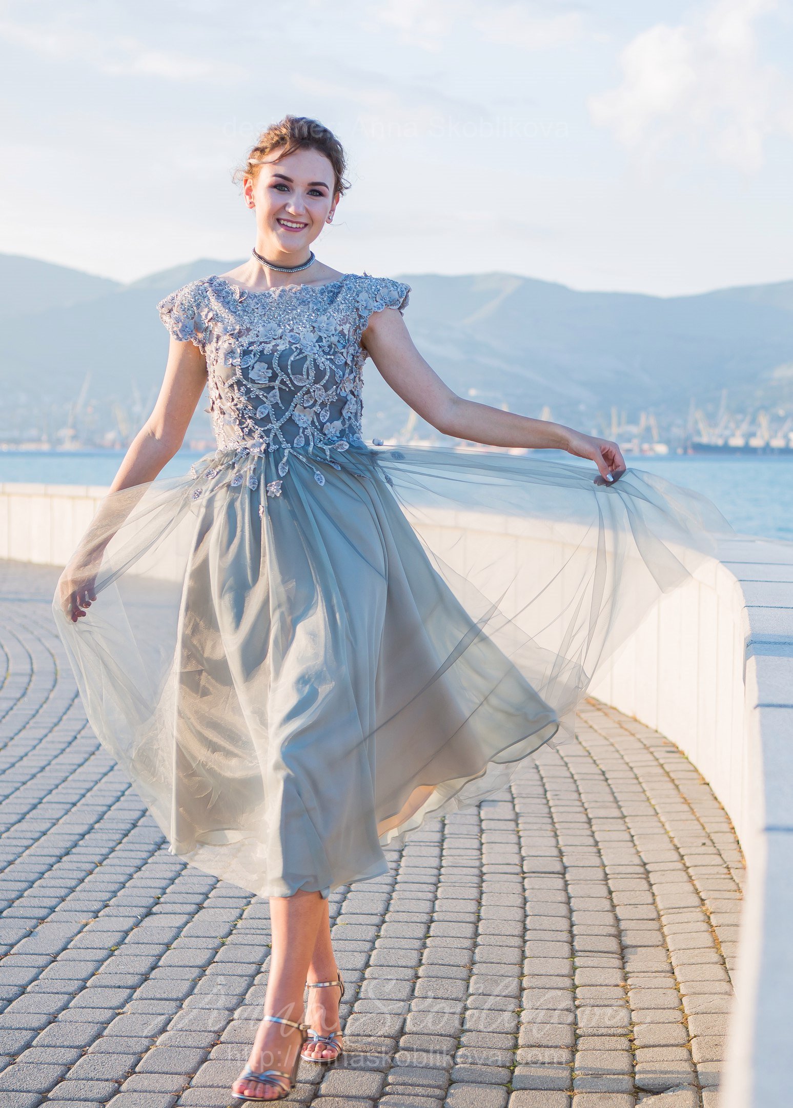 Luxurious gray-green evening gown with handmade embroidery. Unusual compound color makes it unique and unforgettable. Flowers, petals and beads hand embroidery covers the bodice and goes to the skirt. Sleeve is in the form of a small wing for easy movement. Back with non-deep V-neck cut.