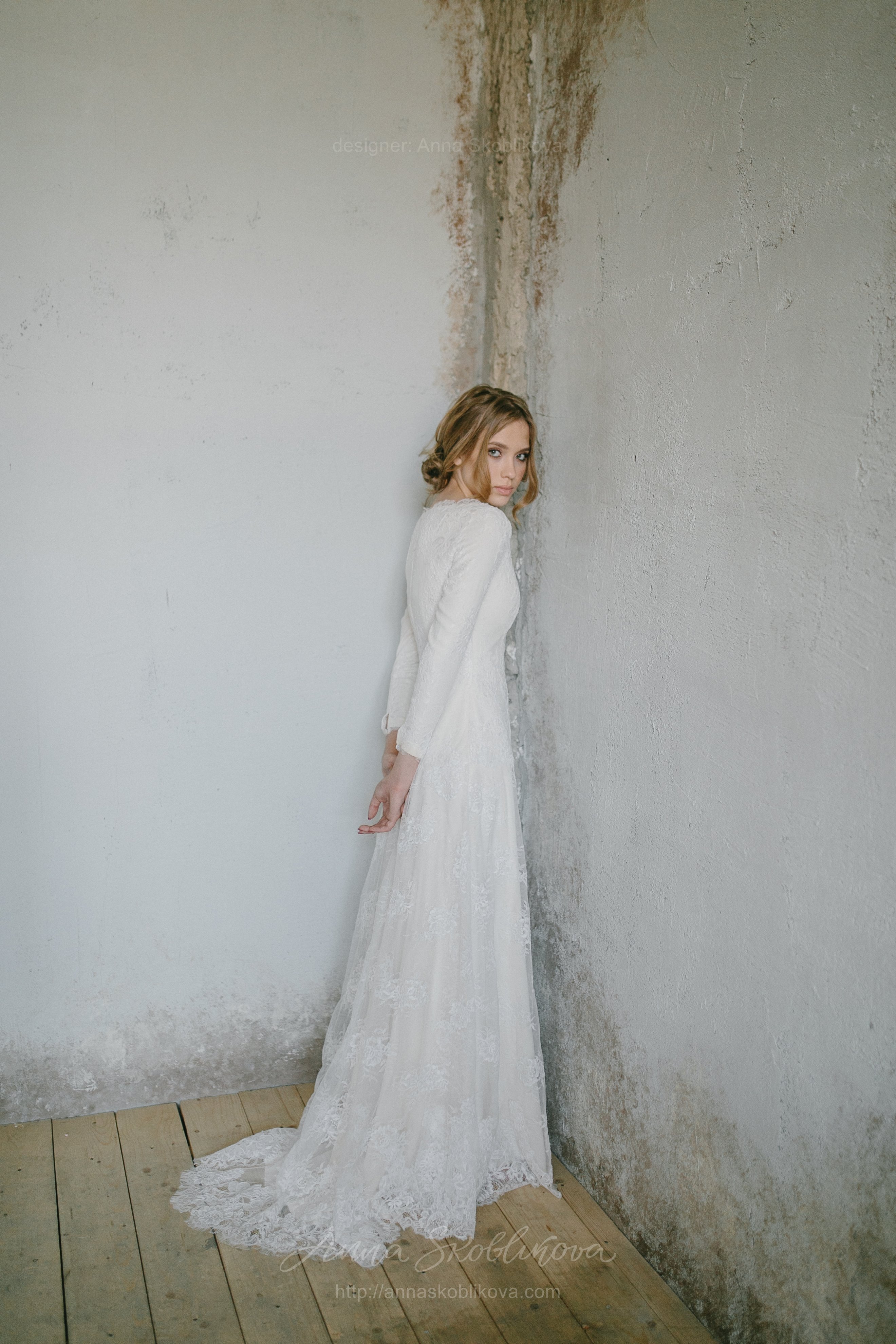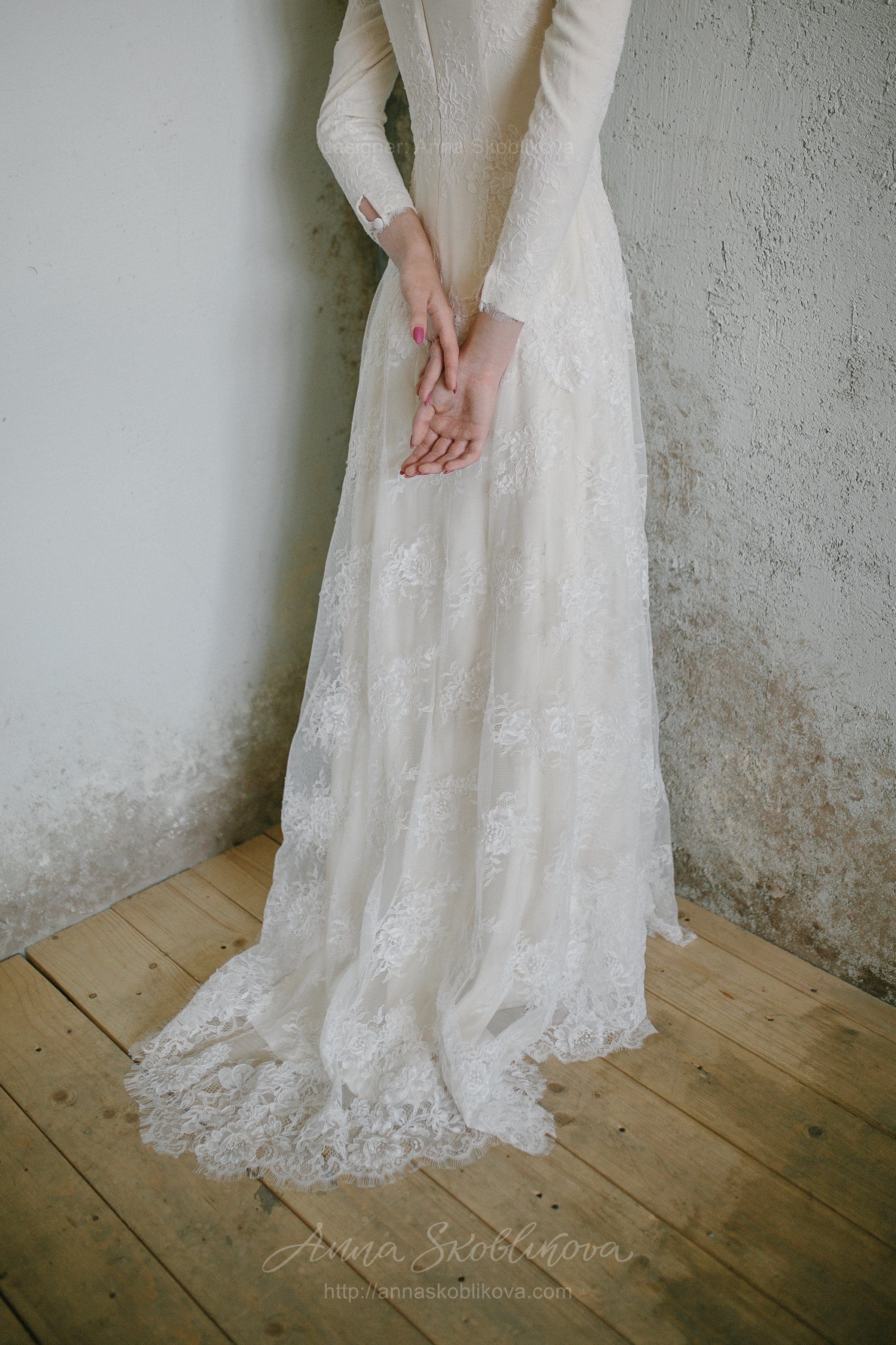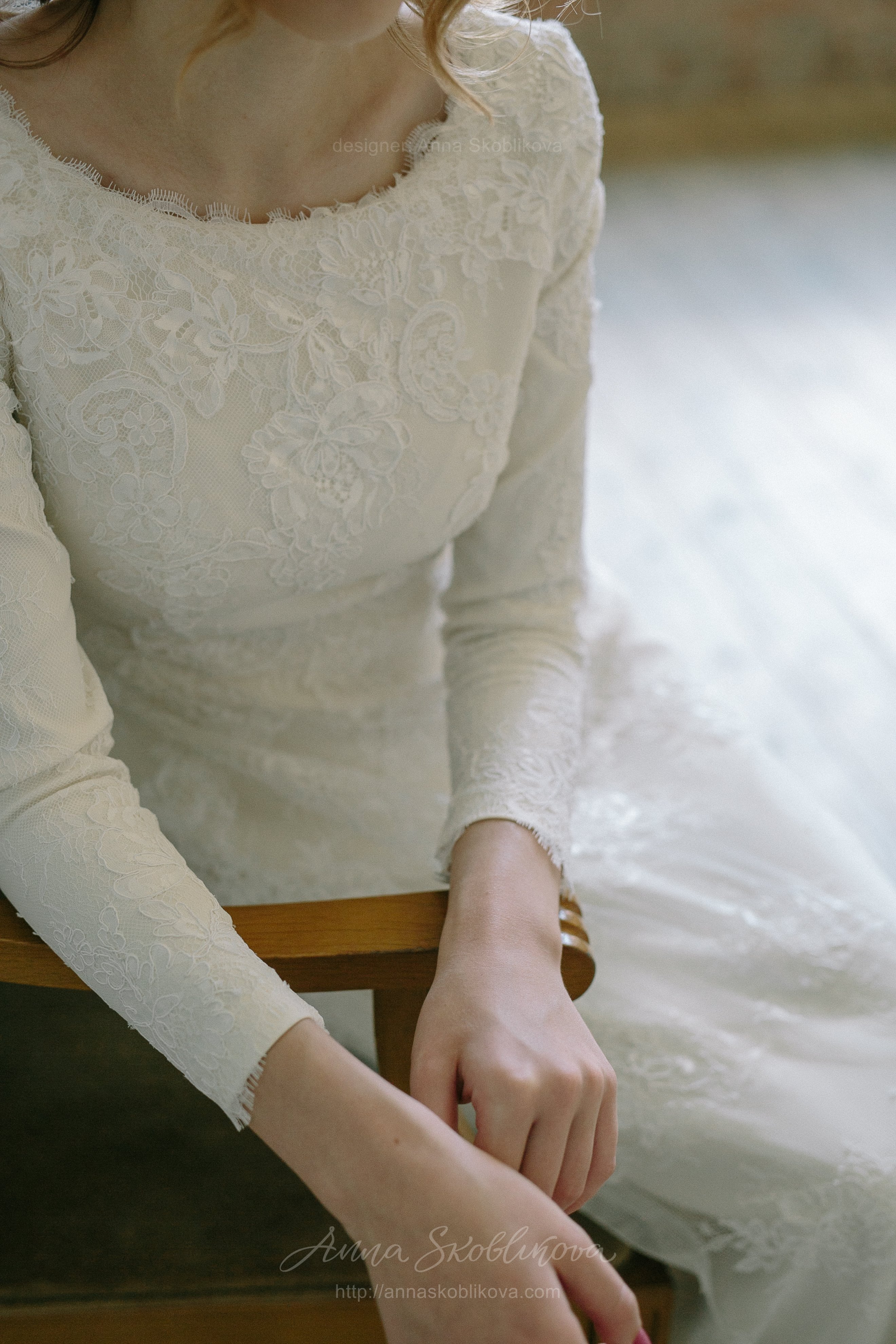Luxurious winter lace wedding dress, fitted perfectly with complete silk lining, insulated with a costume wool. Lace upper part is of fit&flare silhouette created on author’s seamless technology. Dress has an integral seamless structure due to manual fitting. Charming hand embroidery by lace elements is over the main lace fabric. The bottom of the dress is also handled manually with lace elements. Multi layers lining: stretch Italian wool, natural silk used not only in the skirt and bodice, but also in the sleeves. Back zipper. There are 3 pearls buttons on the sleeves.