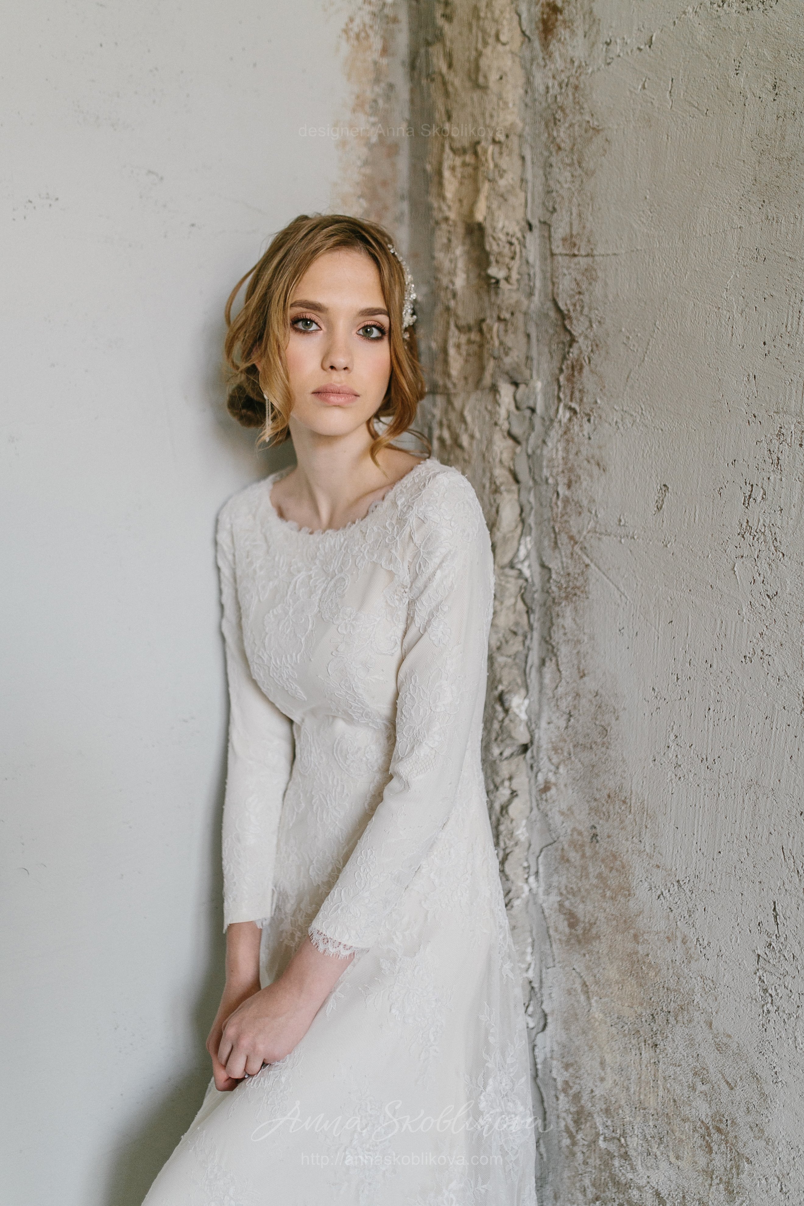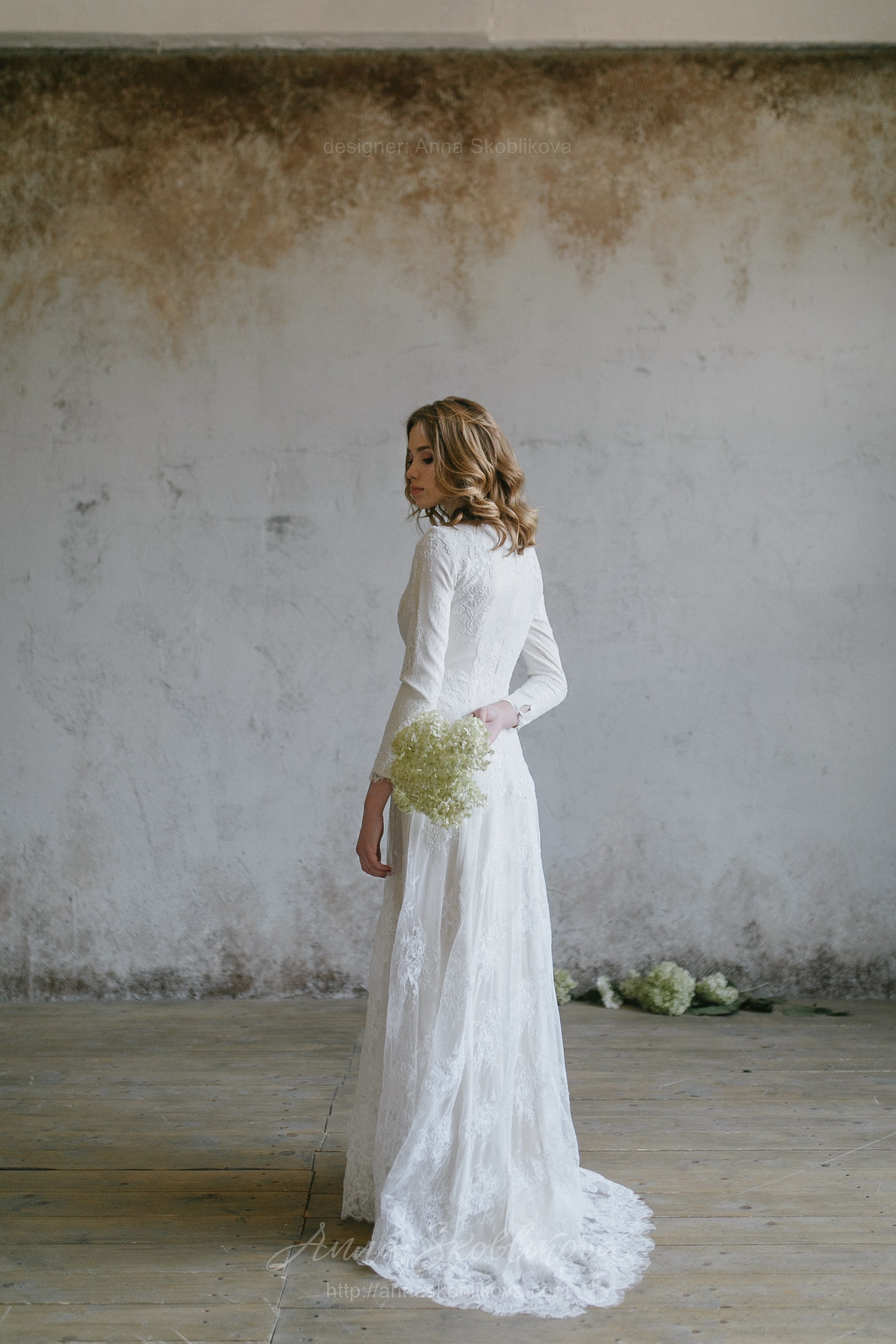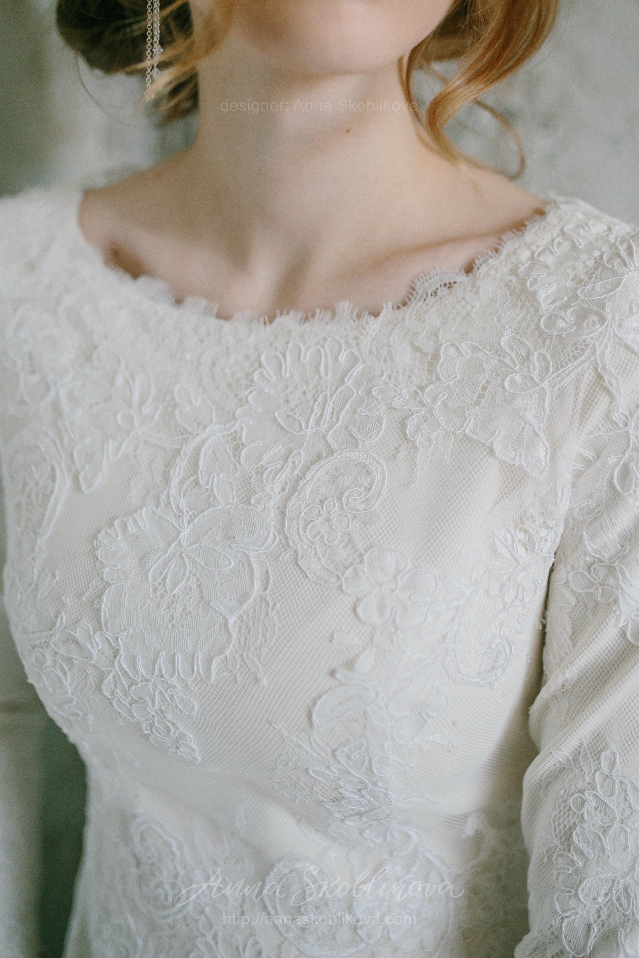 Luxurious winter lace wedding dress, fitted perfectly with complete silk lining, insulated with a costume wool. Lace upper part is of fit&flare silhouette created on author’s seamless technology. Dress has an integral seamless structure due to manual fitting. Charming hand embroidery by lace elements is over the main lace fabric. The bottom of the dress is also handled manually with lace elements. Multi layers lining: stretch Italian wool, natural silk used not only in the skirt and bodice, but also in the sleeves. Back zipper. There are 3 pearls buttons on the sleeves.