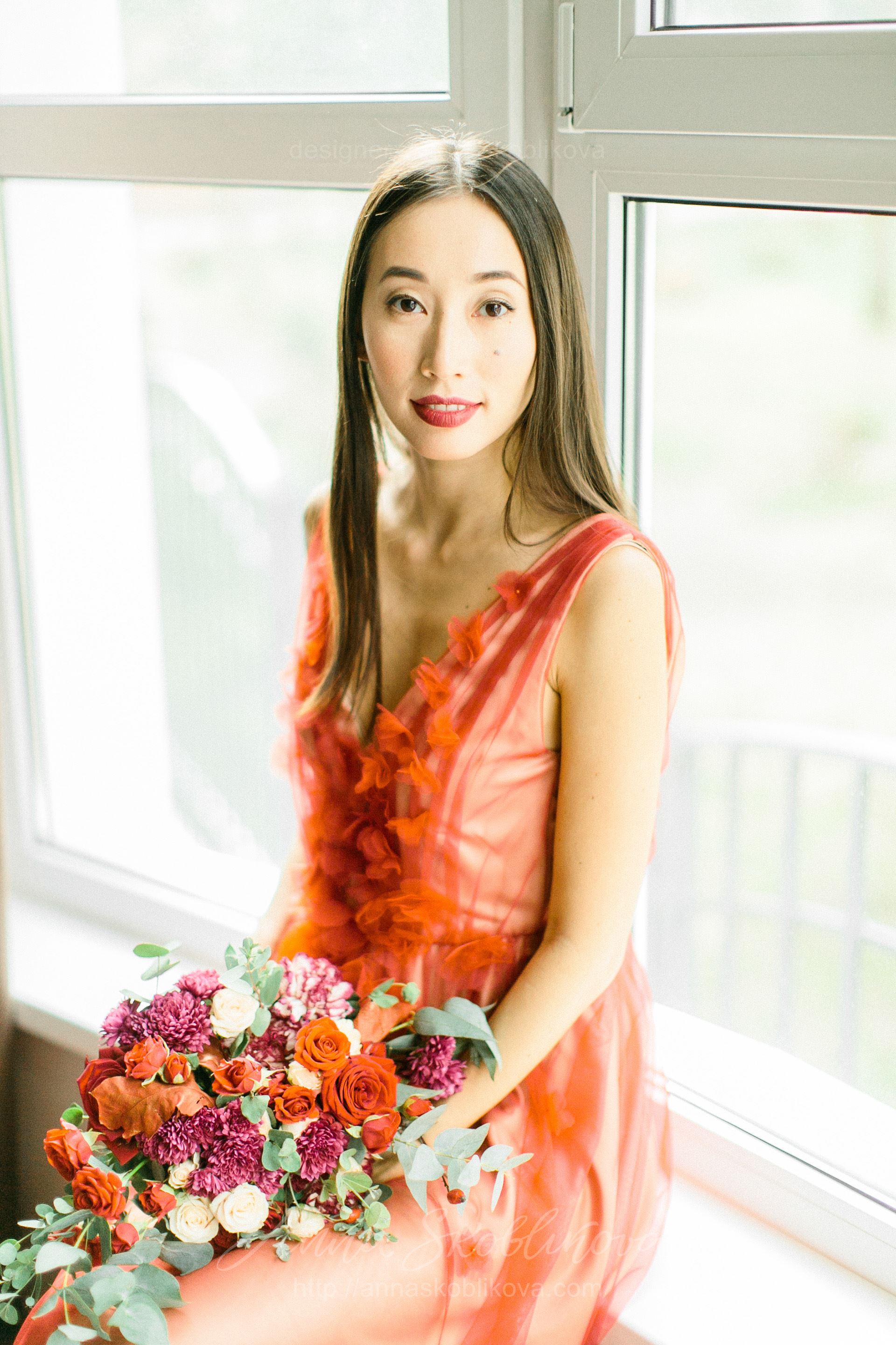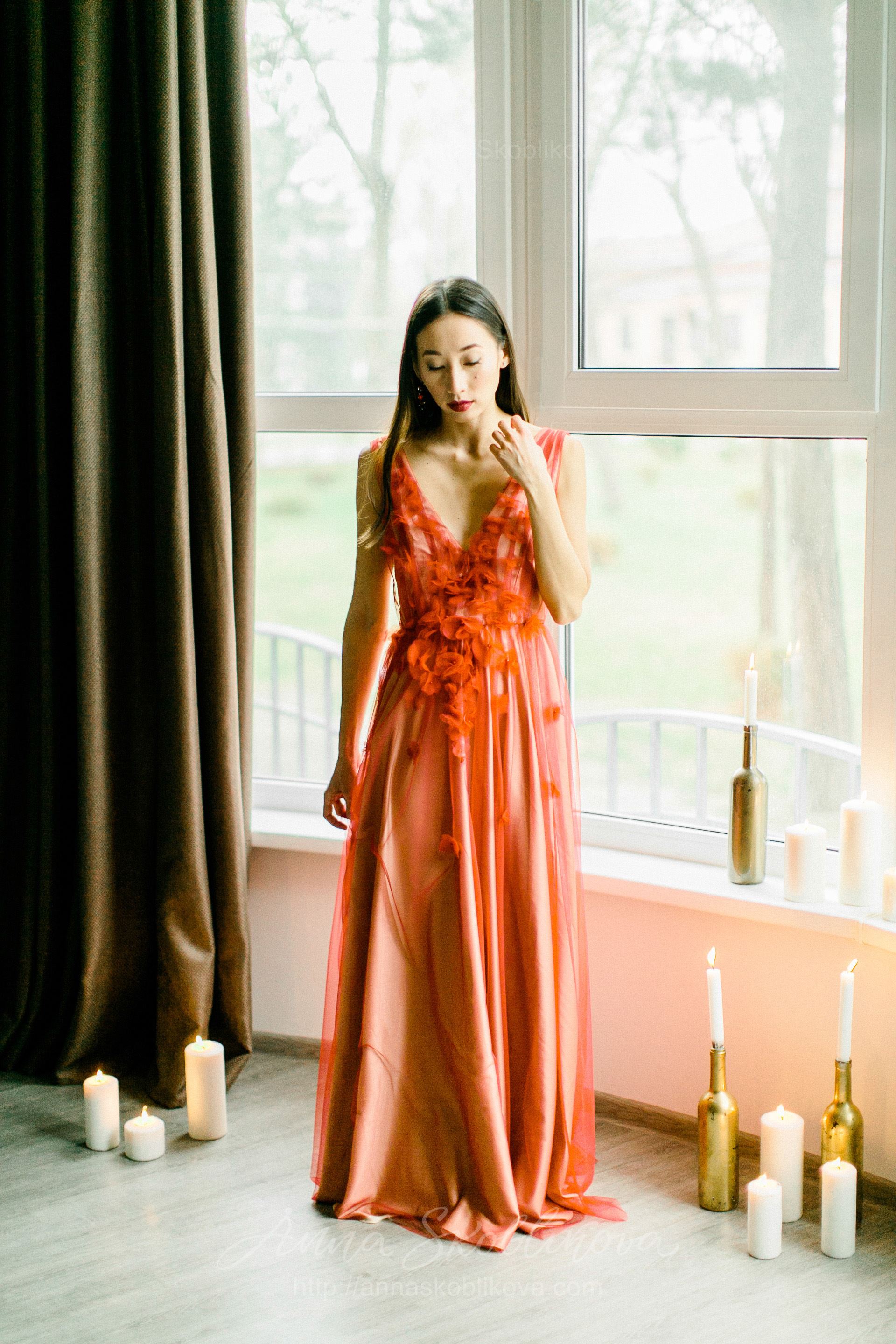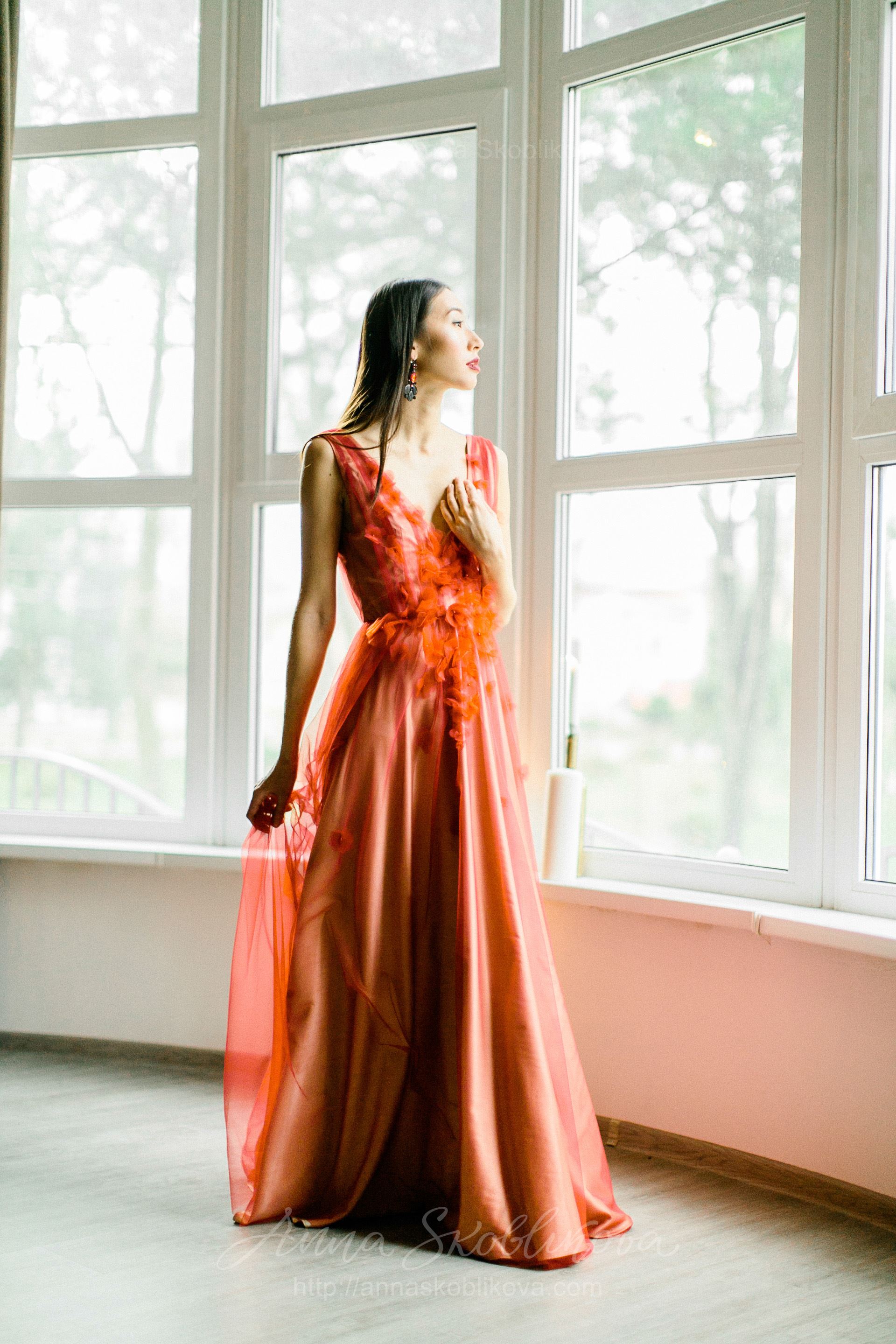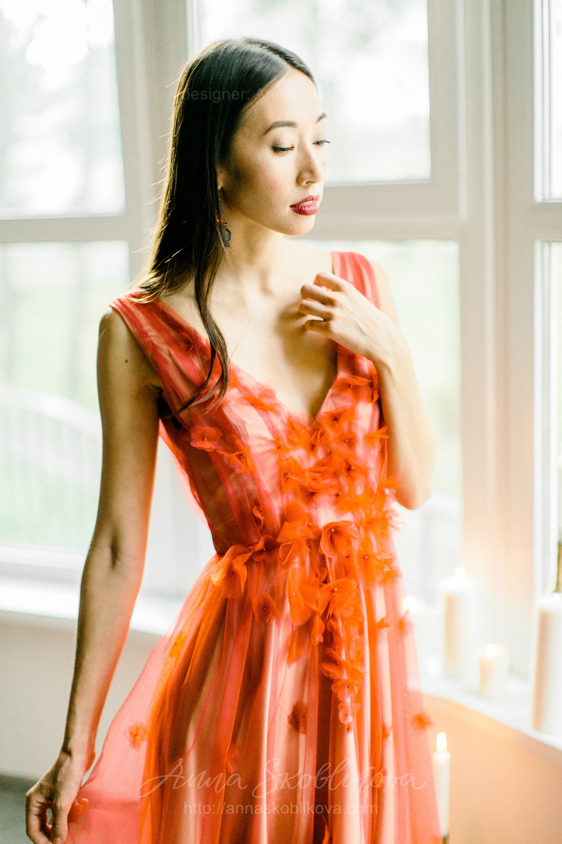 Offbeat red and white dress from Italian net decorated with handmade flowers.