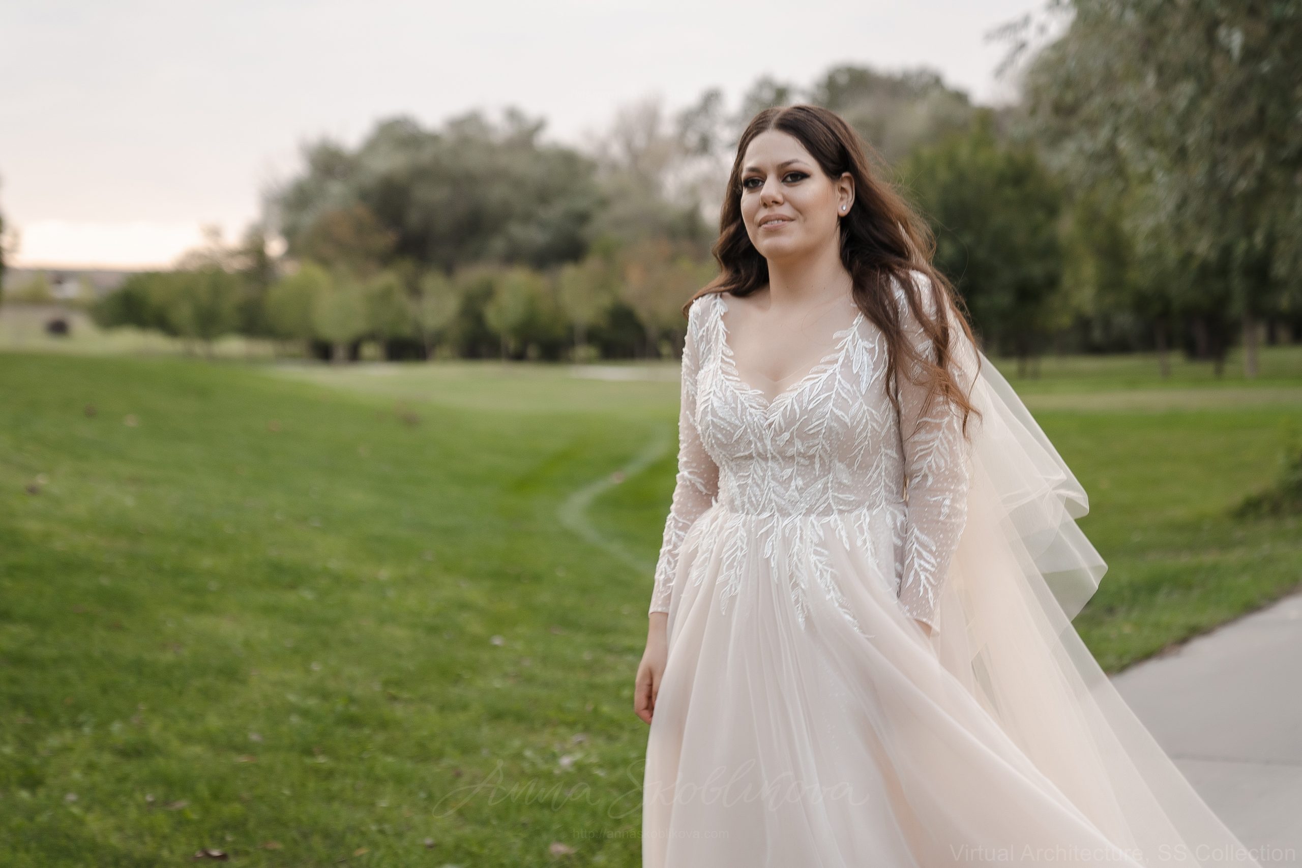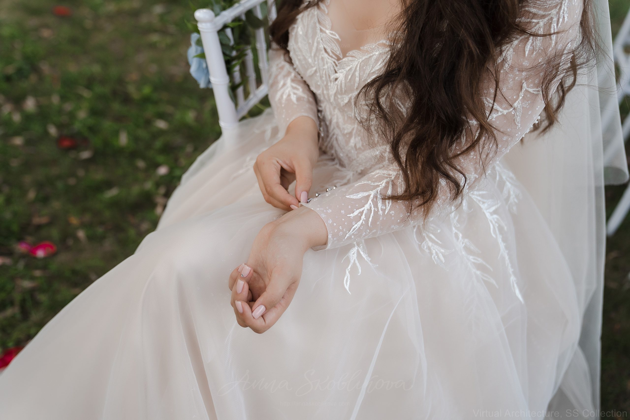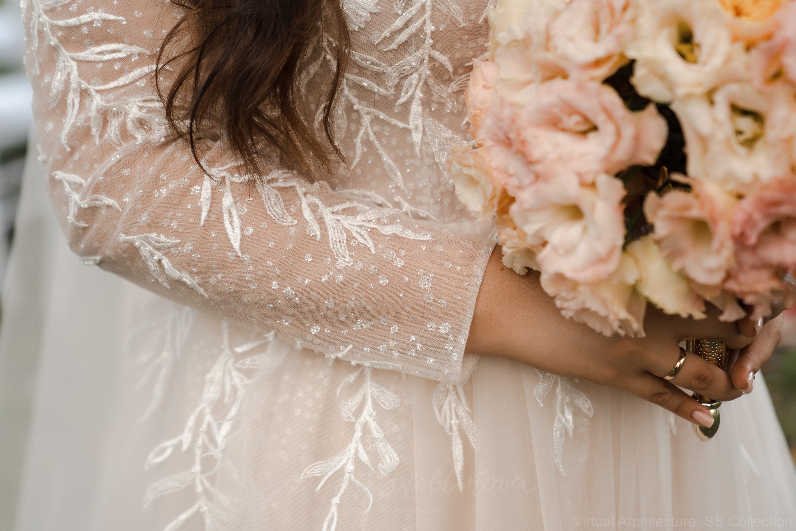 Plus-size wedding dress in a delicate champagne hue with hand-embroidered branches, elements, and beads, creating a unique detailed design. The bodice and sleeves are made from several types of mesh: soft and shimmering. The embroidery, entirely hand-sewn by our artisans, makes each process fascinatingly unique and irreplaceable. The embroidery will match the wedding dress size, highlighting the most significant aspects of the figure while concealing any flaws. For the skirt base, we used several different shades: ivory, smoky, and champagne. The appliques wedding dress features a corset top, which can be designed with either a zipper or a lacing. The corset offers excellent breast support and has a nude, skin-tone color, making it virtually invisible. The sleeves and back are buttoned up with crystal buttons.