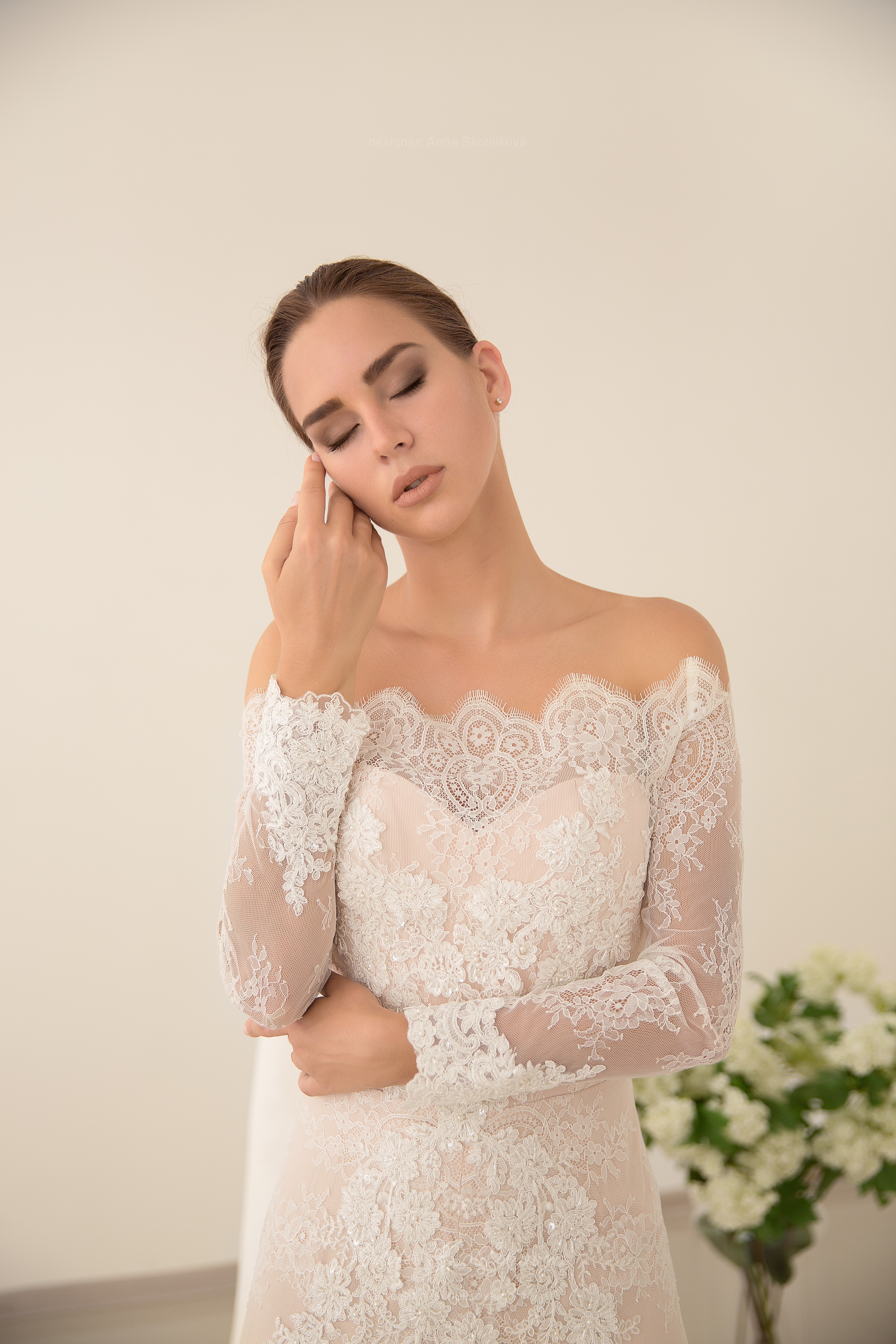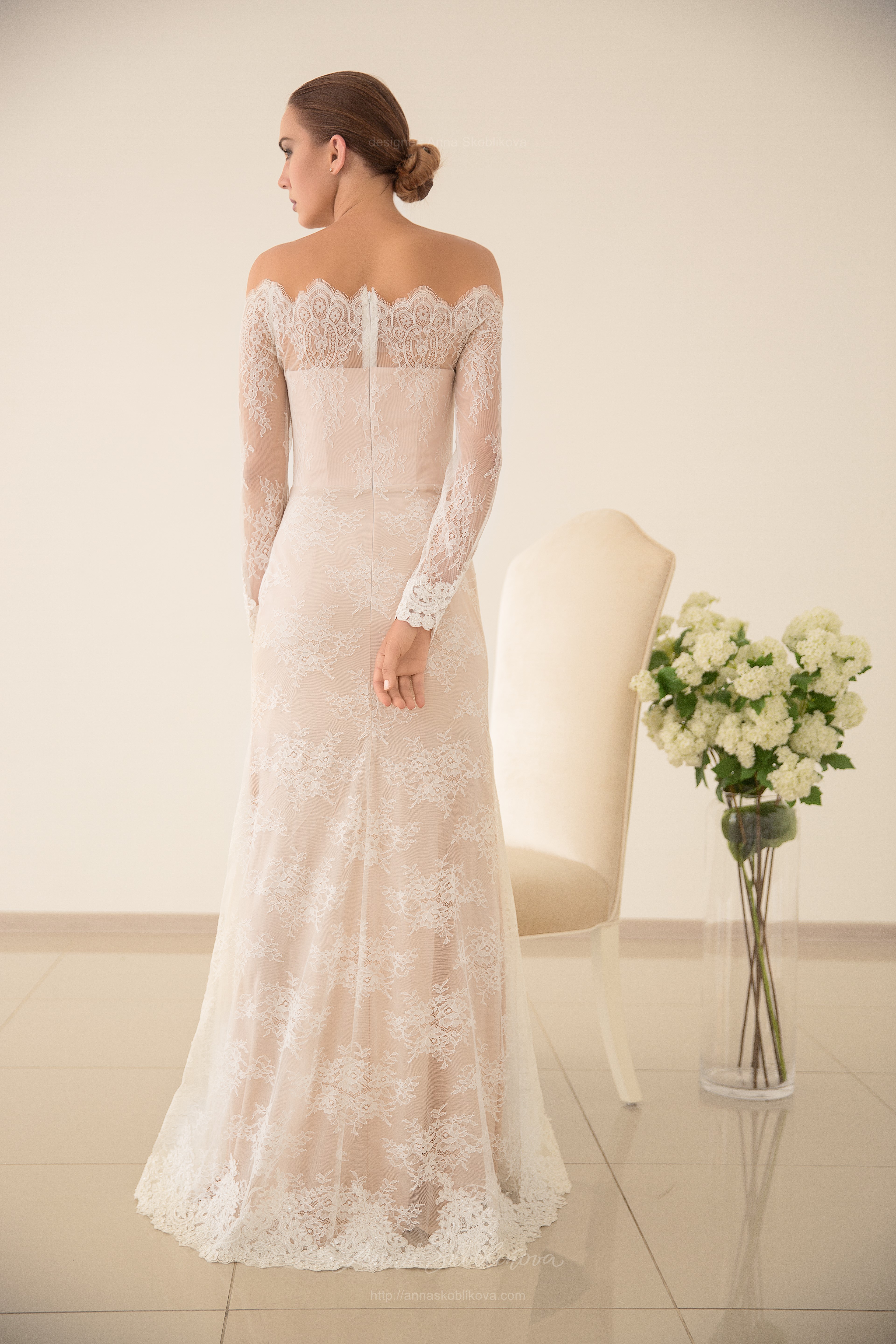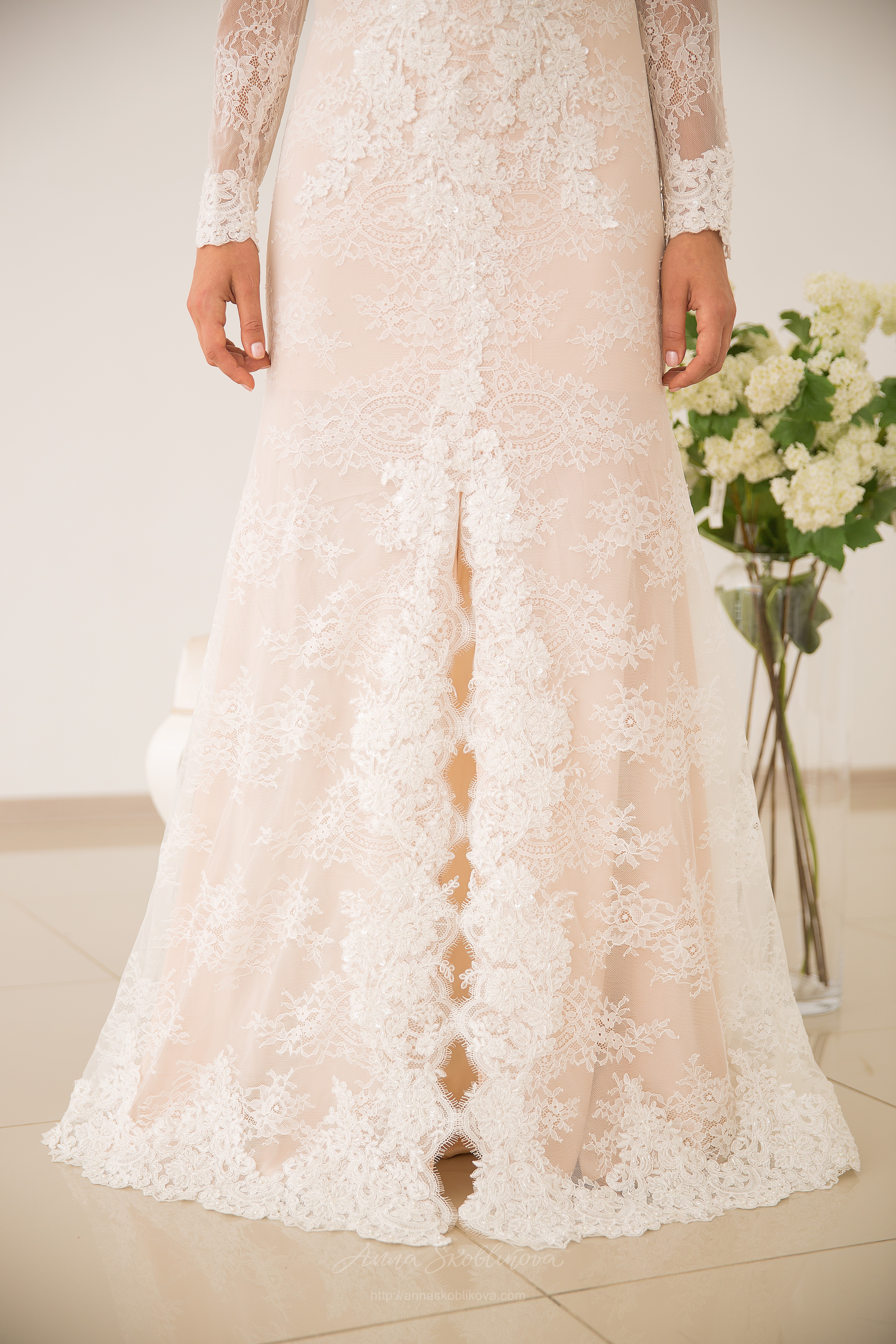 The main points of this wedding dress are bare shoulders and skirt cut, which are densely hand-embroidered with lovely lace elements.