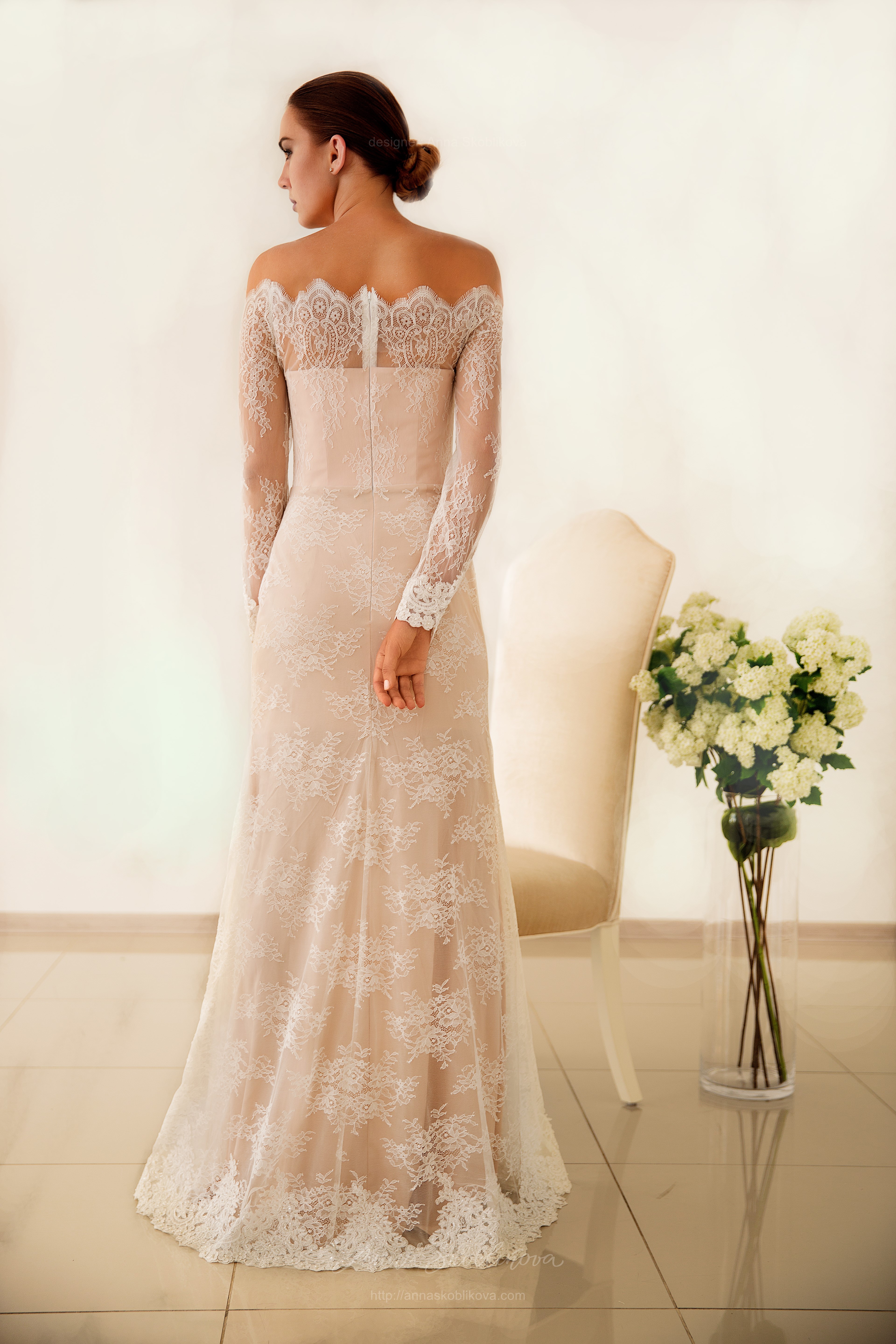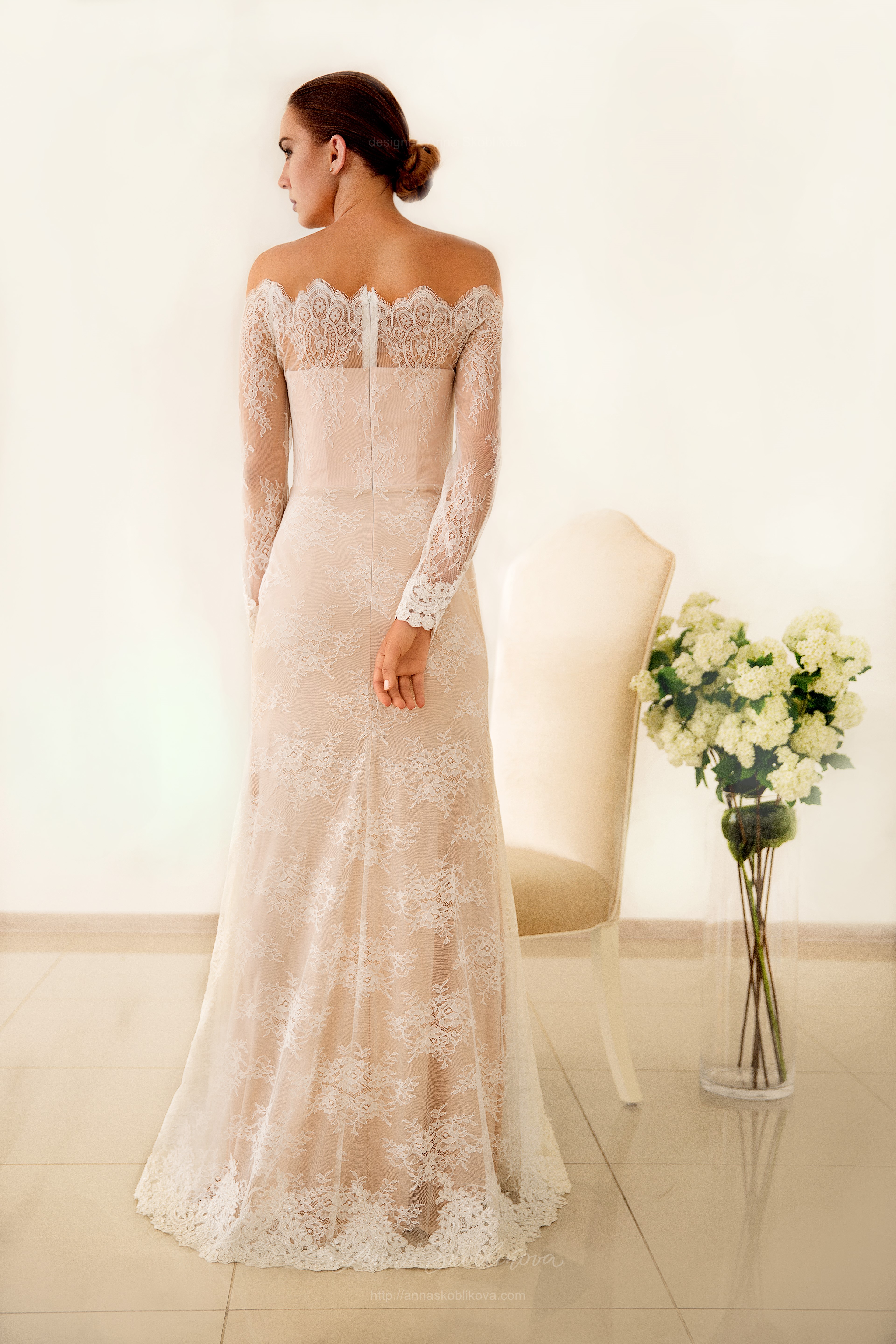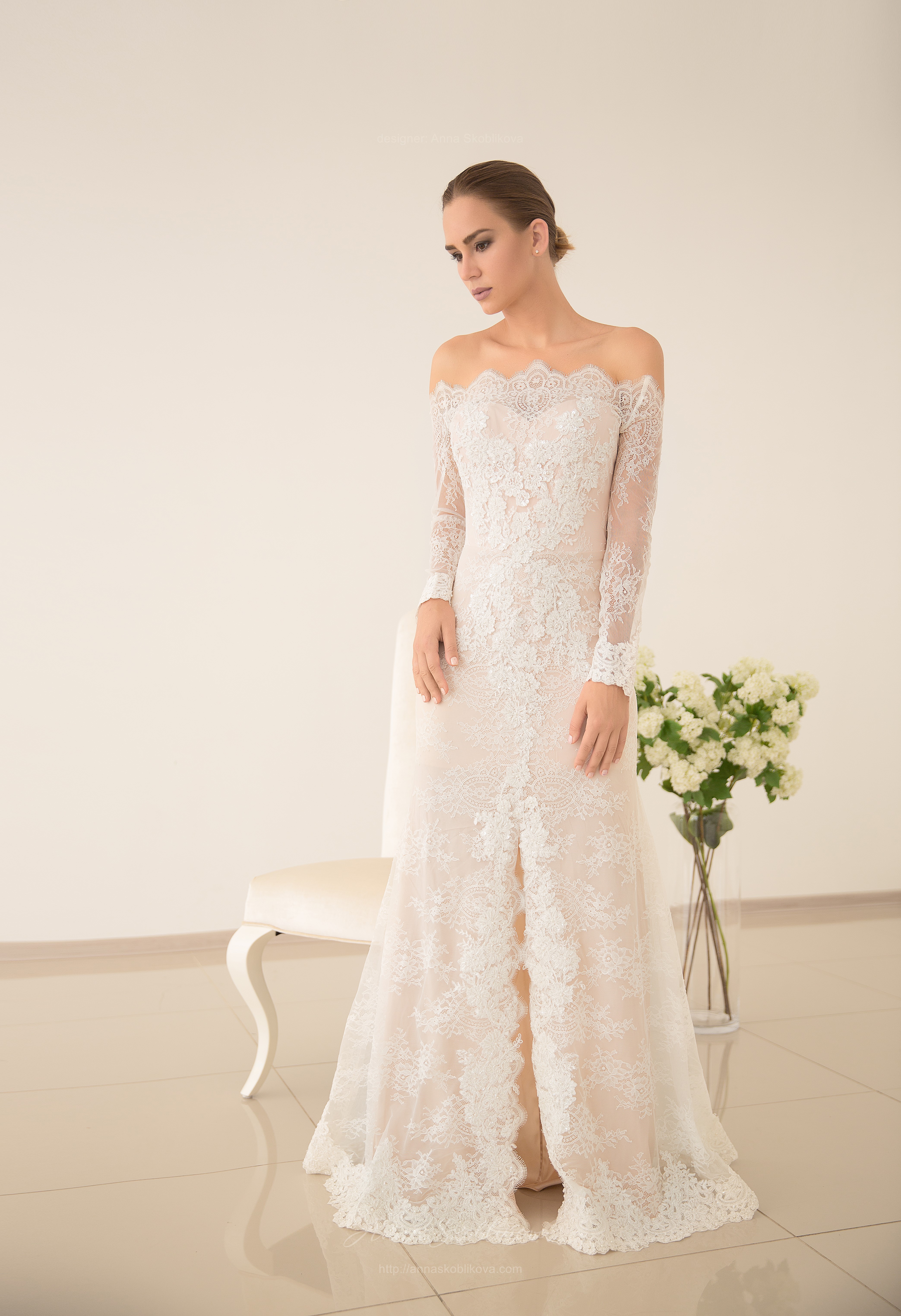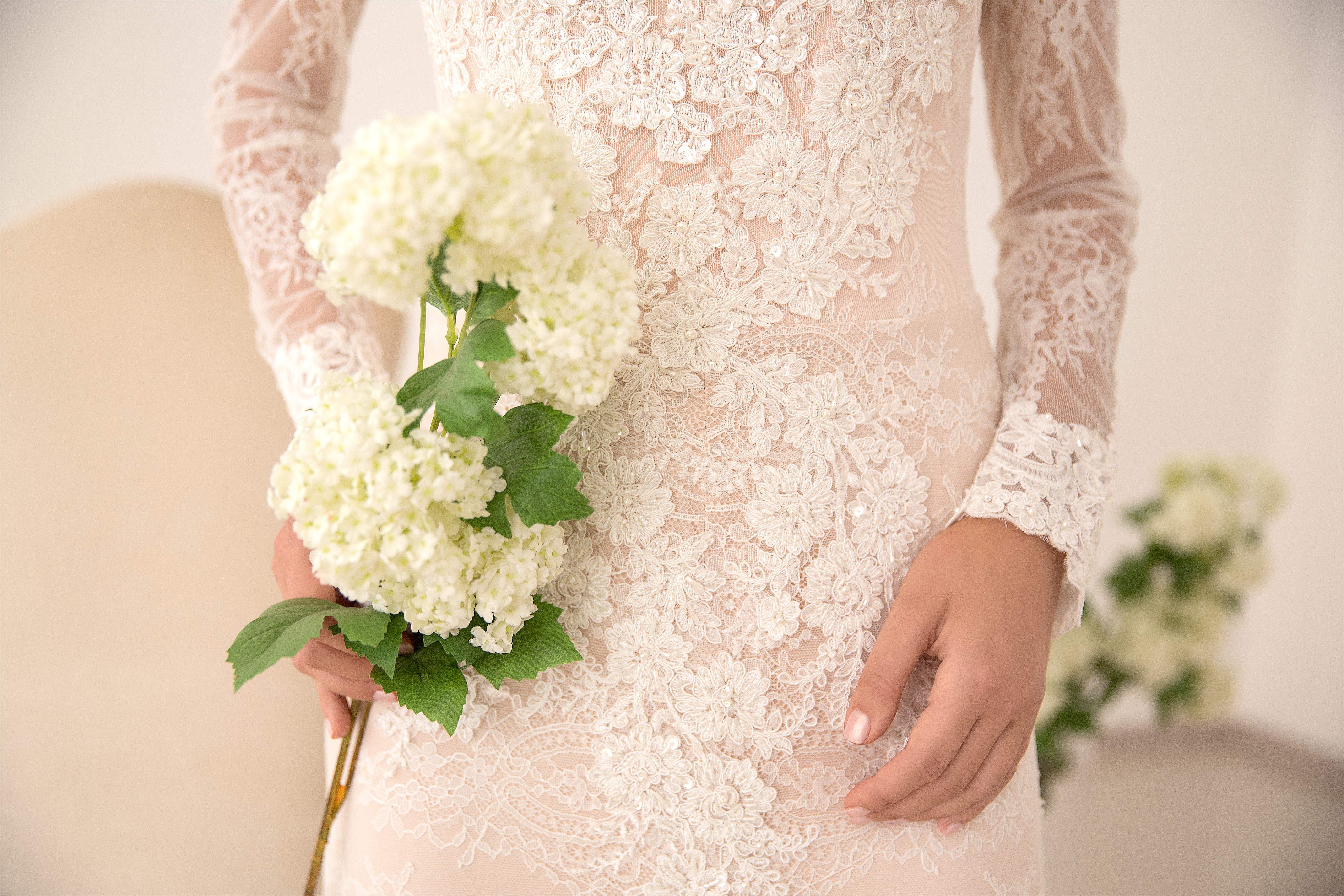 The main points of this wedding dress are bare shoulders and skirt cut, which are densely hand-embroidered with lovely lace elements.