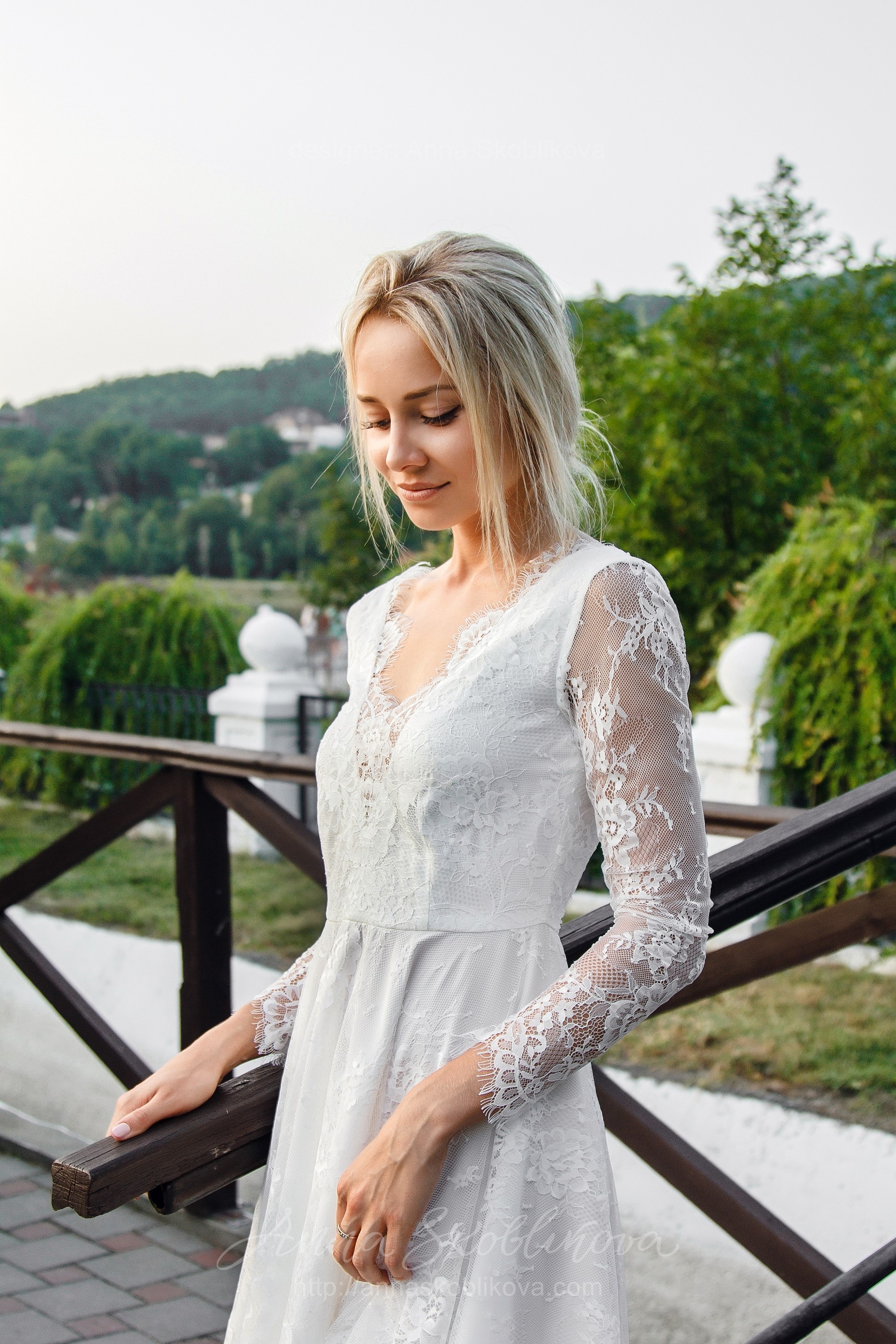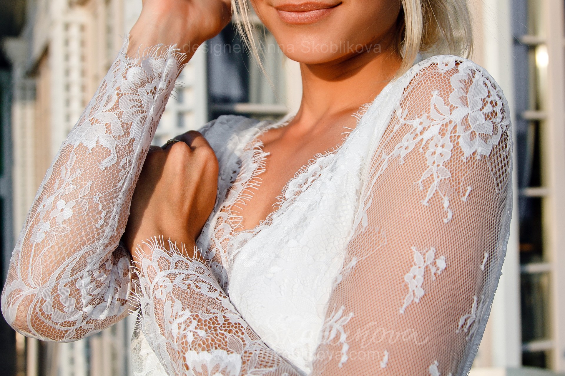 Short lace wedding dress with a v-neck cut from the front and deep cut from the back.
