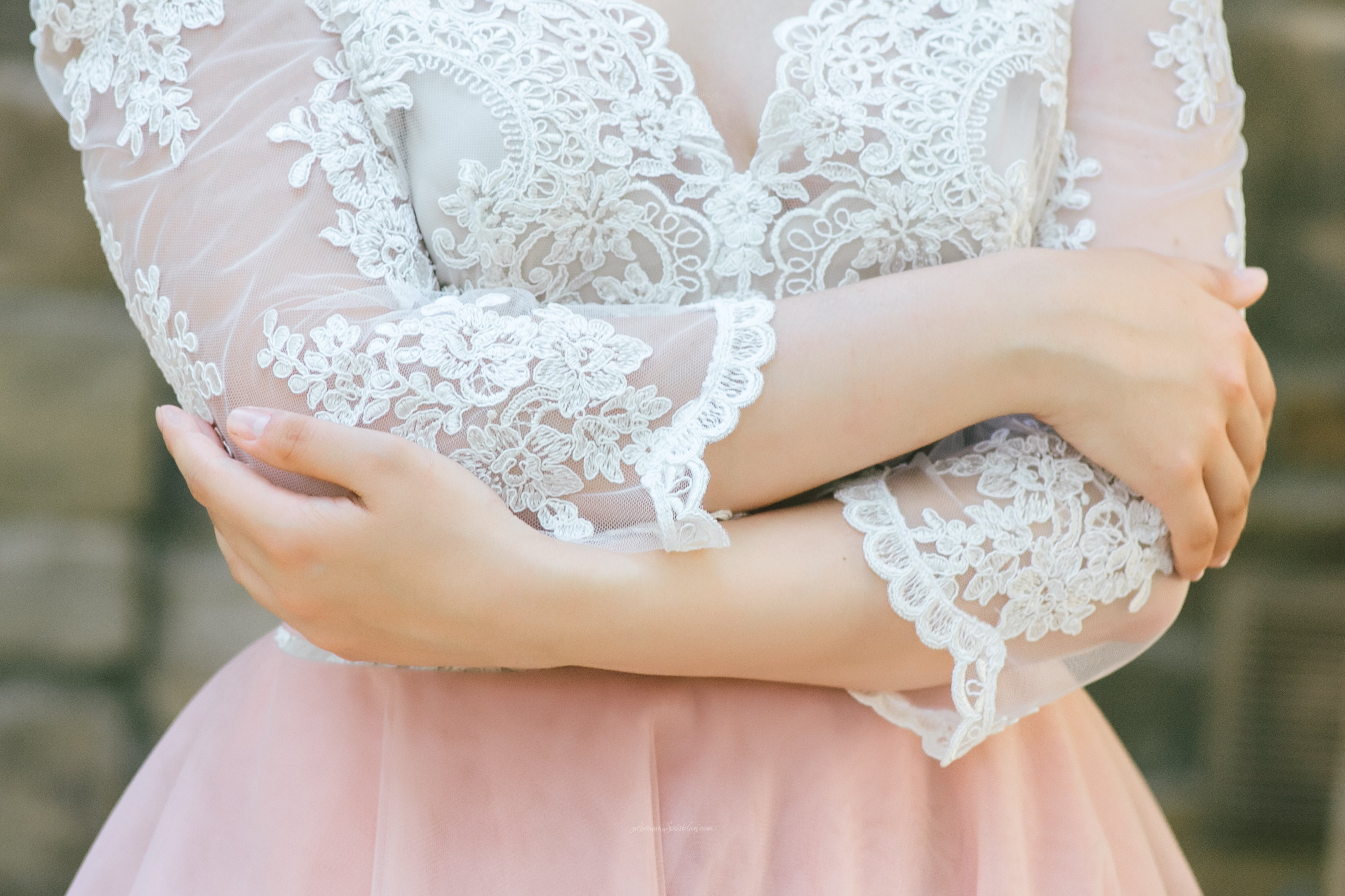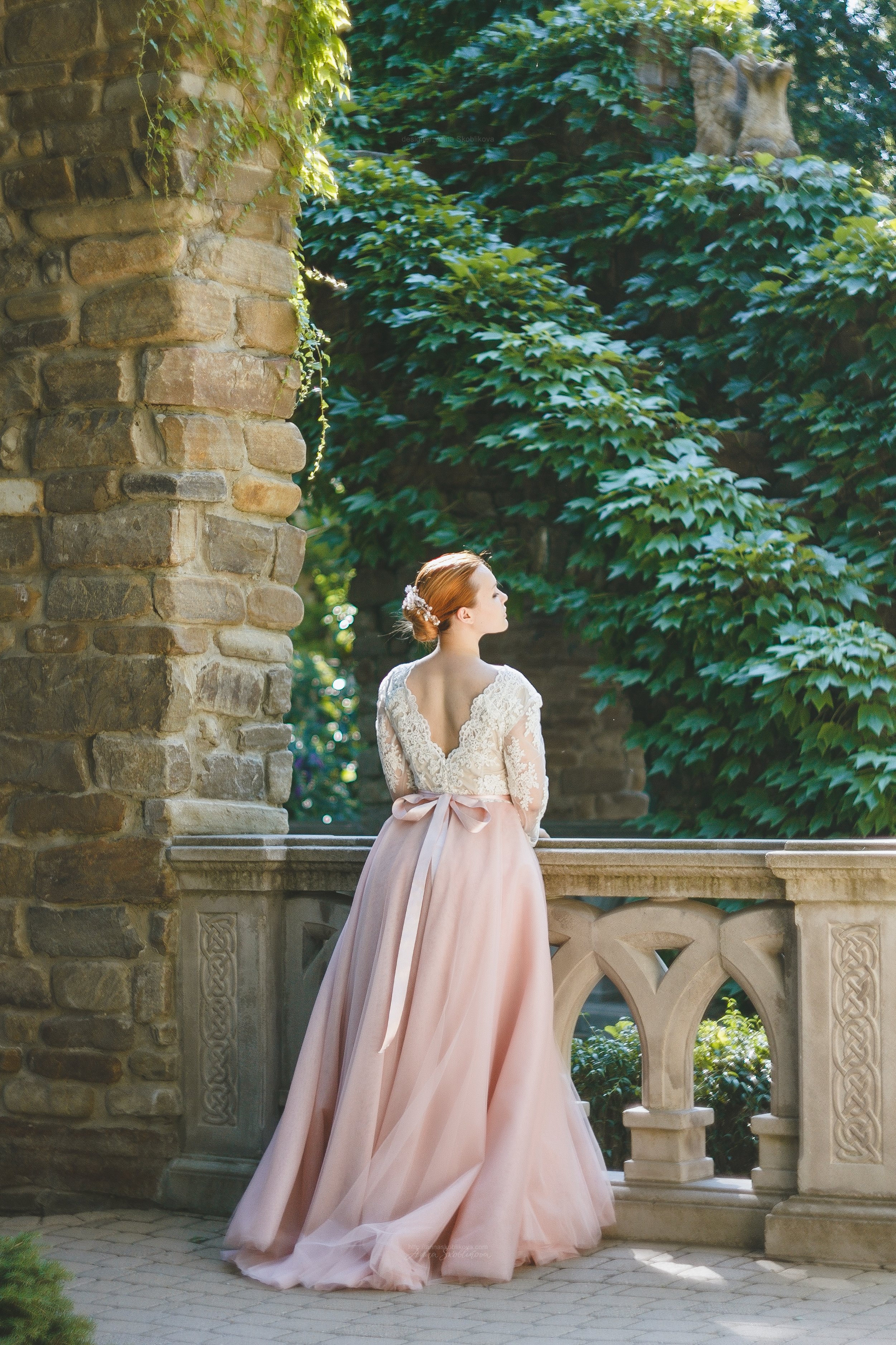 Princess silhouette gown with luxurious skirt of 8 tulle layeres. This high low hem skirt is completely seamless. Sleeves cover arms for 3/4. Bodice is made of cord lace, it’s front and back v-neck cut is decorated with lacy festoon. You can also chose the bodice to be made with or without the lining.