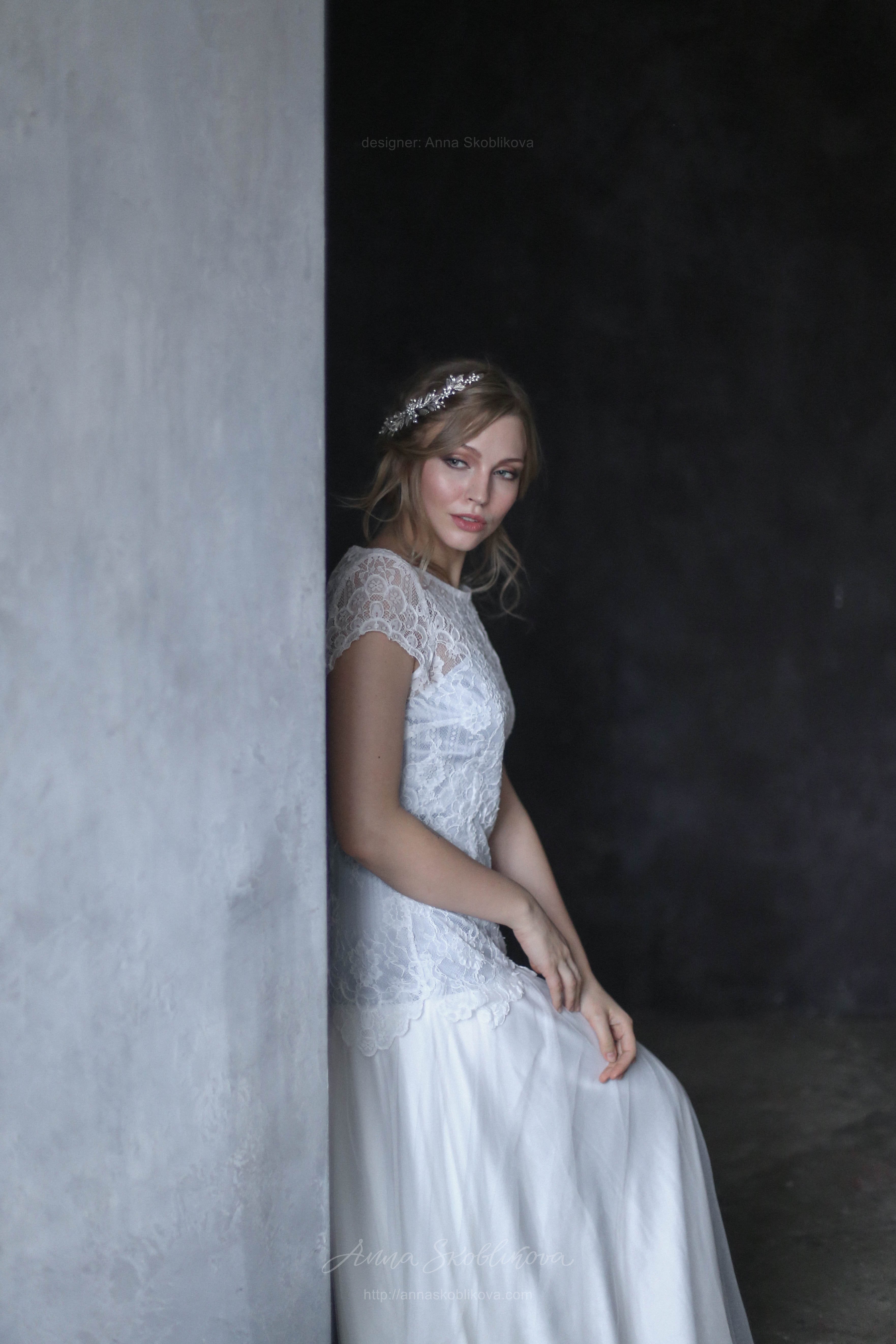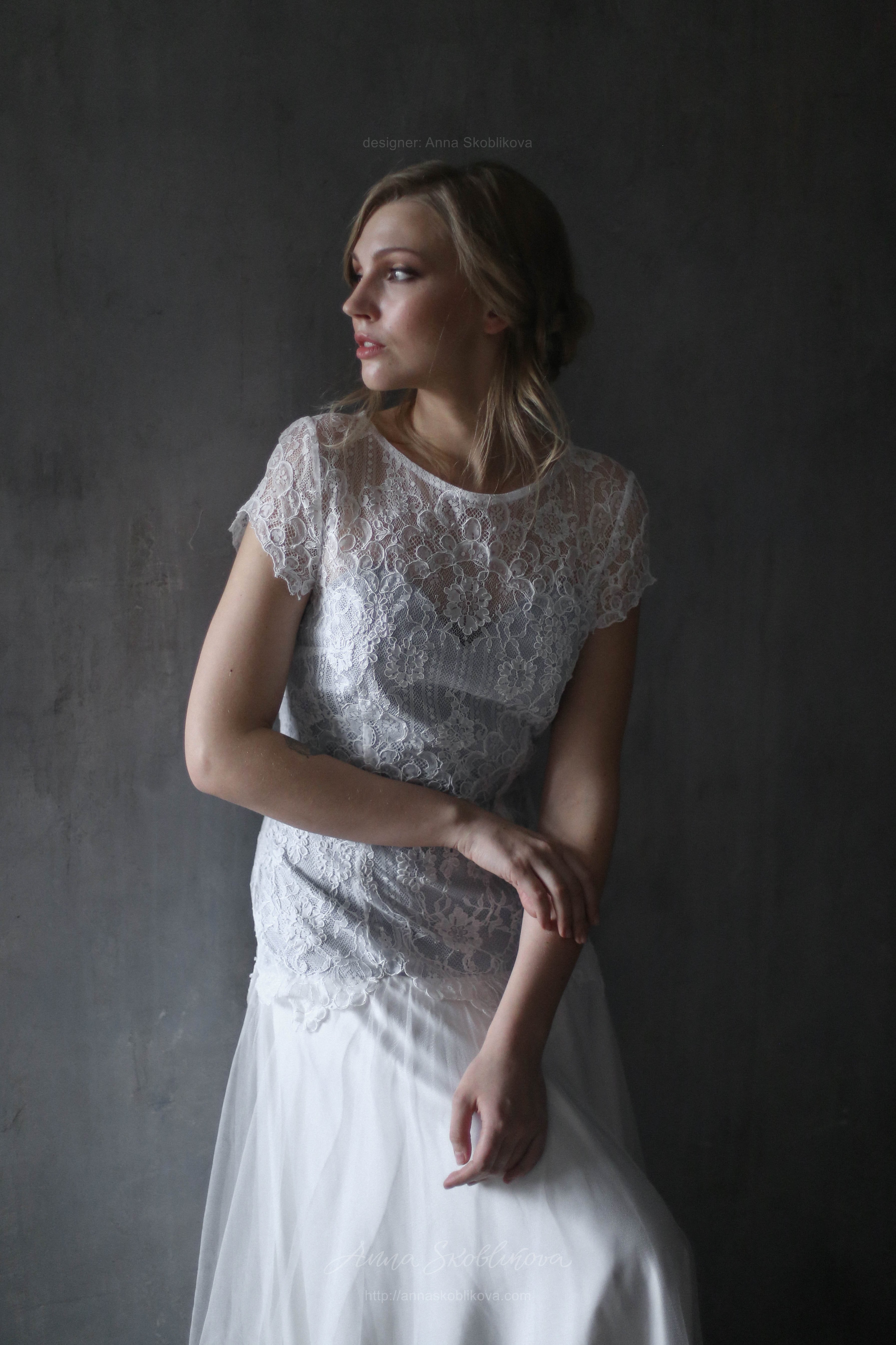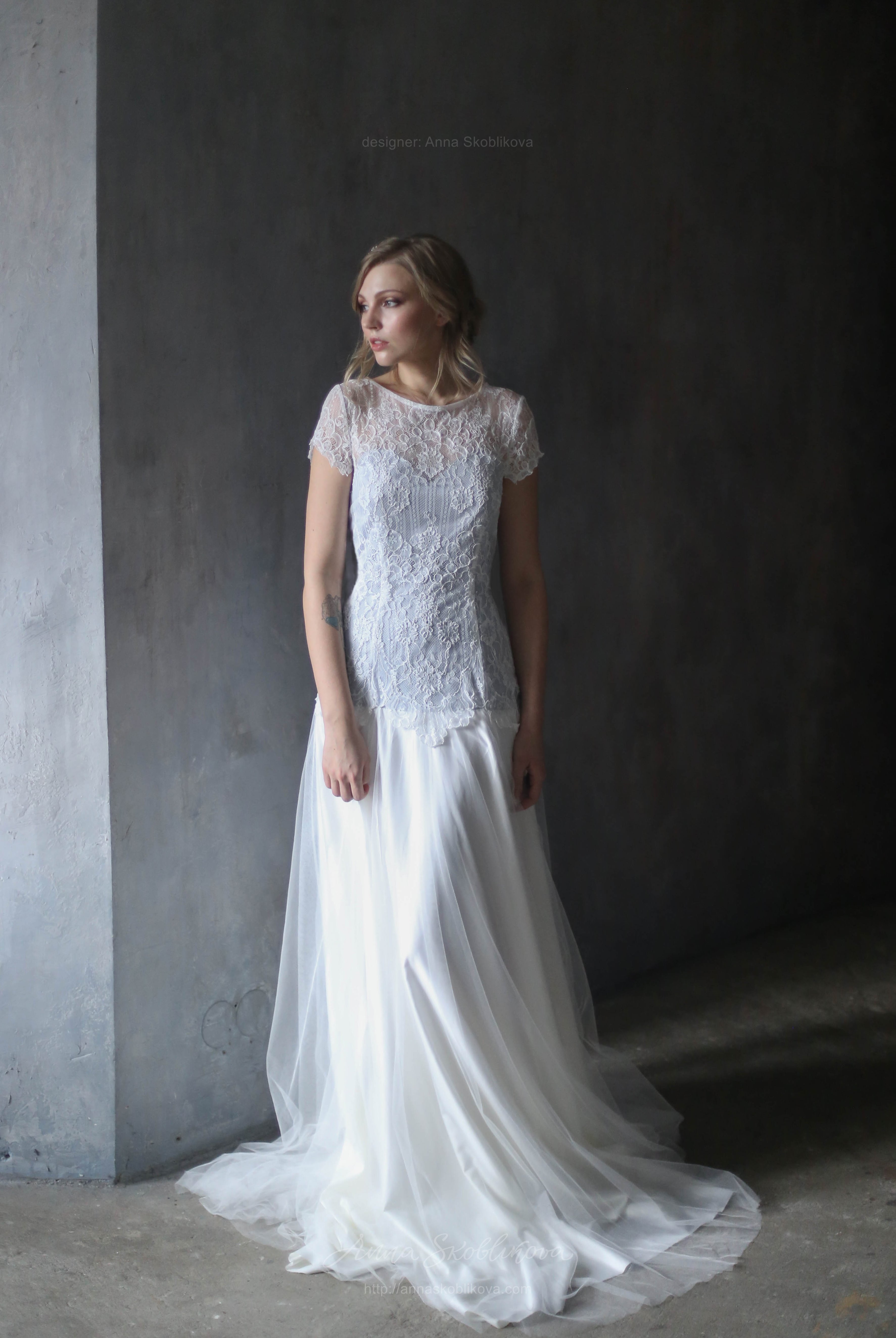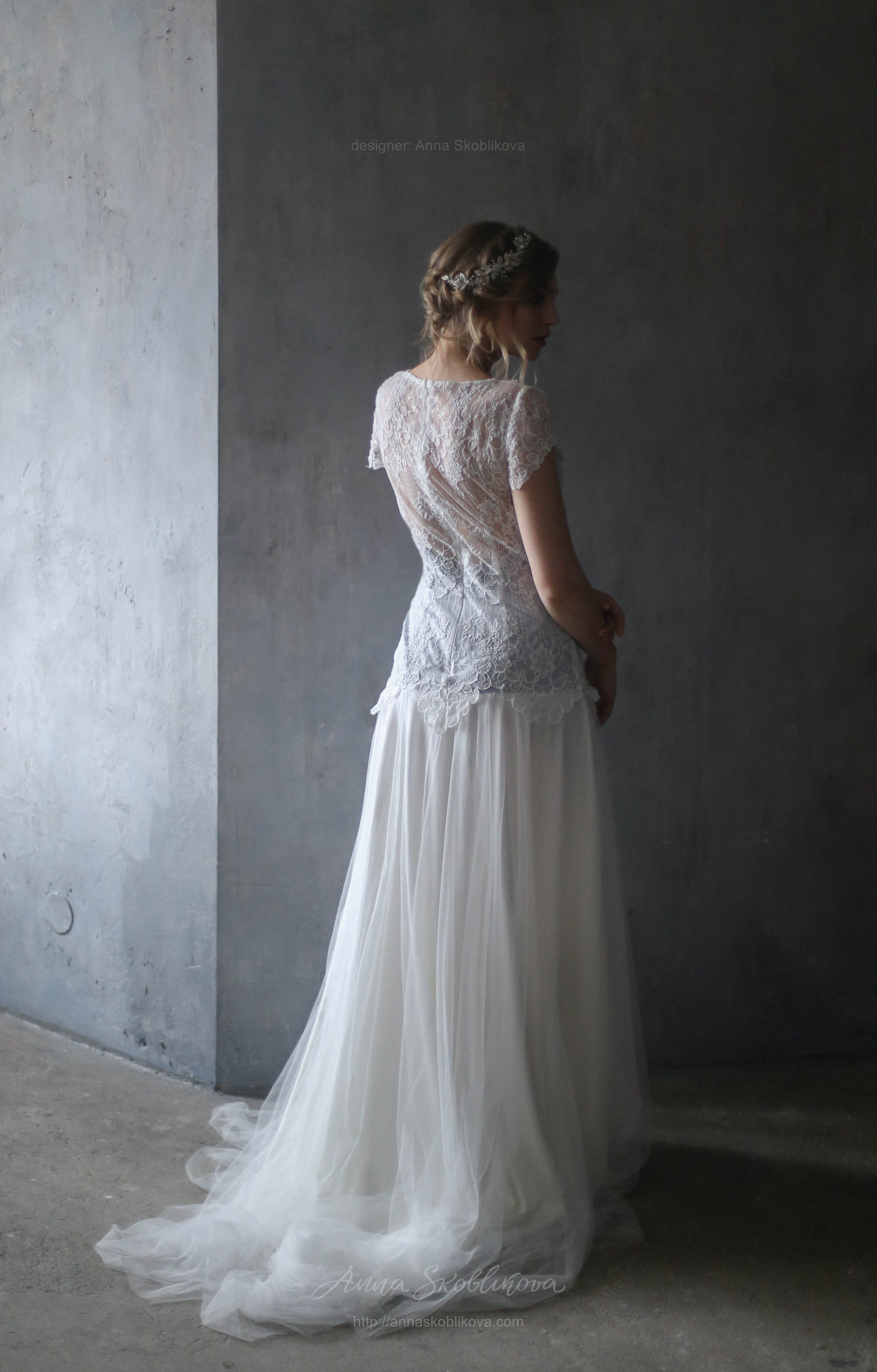 Tender, delicate wedding dress with beautiful lace stretching to the hips. Blue-grey lining. Skirt is of stretch satin and thin Italian net. Sleeves are shortened