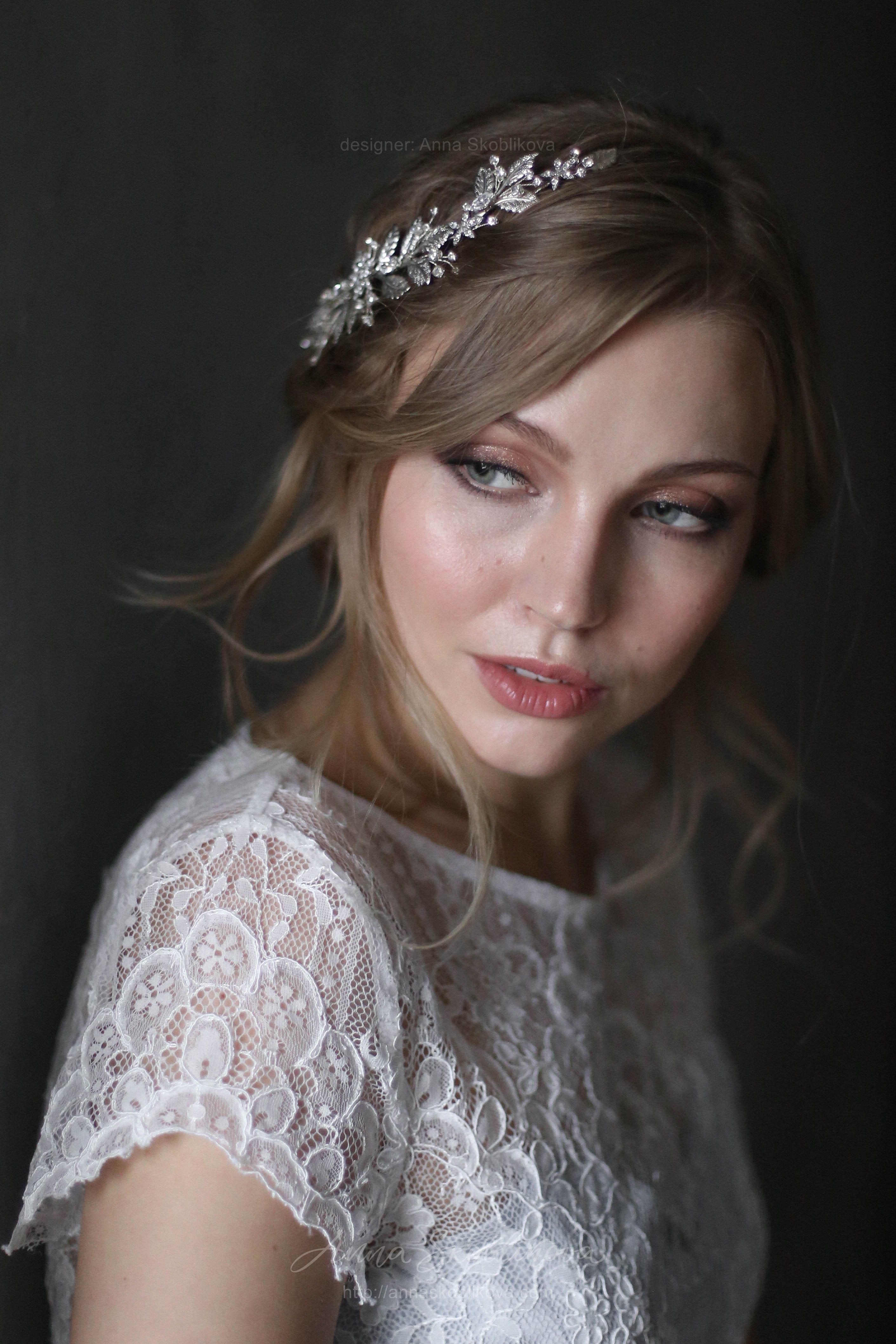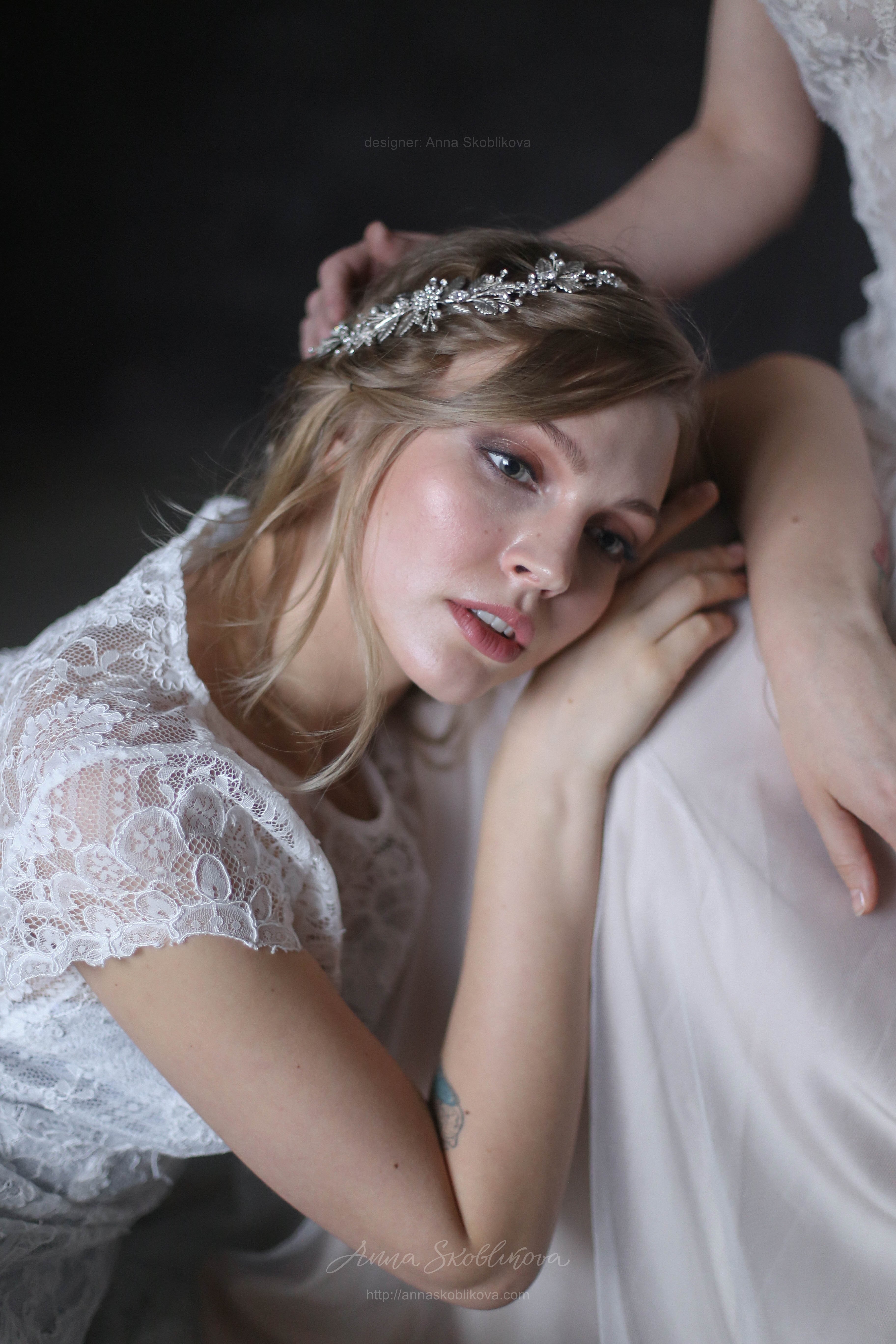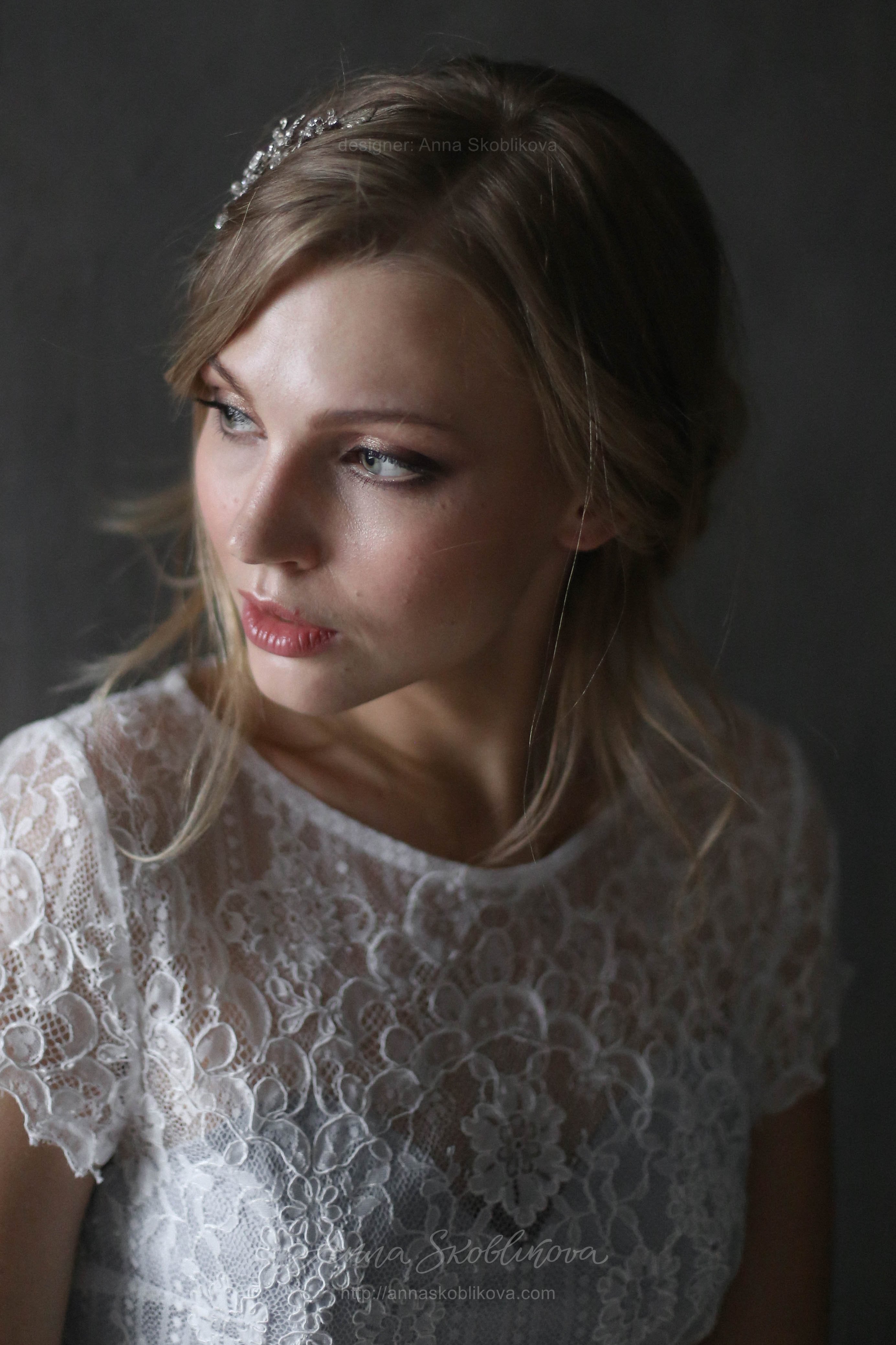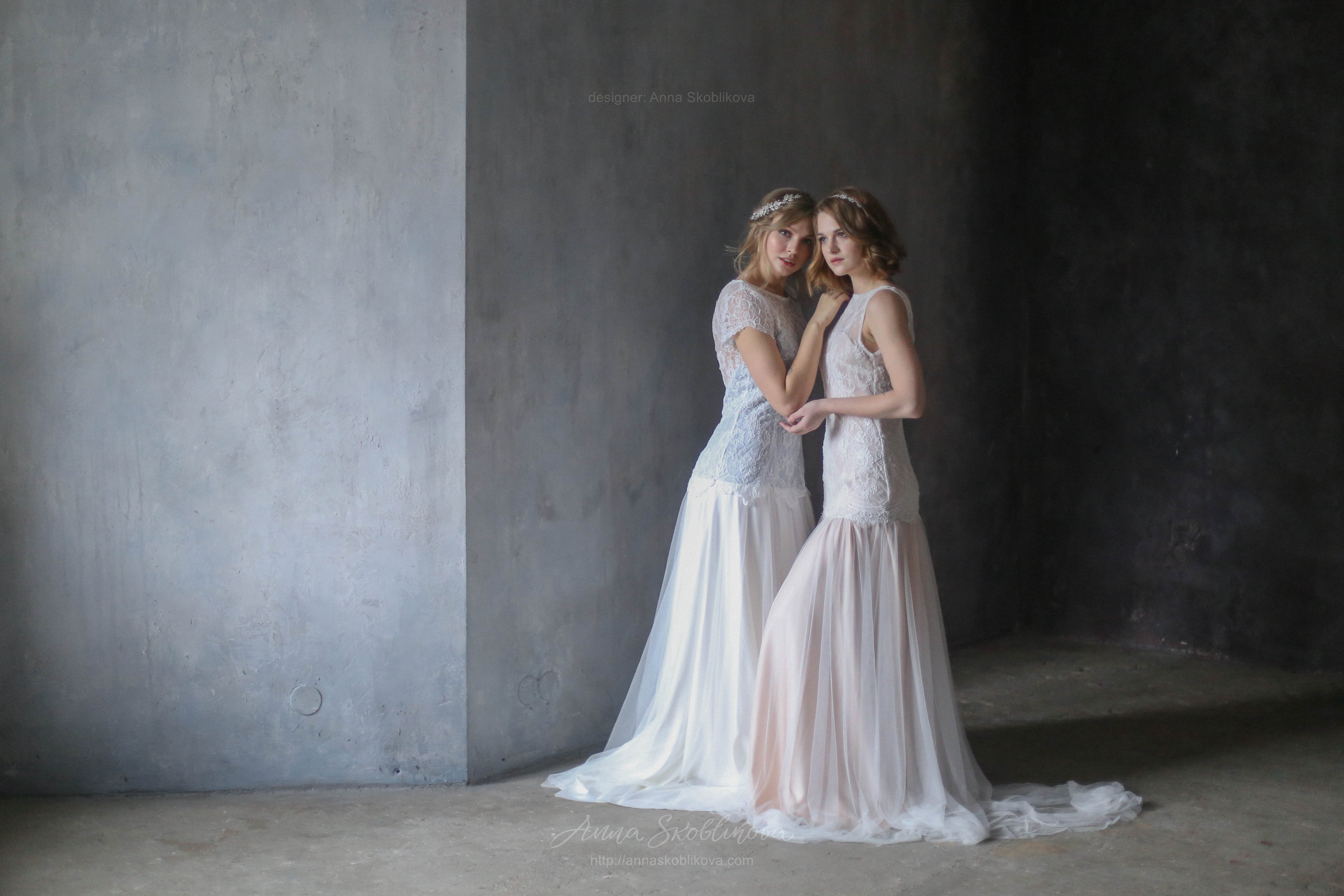Tender, delicate wedding dress with beautiful lace stretching to the hips. Blue-grey lining. Skirt is of stretch satin and thin Italian net. Sleeves are shortened