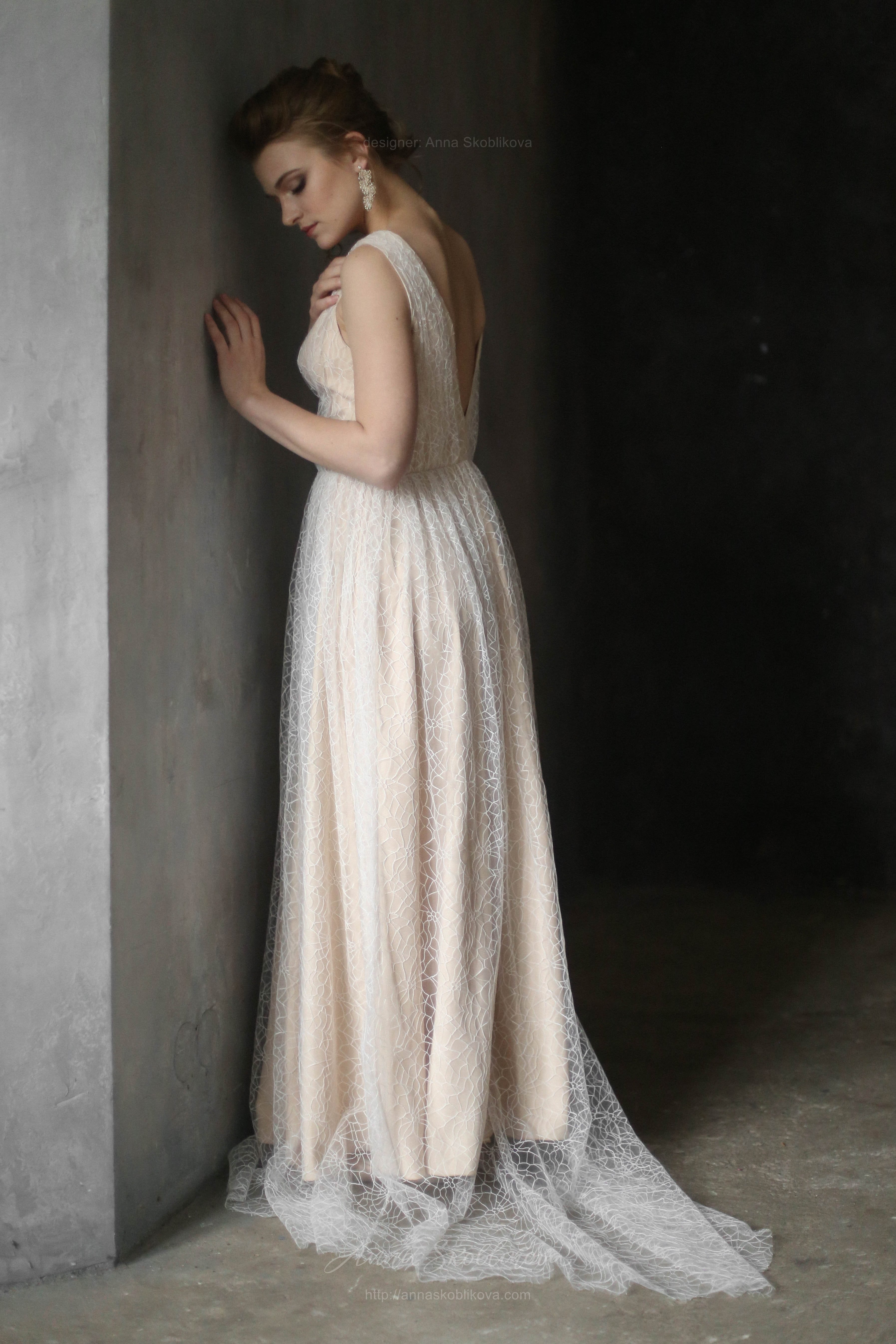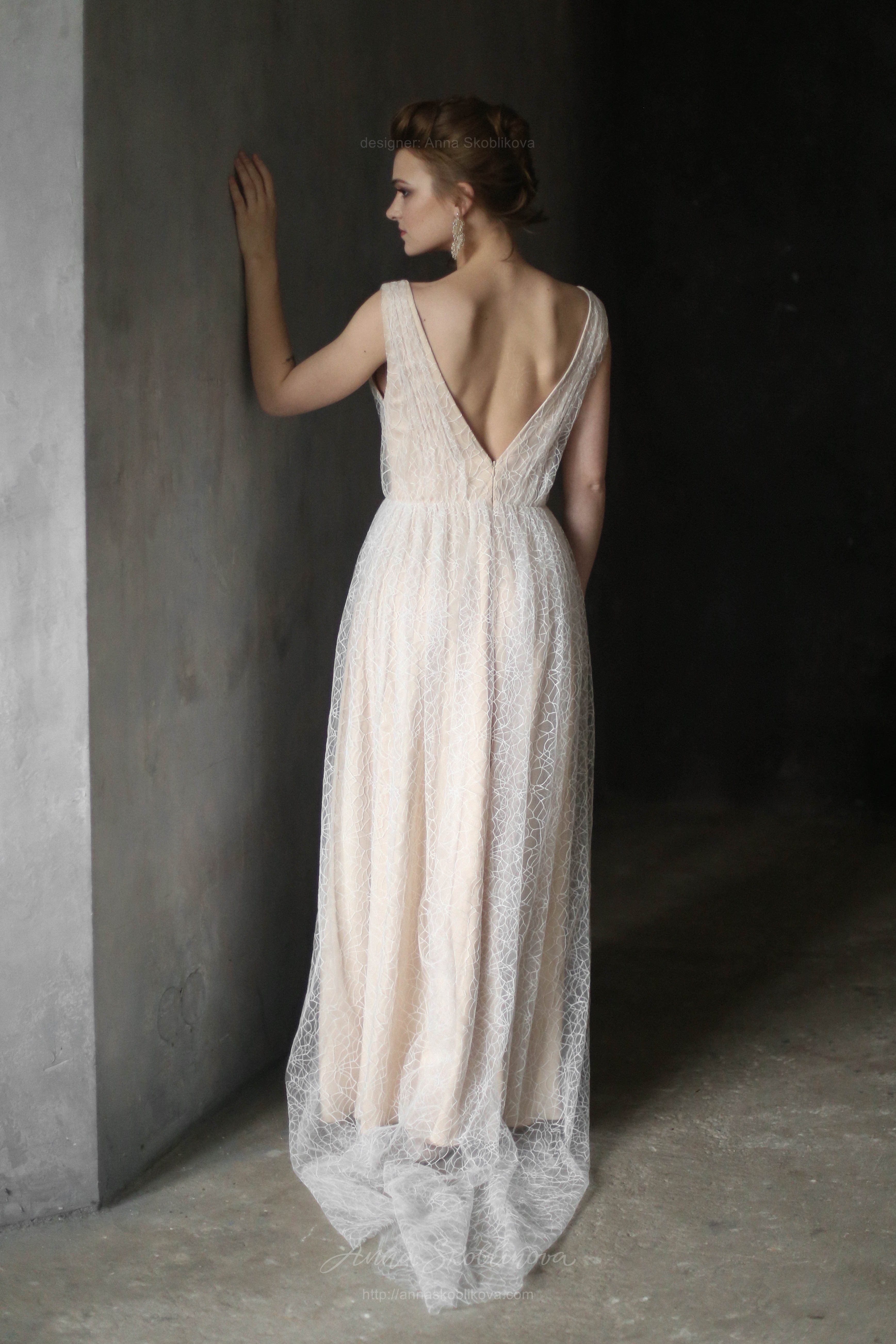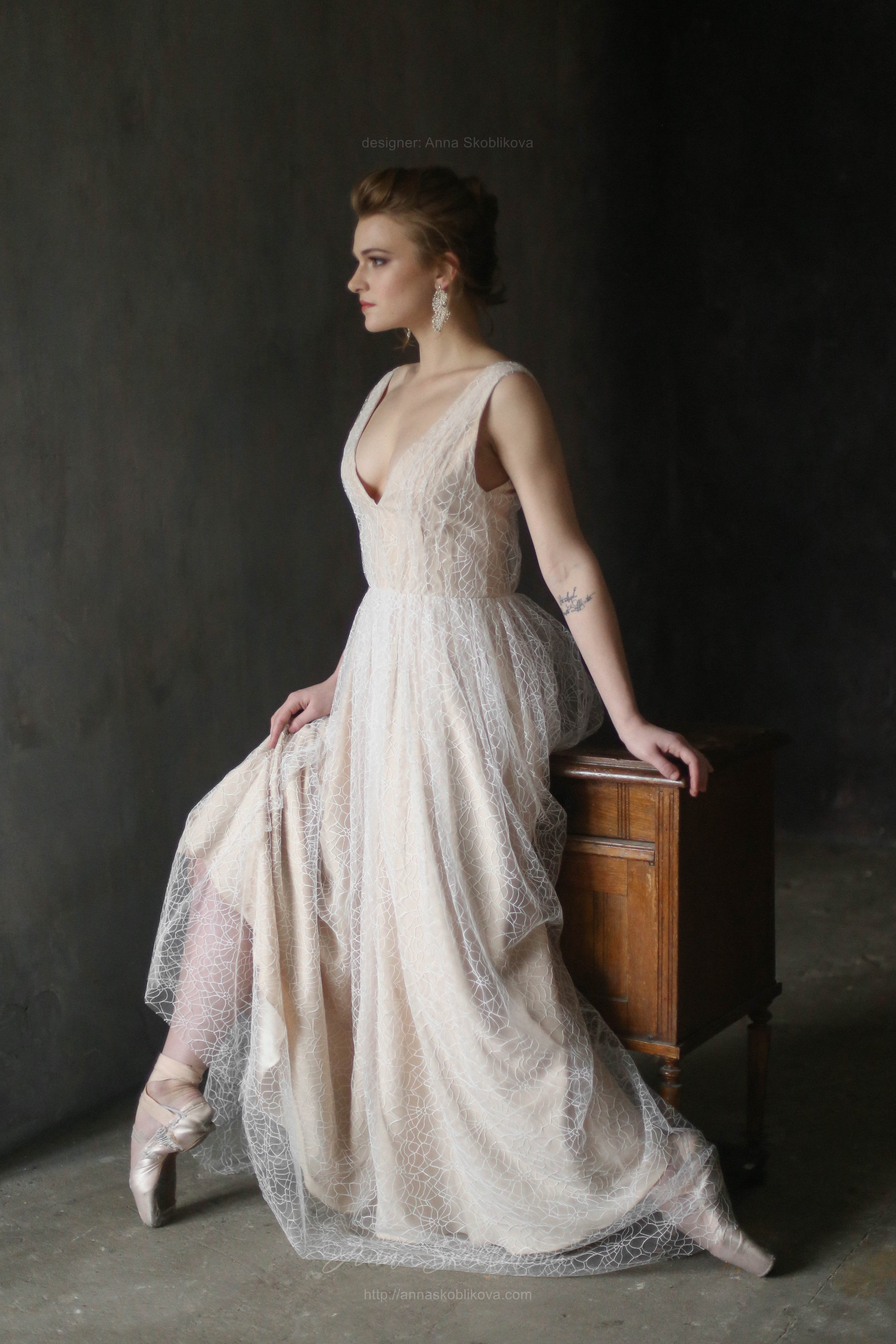 Tender mesh dress with slightly visible pattern. Flesh colour lining emphasize beautiful texture of the dress. It has front and back neckline. Fastens with a zipper. You can order the dress with any other color of the lining.