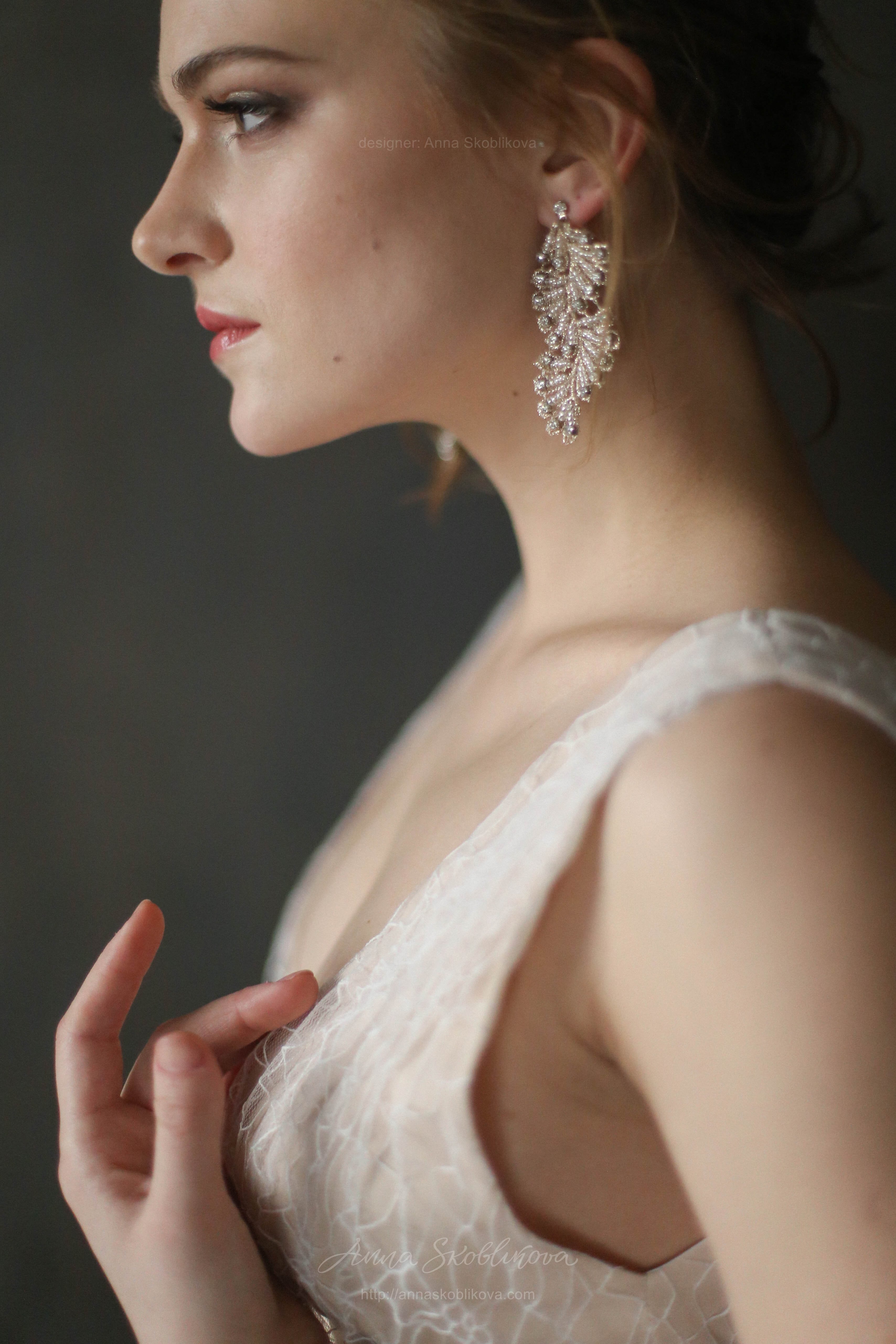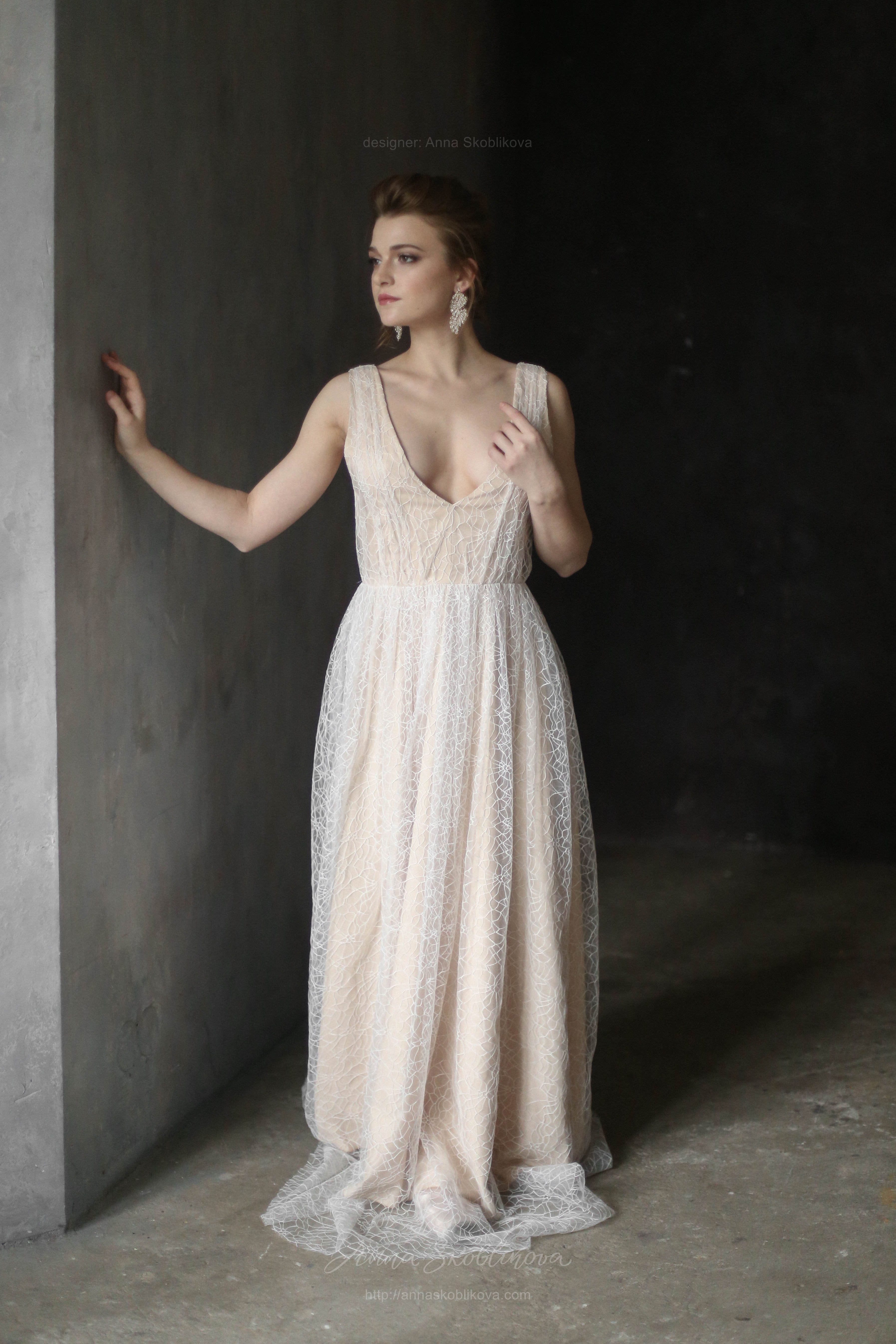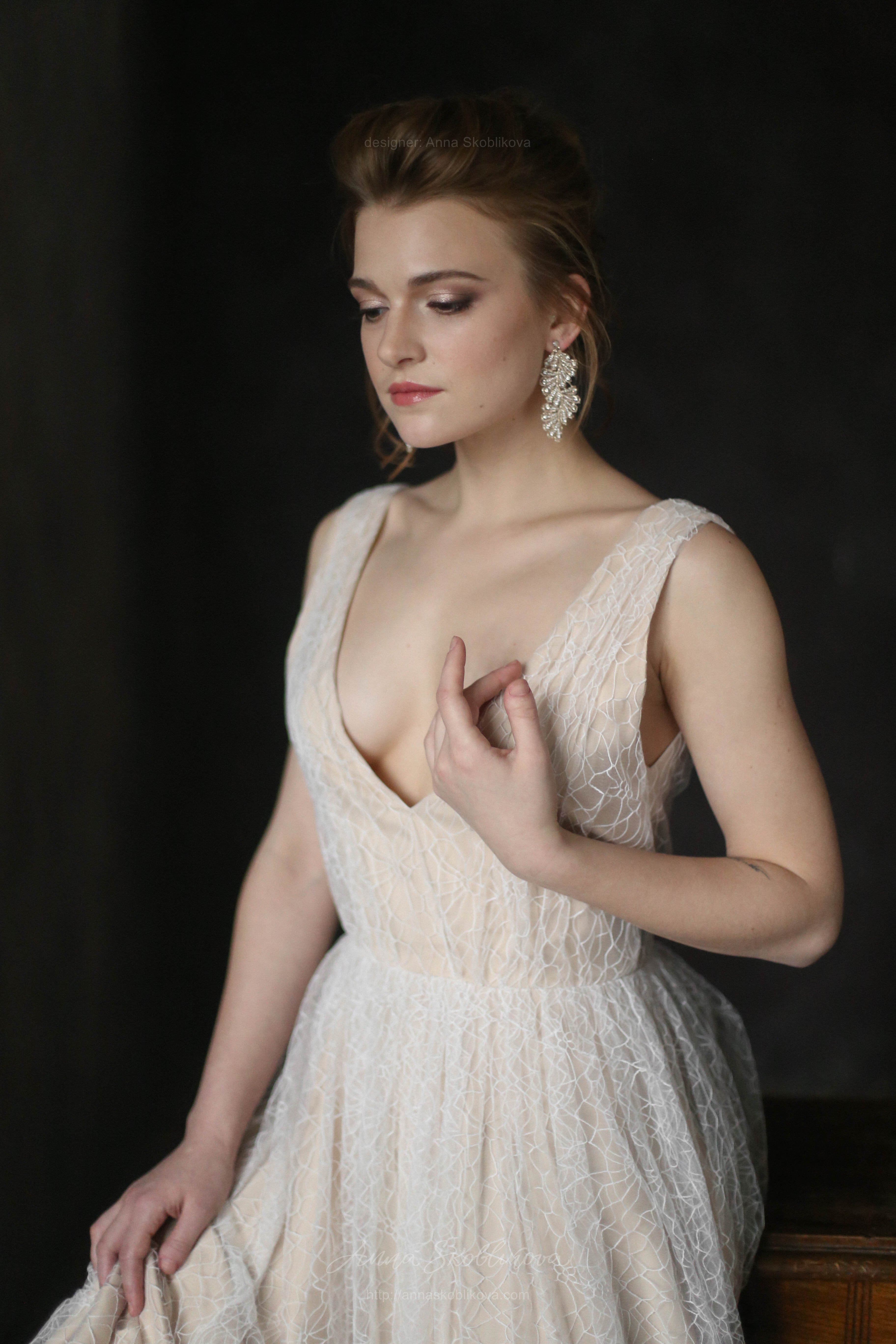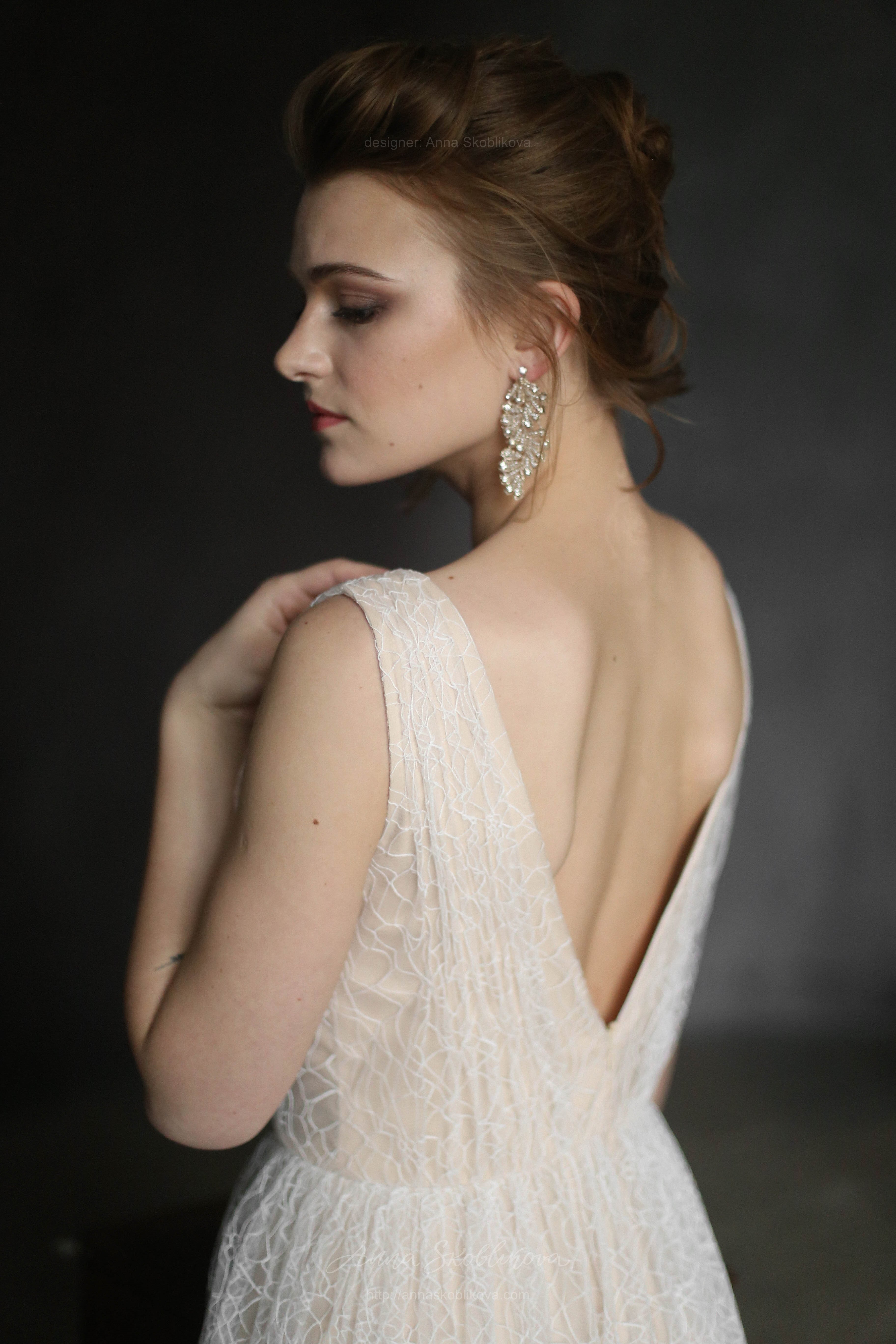 Tender mesh dress with slightly visible pattern. Flesh colour lining emphasize beautiful texture of the dress. It has front and back neckline. Fastens with a zipper. You can order the dress with any other color of the lining.