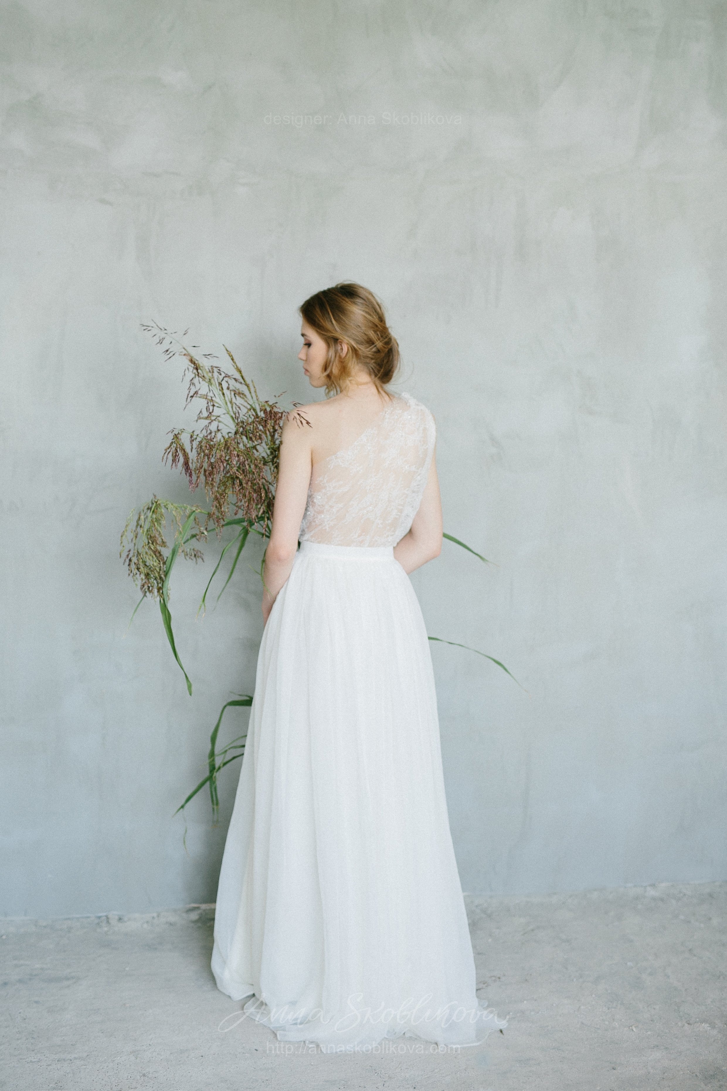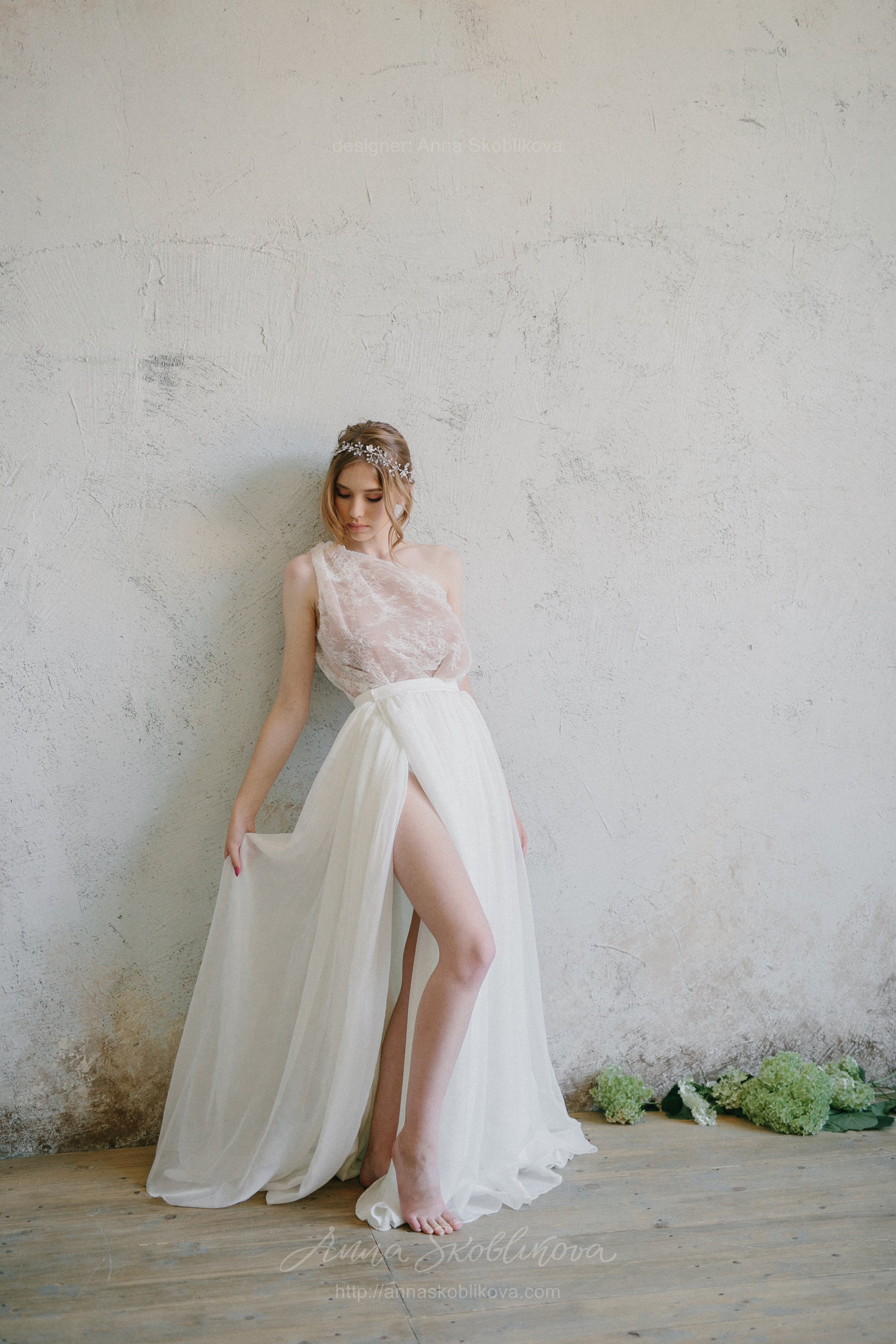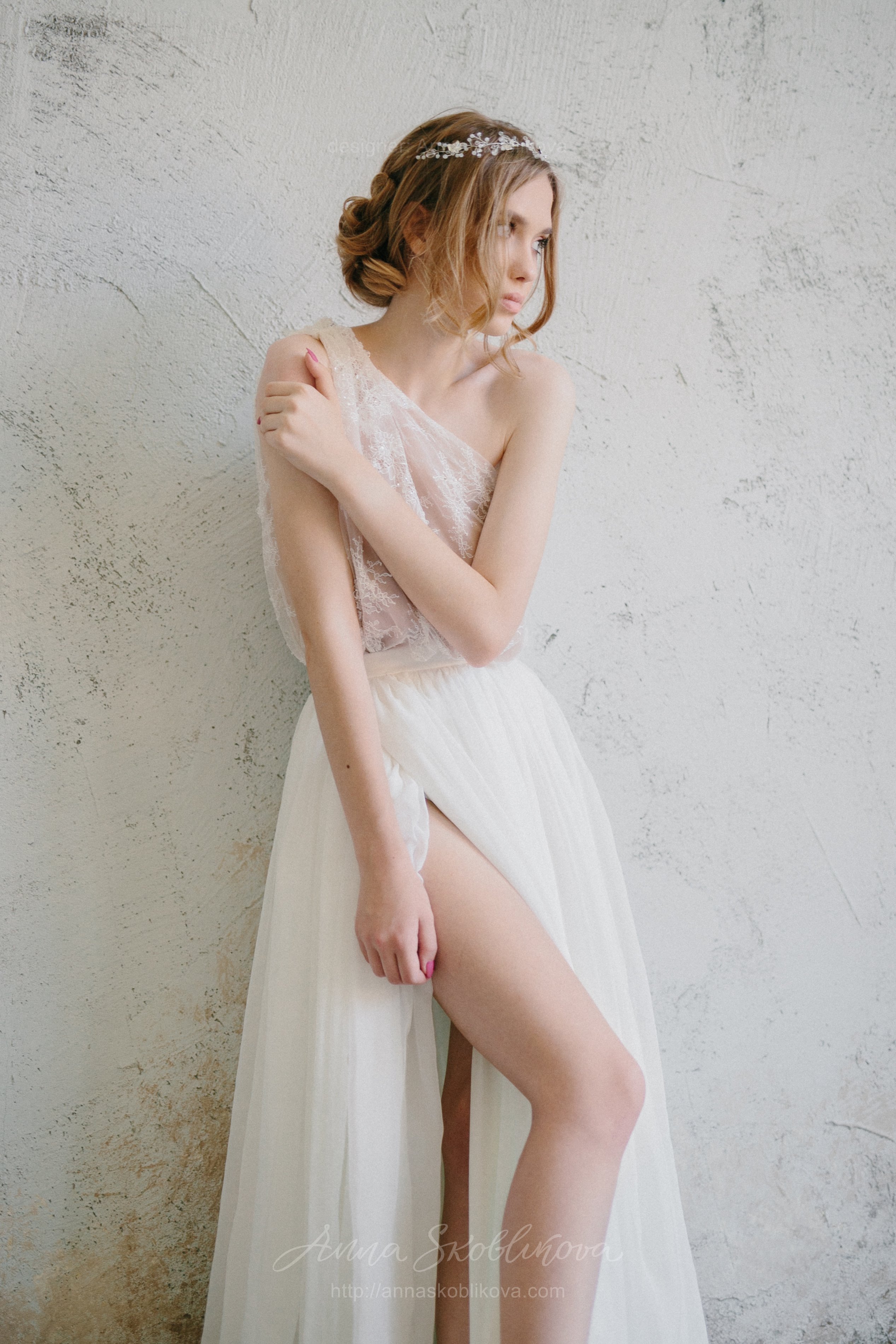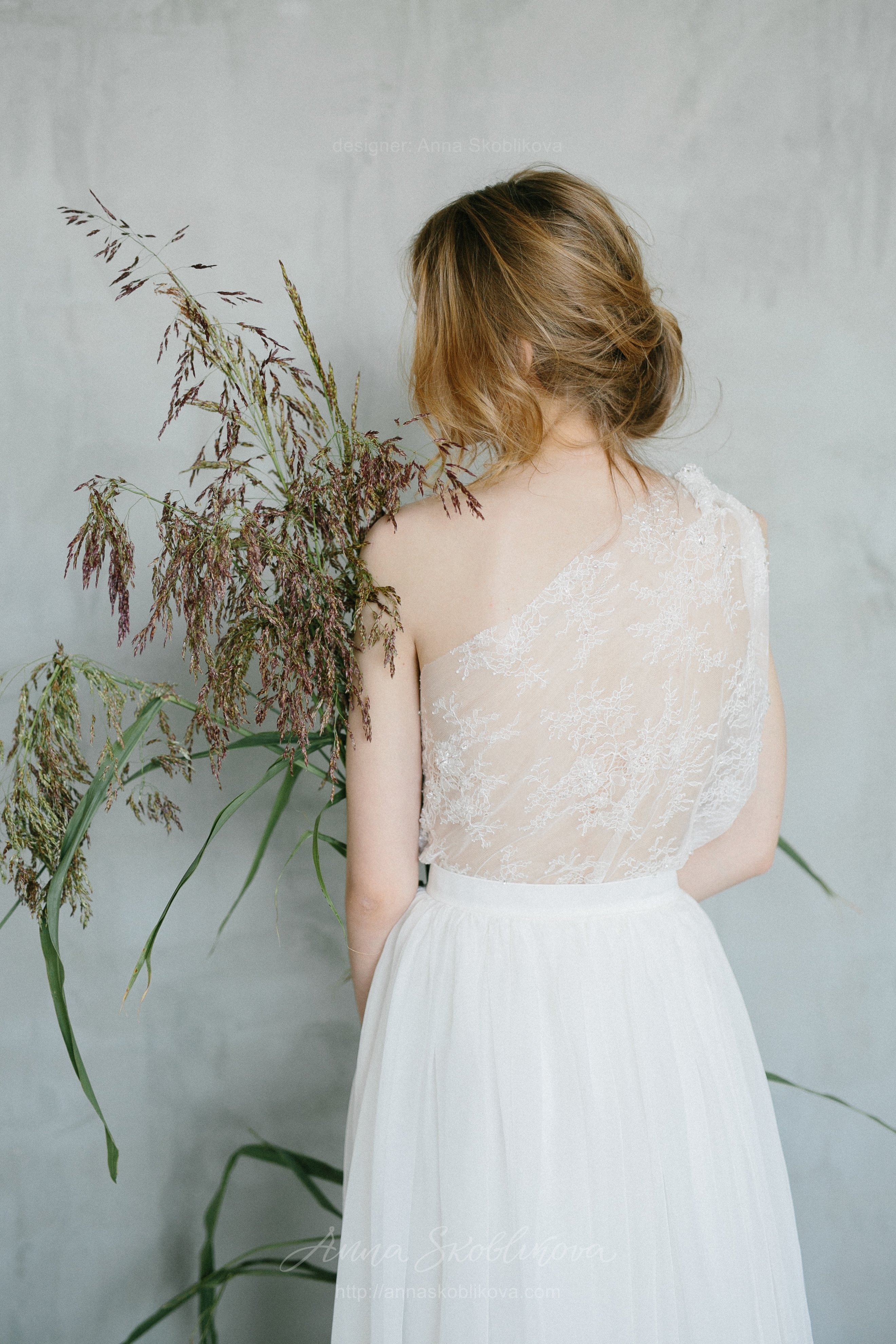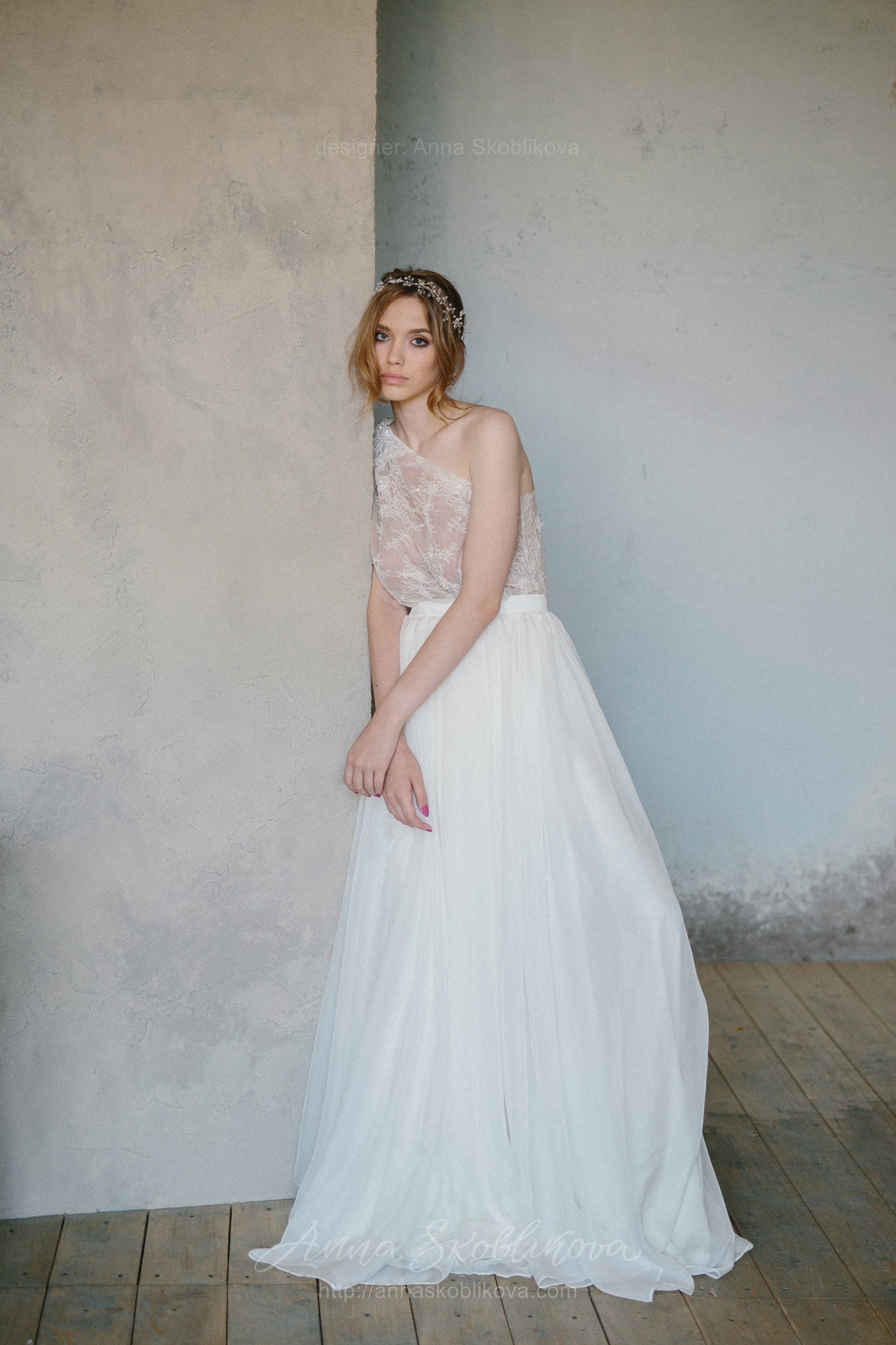 Two piece wedding dress from top and wrap skirt. Unusual asymmetric set from chiffon multilayered skirt and top with one shoulder strap manually embroidered with rhinestones and beads. Due to this special wrap-skirts design there is a cut seen during the walk. The top is made from lace and has a hidden net lining, which makes the top not so dense but rather a bit transparent. Nevertheless, this won’t make your underwear and breasts fully visible.
