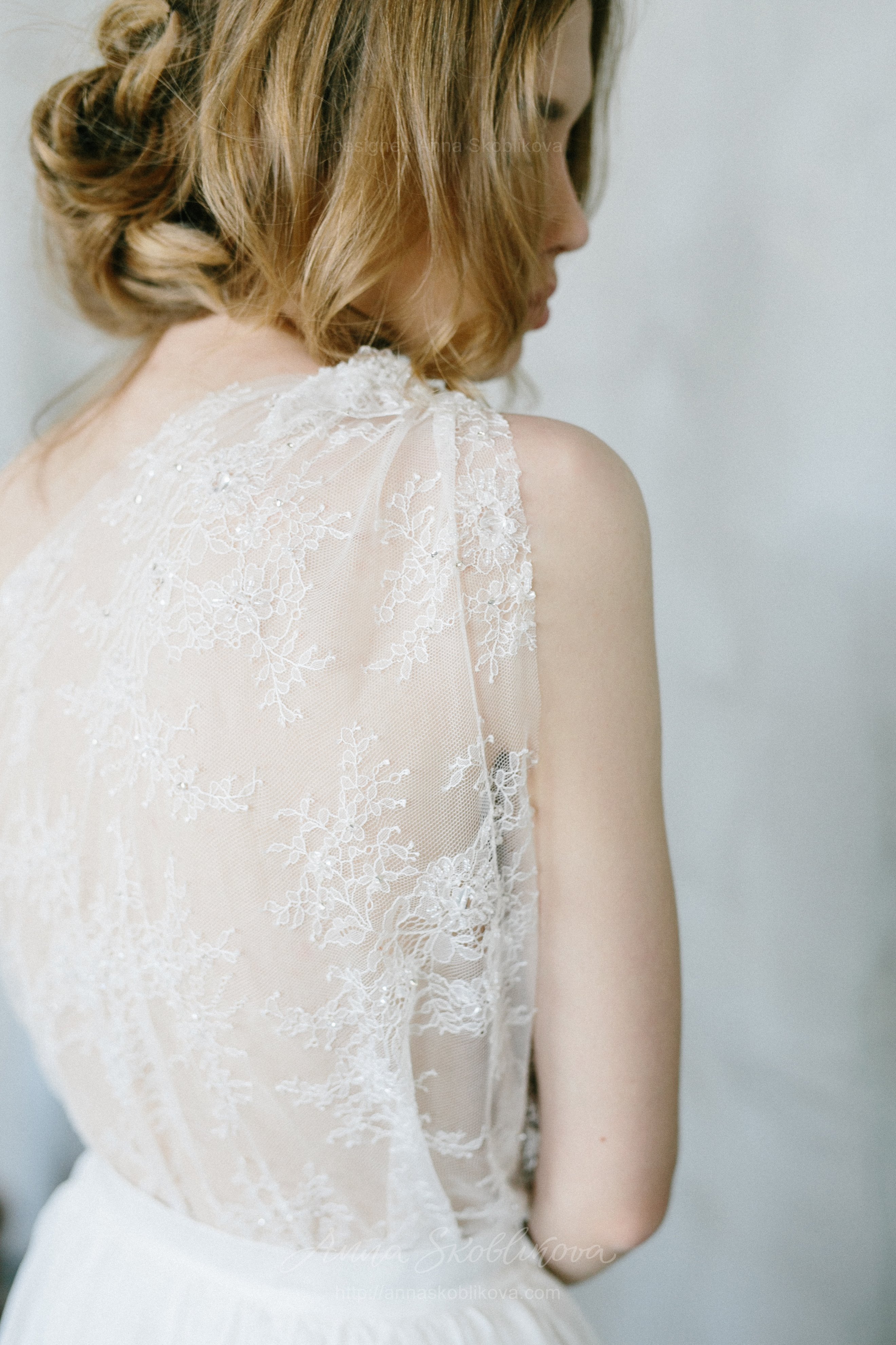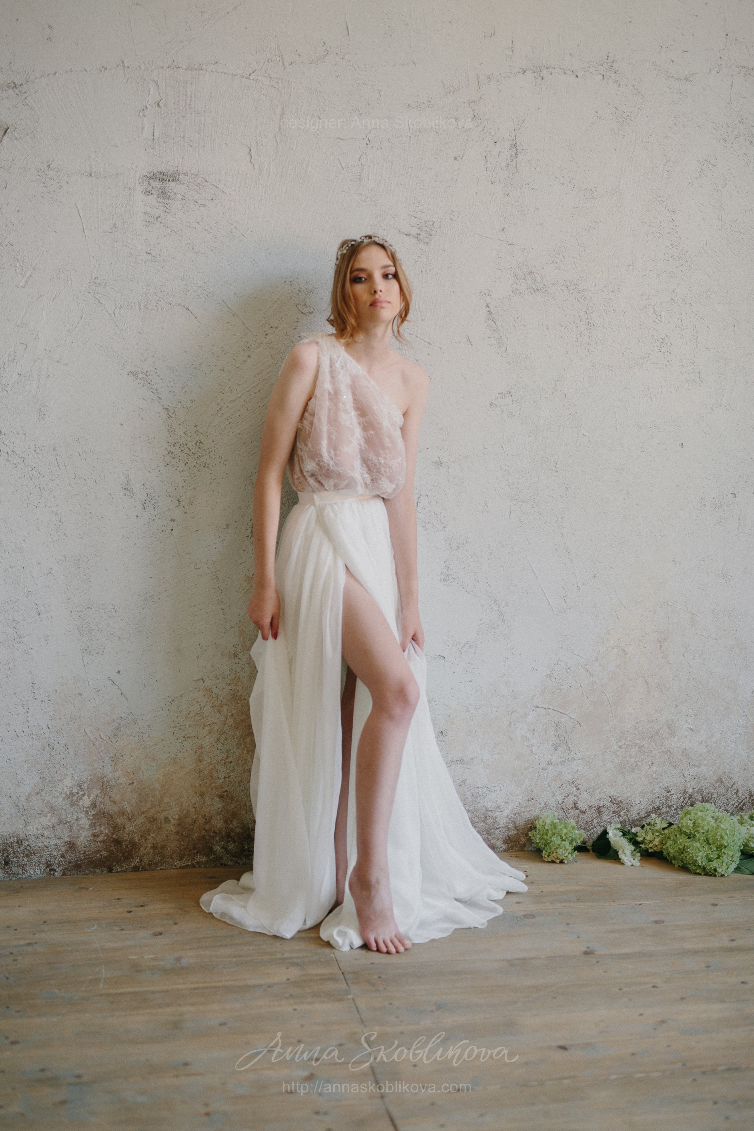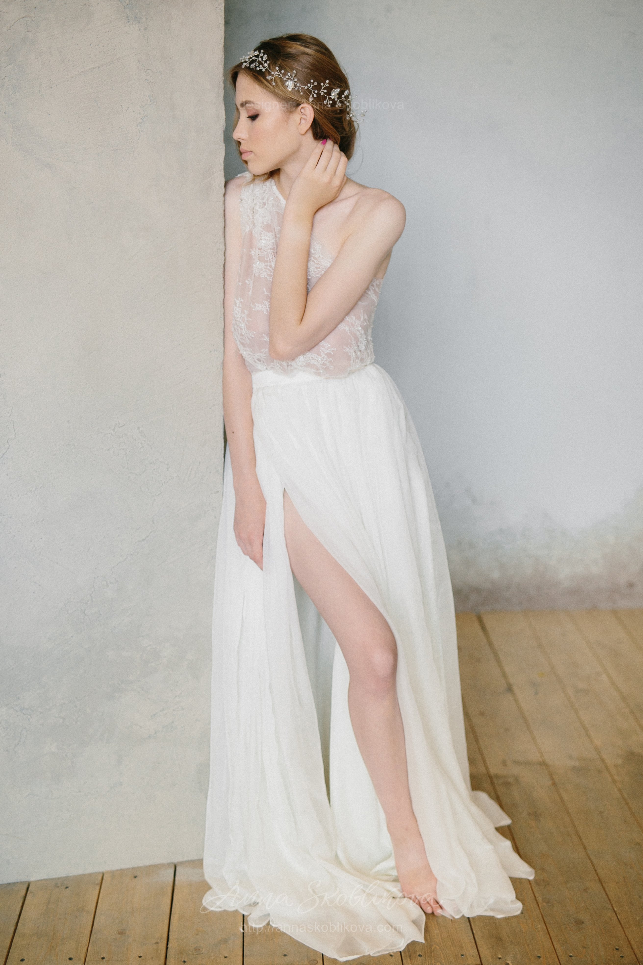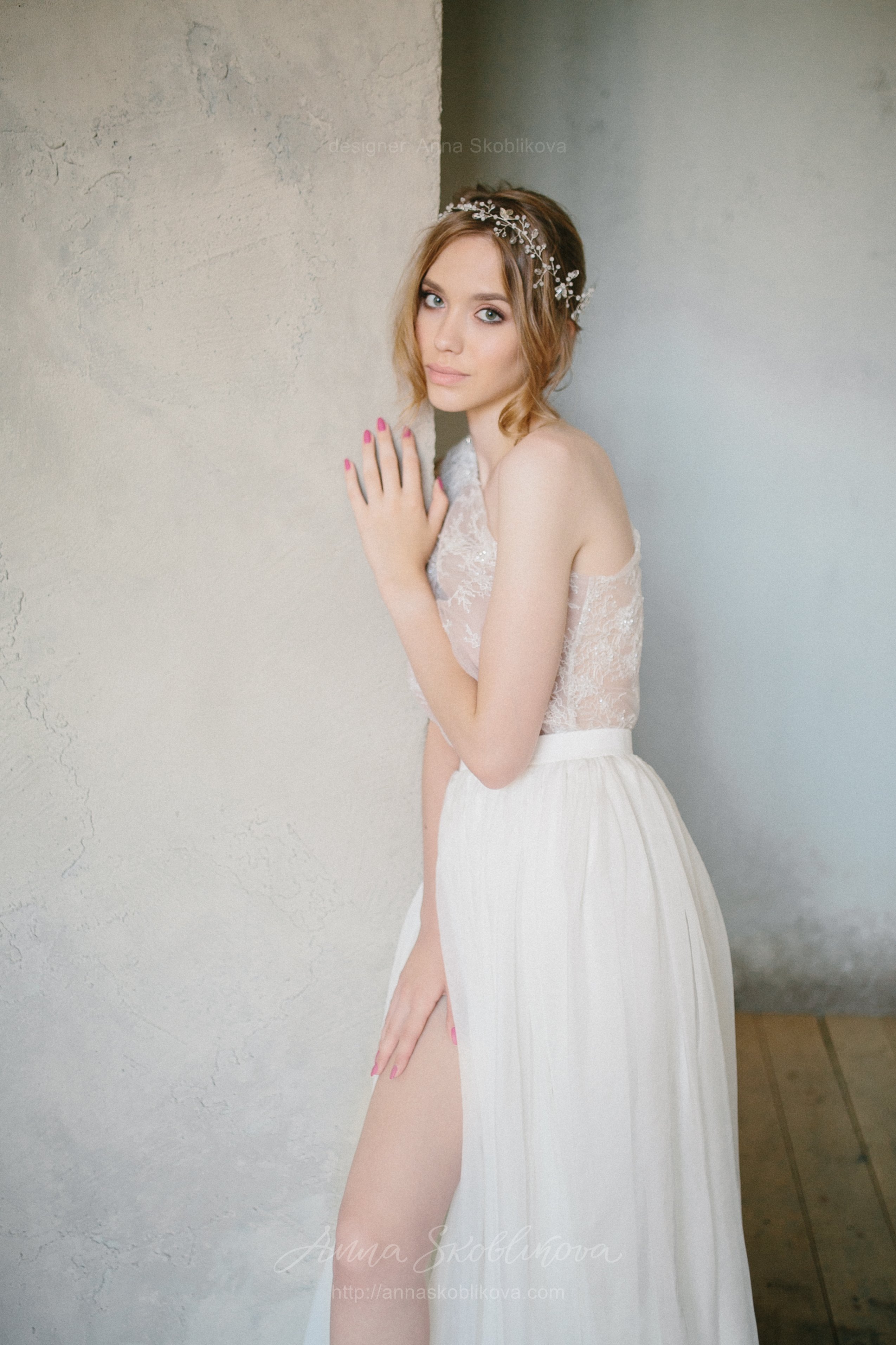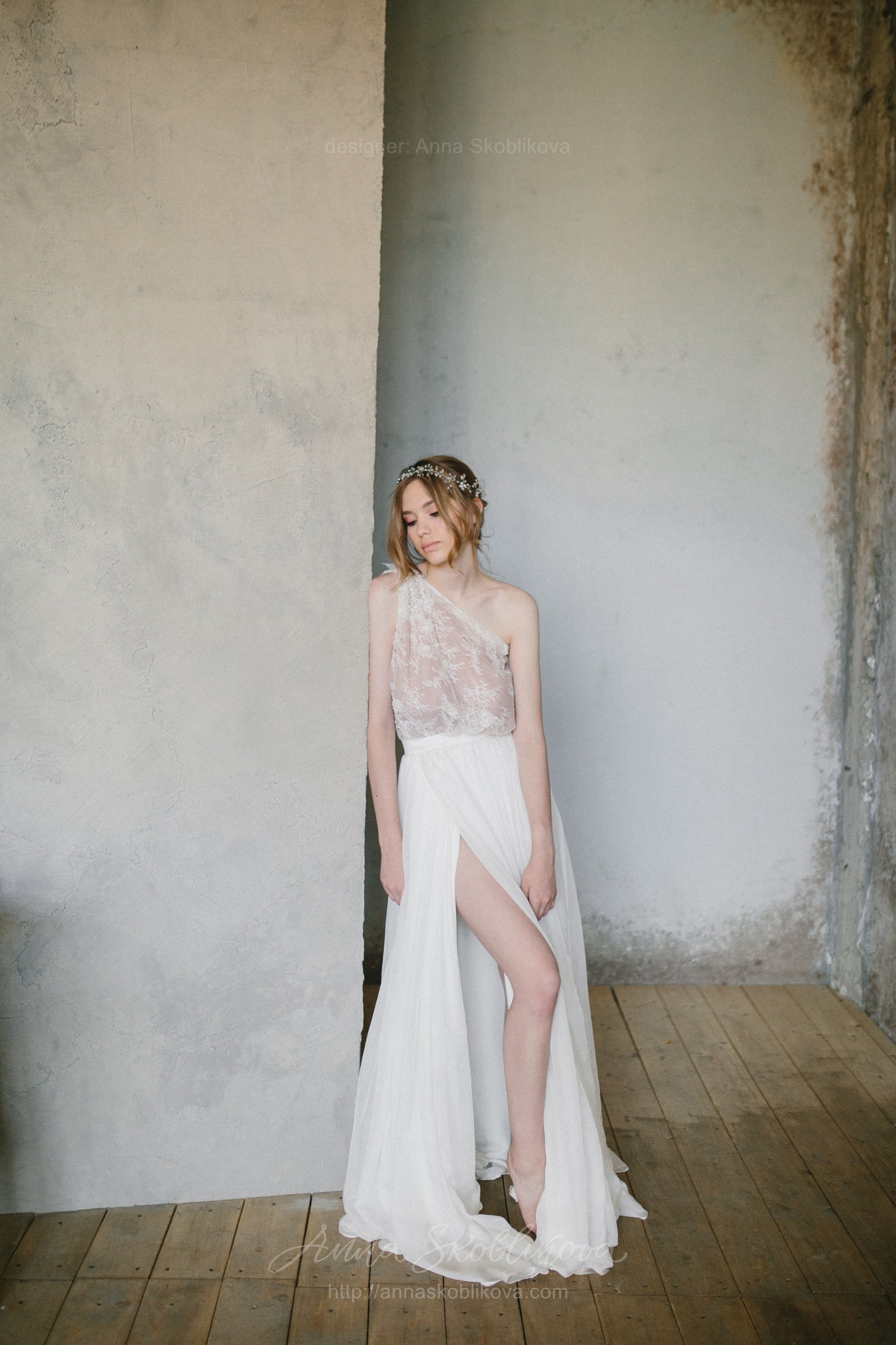 Two piece wedding dress from top and wrap skirt. Unusual asymmetric set from chiffon multilayered skirt and top with one shoulder strap manually embroidered with rhinestones and beads. Due to this special wrap-skirts design there is a cut seen during the walk. The top is made from lace and has a hidden net lining, which makes the top not so dense but rather a bit transparent. Nevertheless, this won’t make your underwear and breasts fully visible.