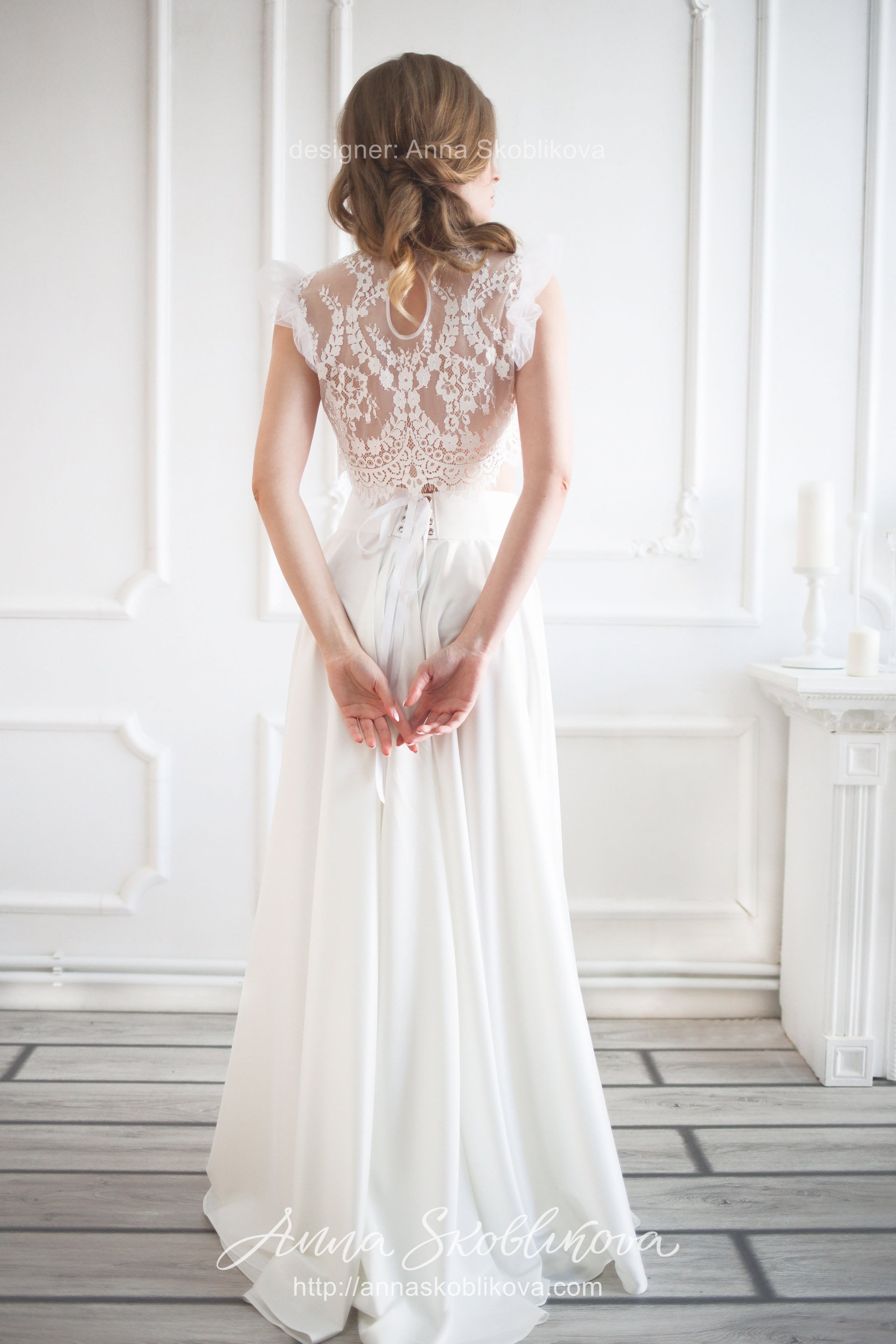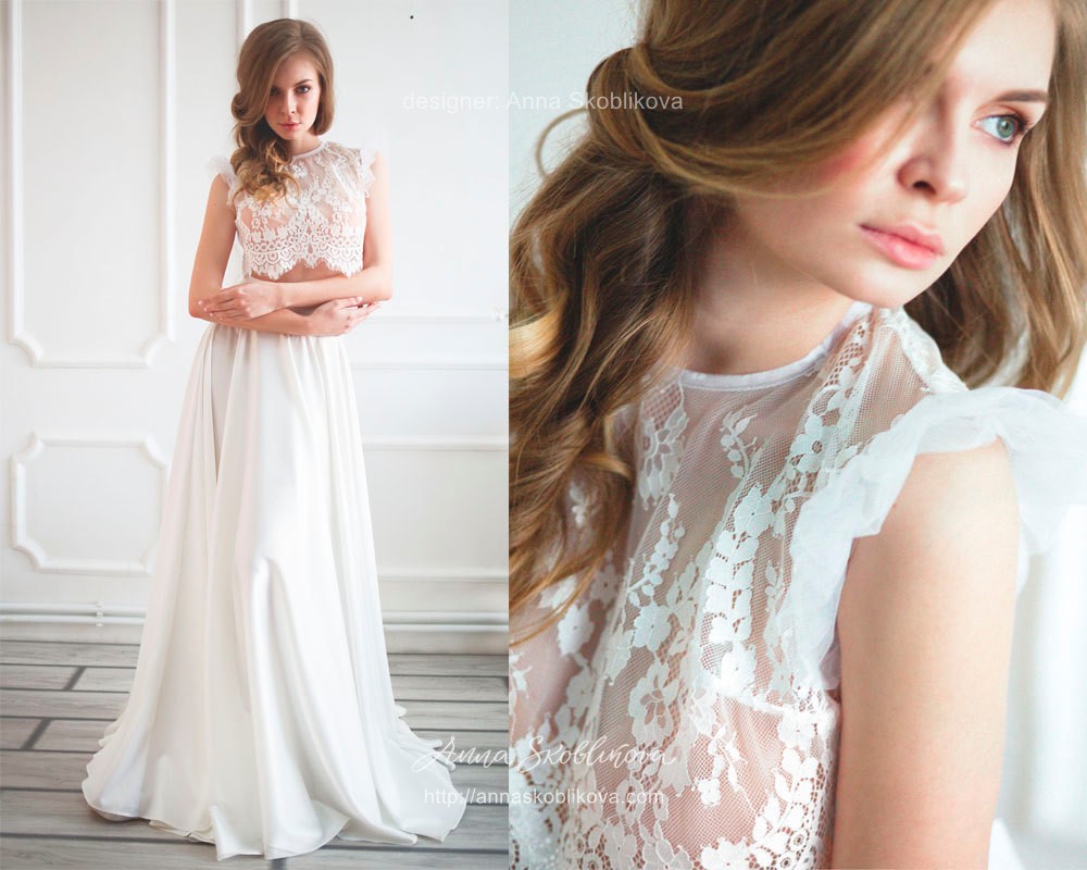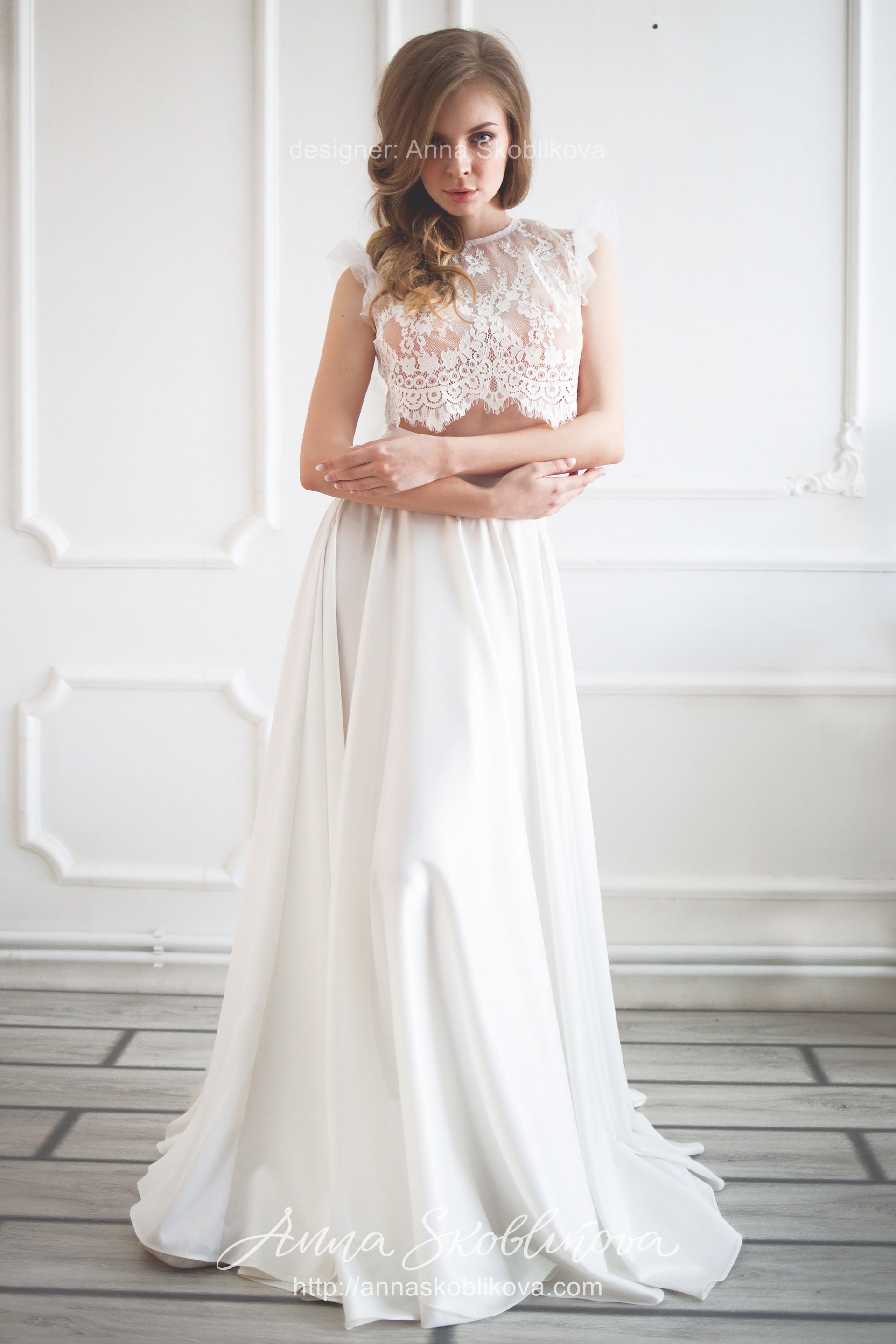 Wedding 2 piece dress: short lace top and bias cut skirt.