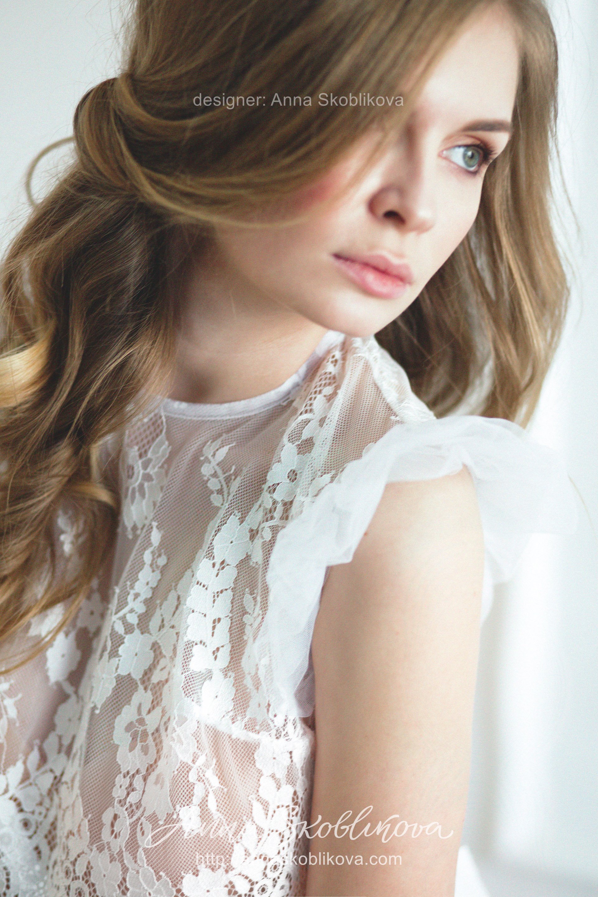 Lace top features unusual sleeves and is fastened from behind on neck.