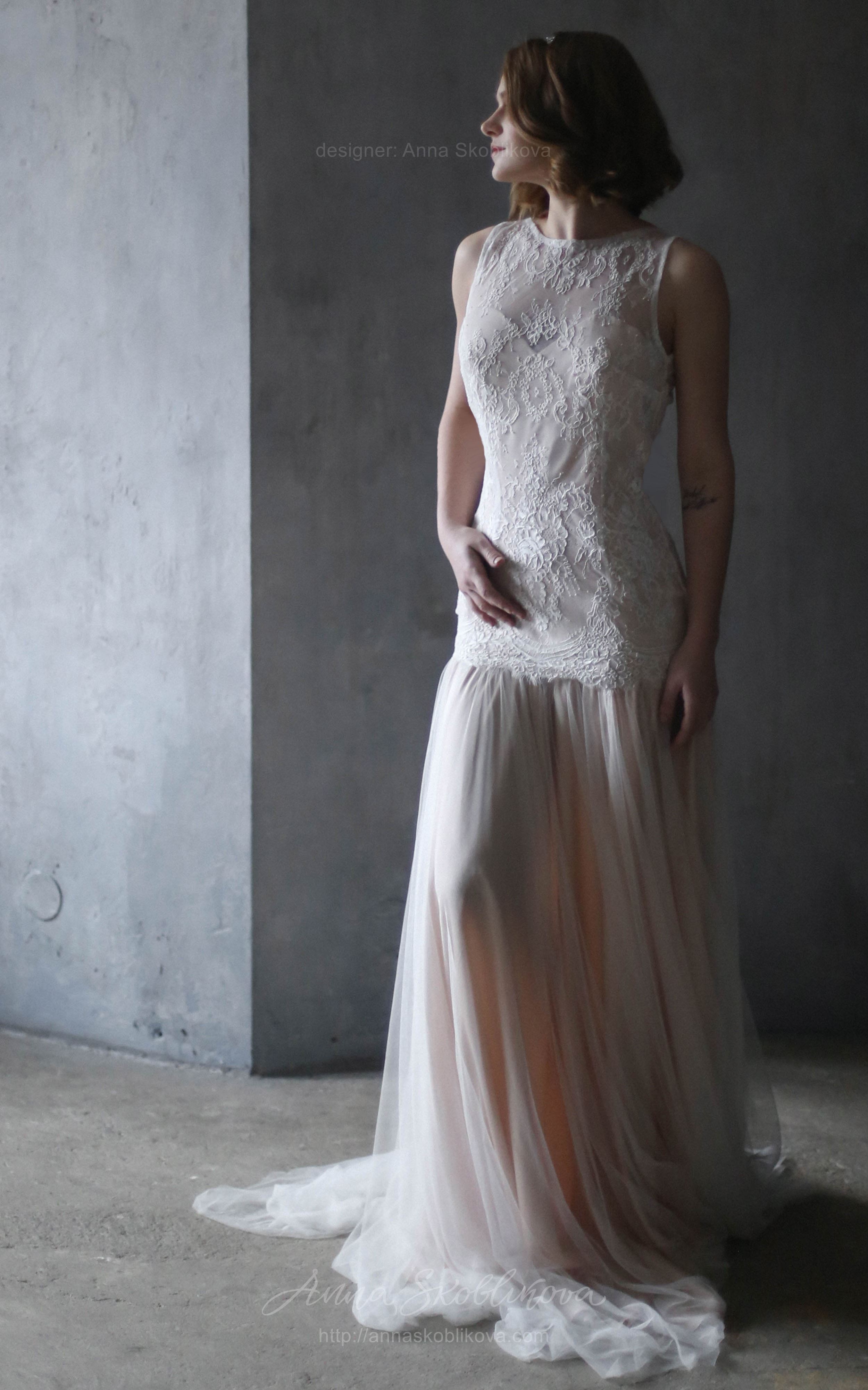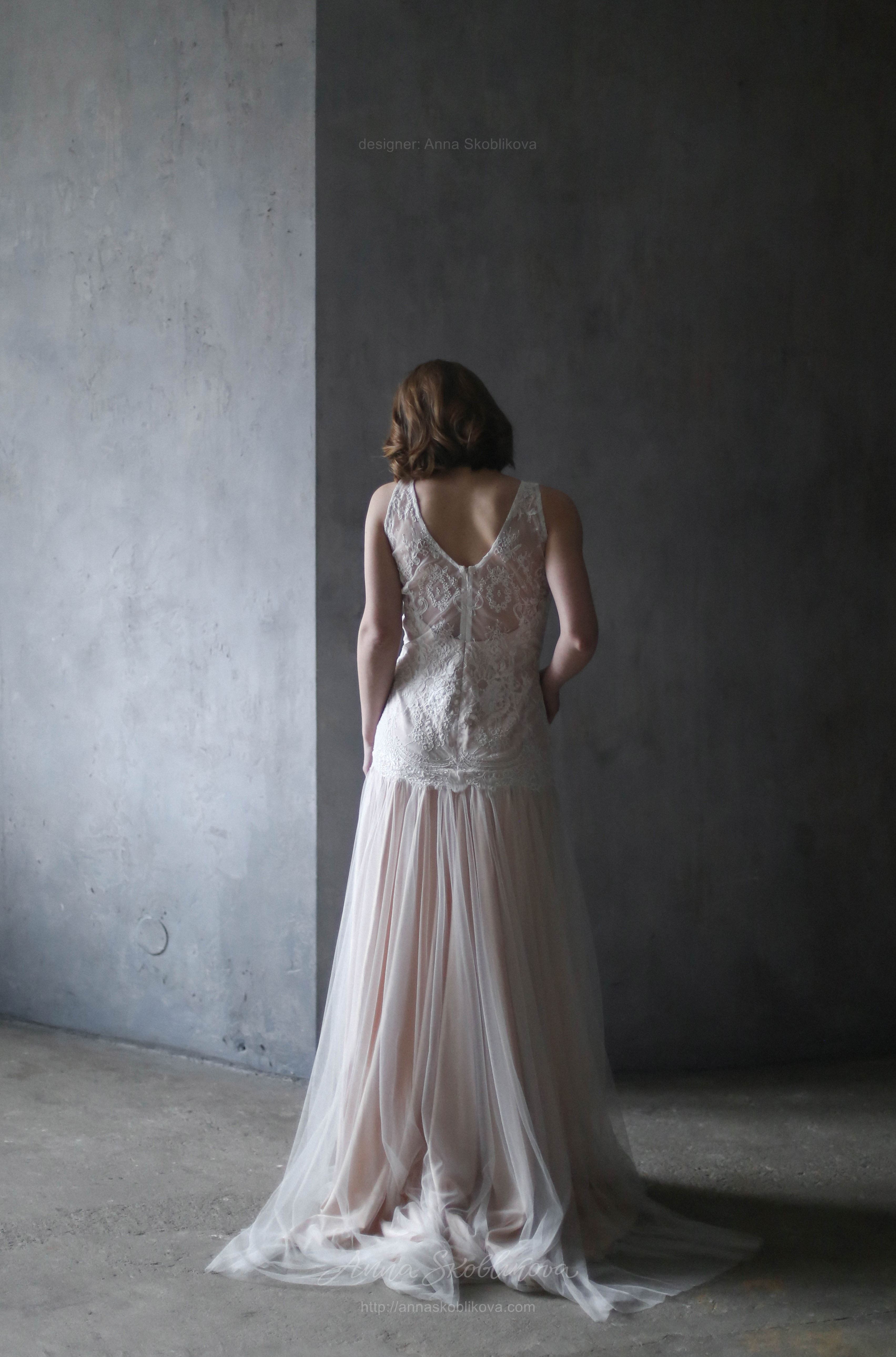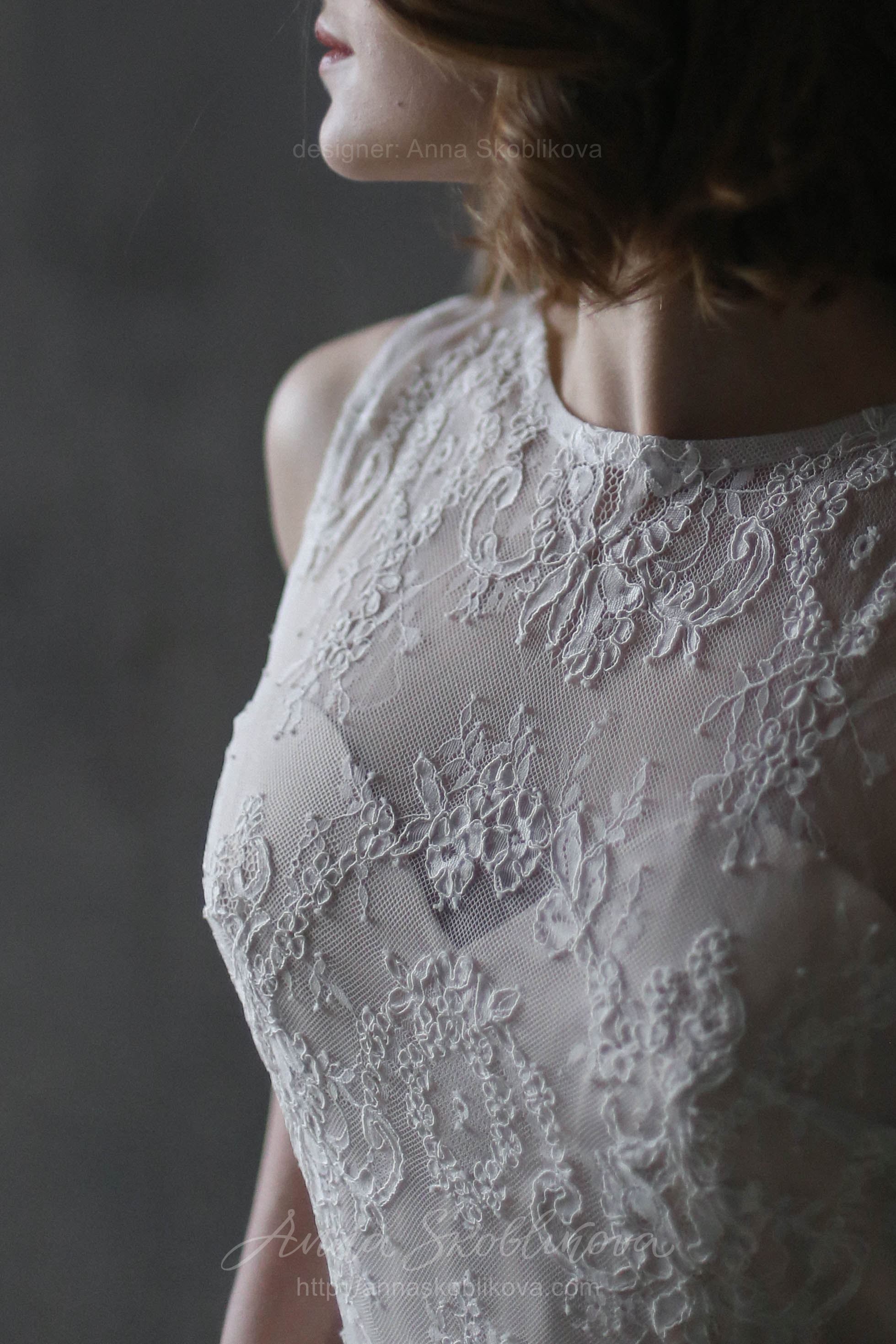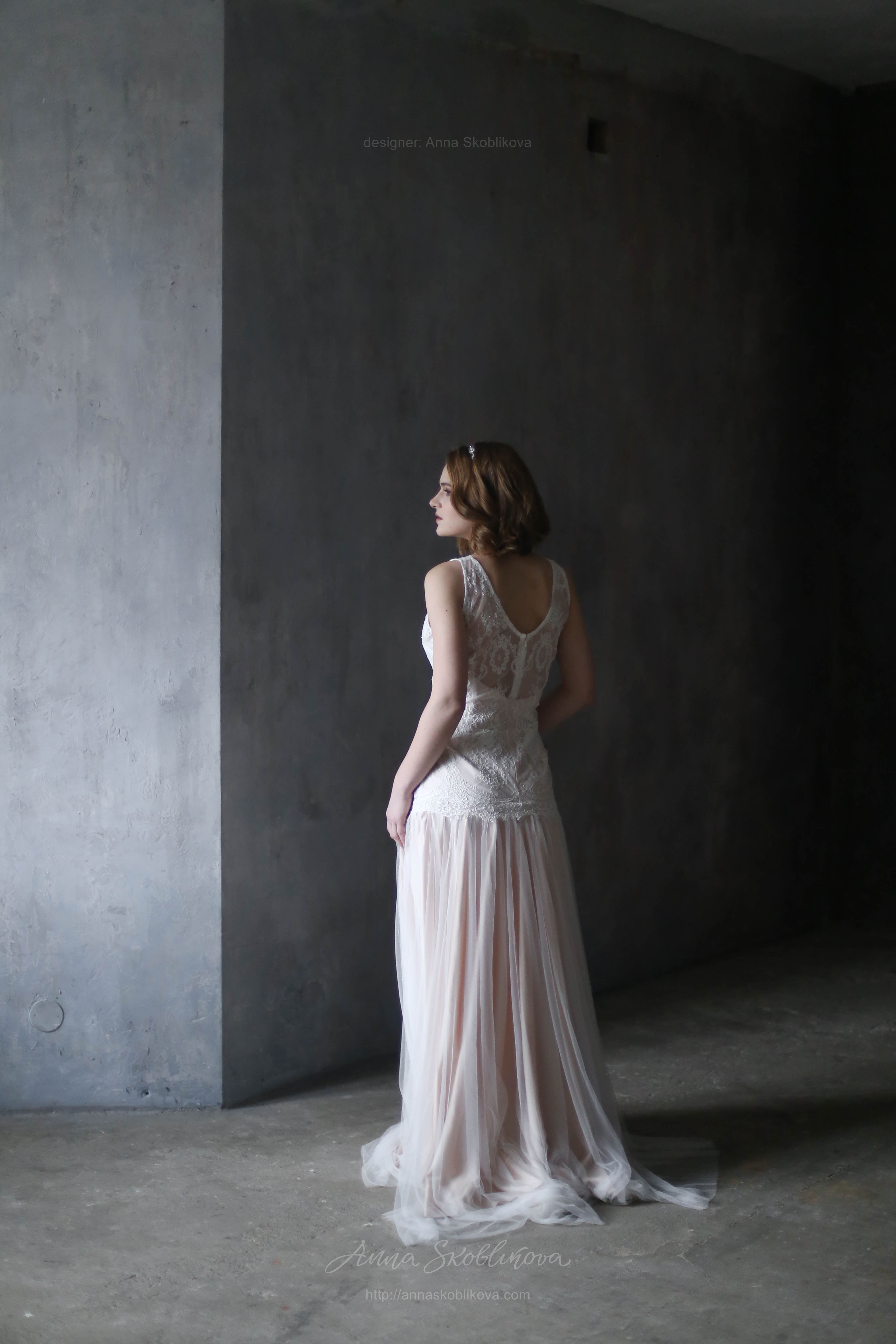 Delicate wedding dress with lace a slightly covering hips. Lining is of powder colour. Skirt is made from stretch-satin and fine Italian net. This also features a round cut from behind which shows a bit of scapulas.