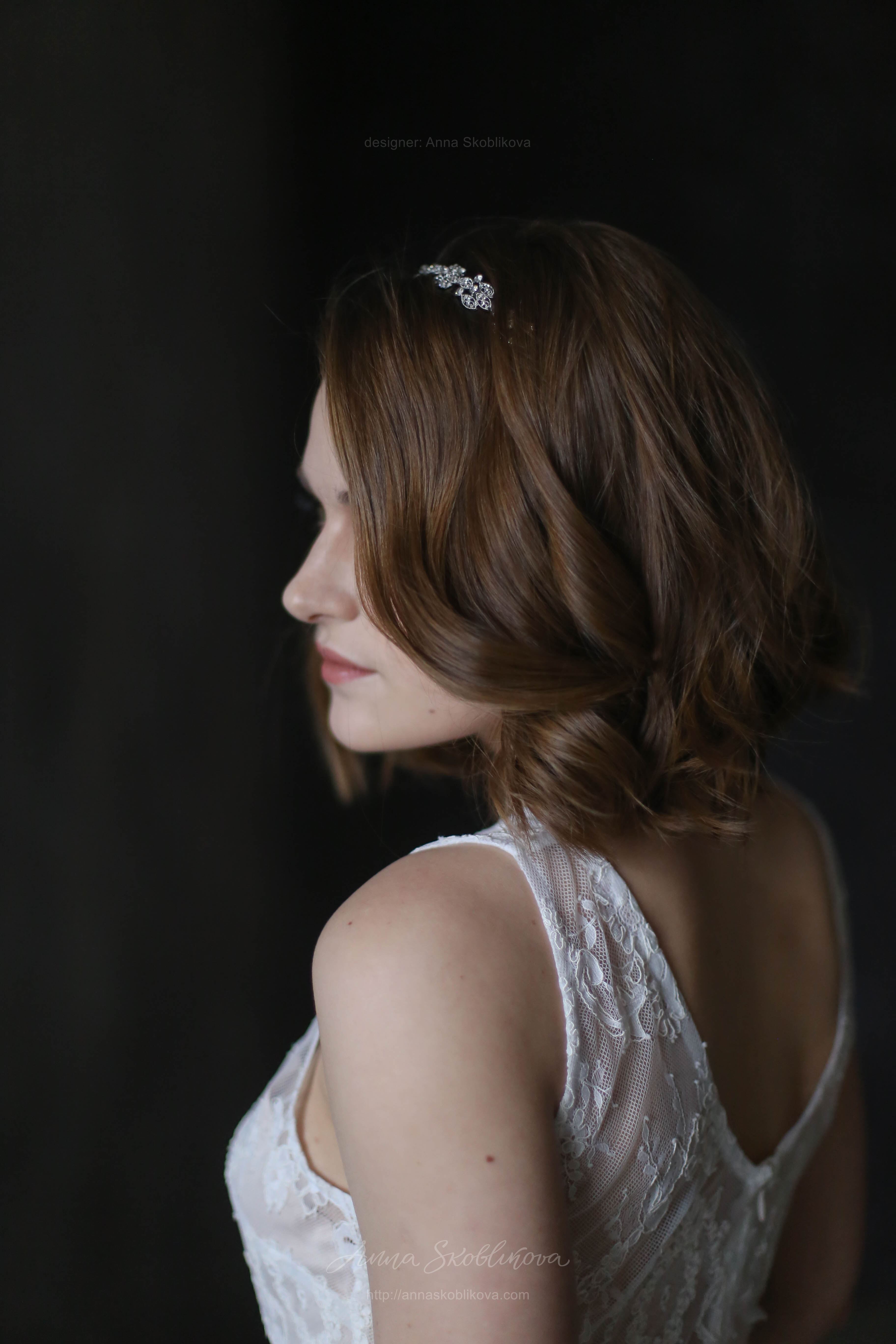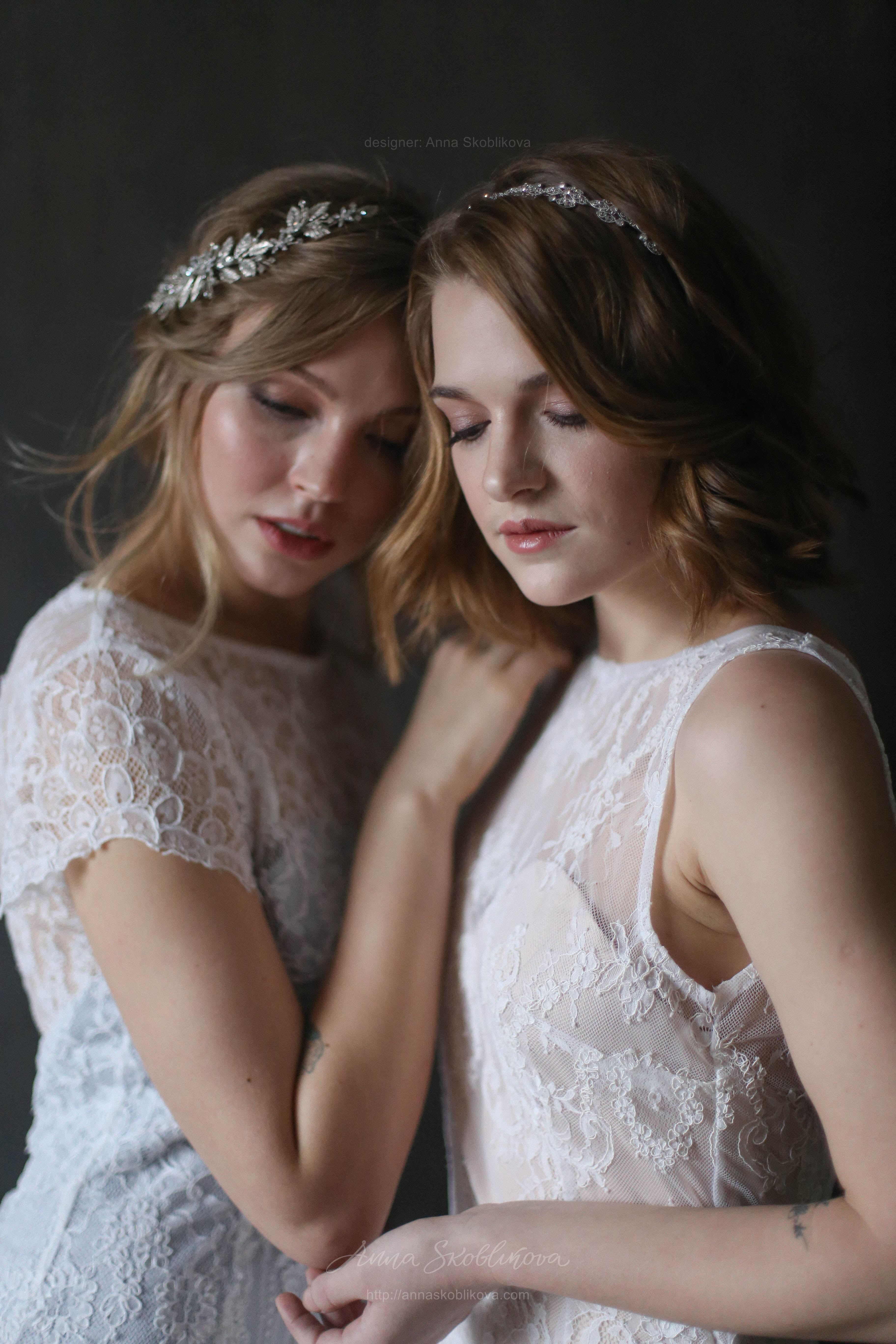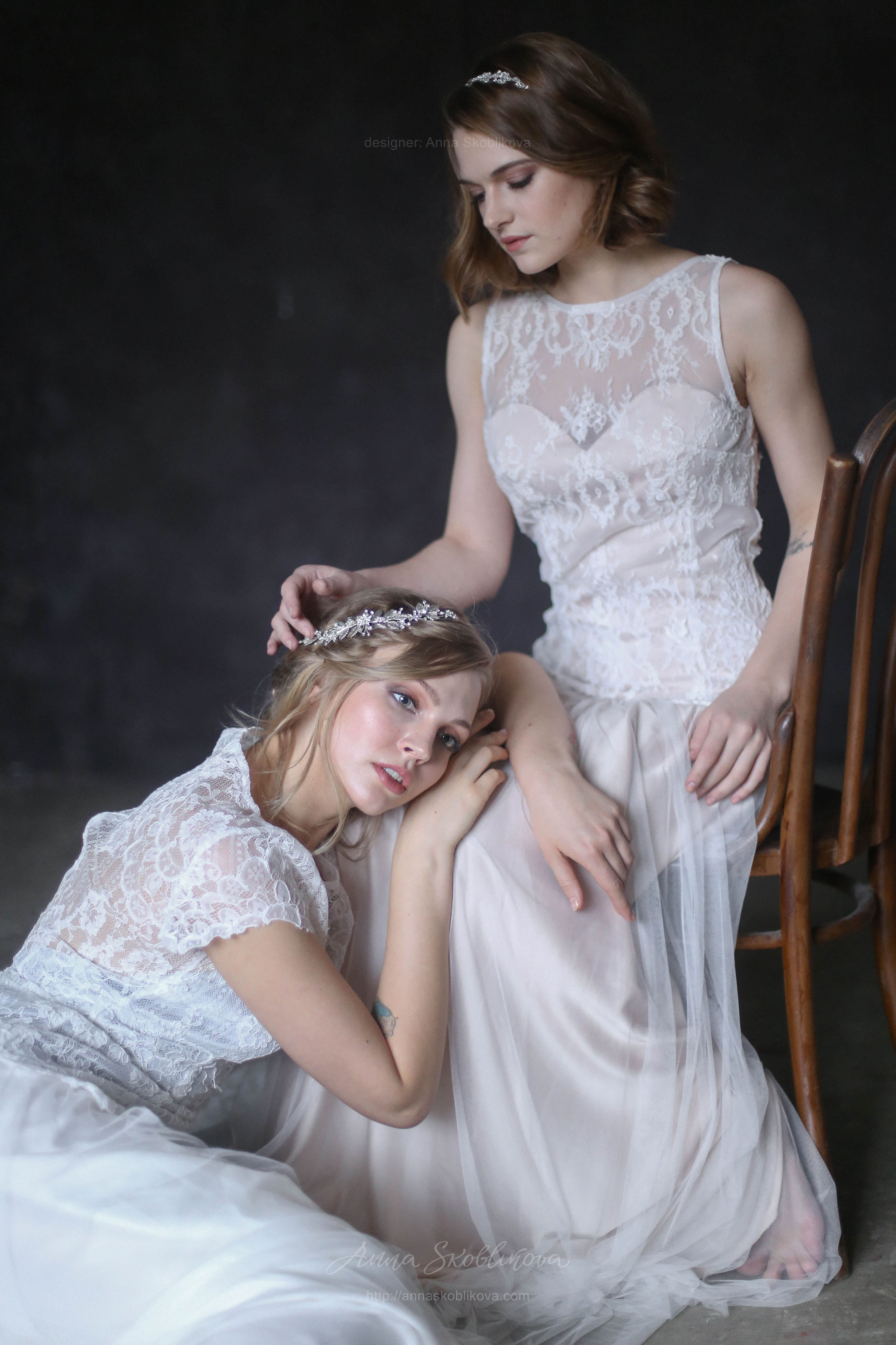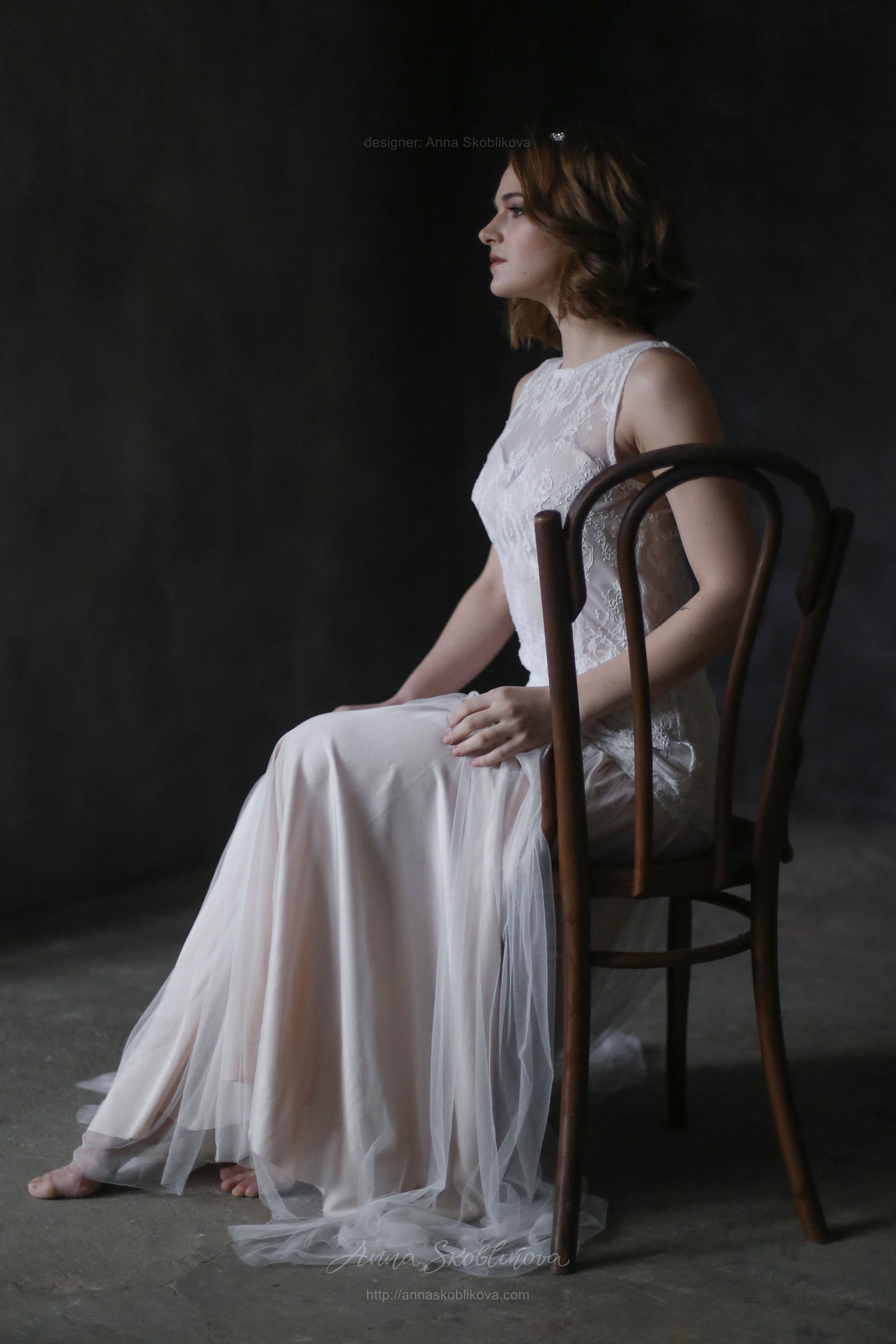 Delicate wedding dress with lace a slightly covering hips. Lining is of powder colour. Skirt is made from stretch-satin and fine Italian net. This also features a round cut from behind which shows a bit of scapulas.