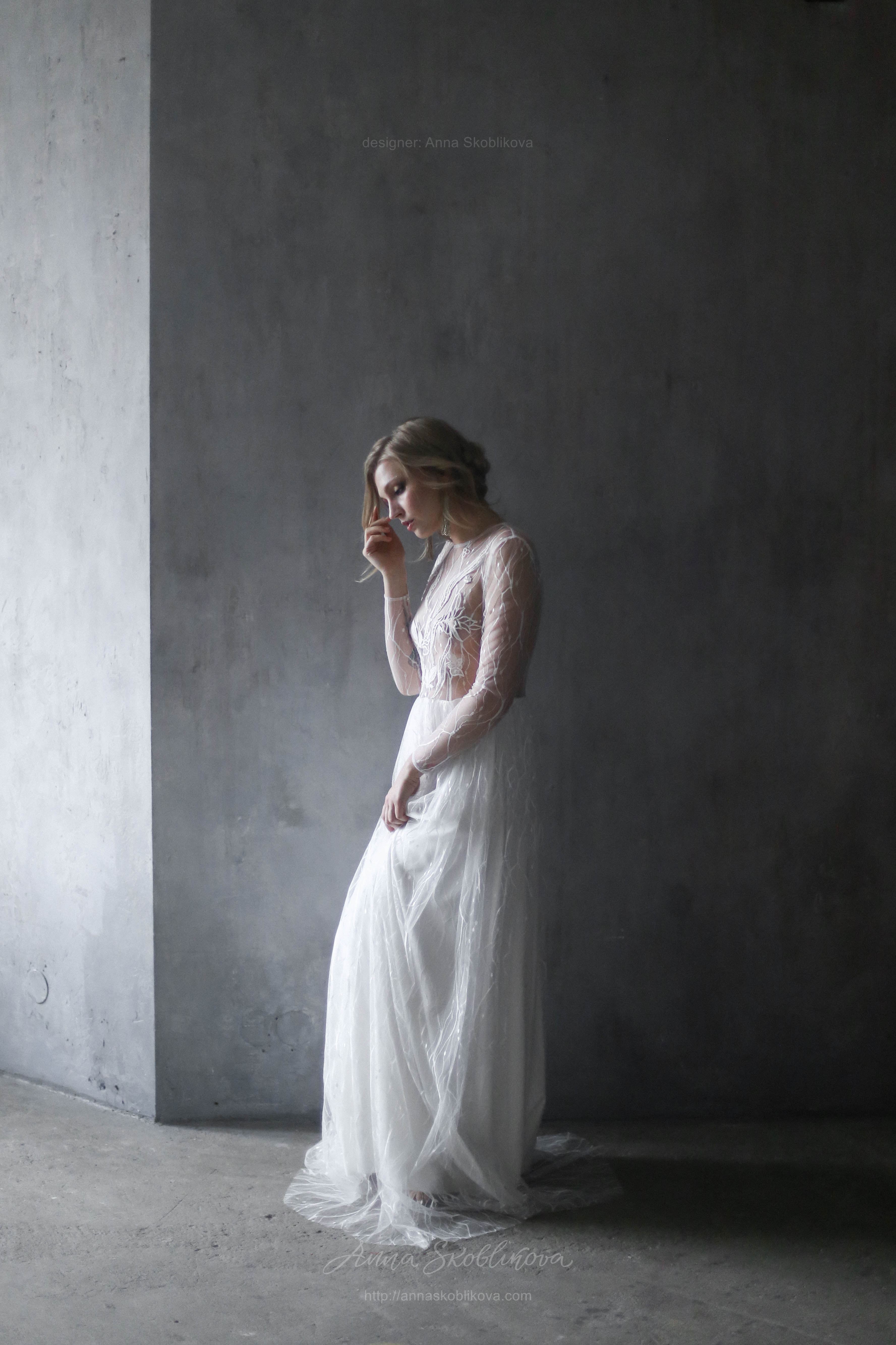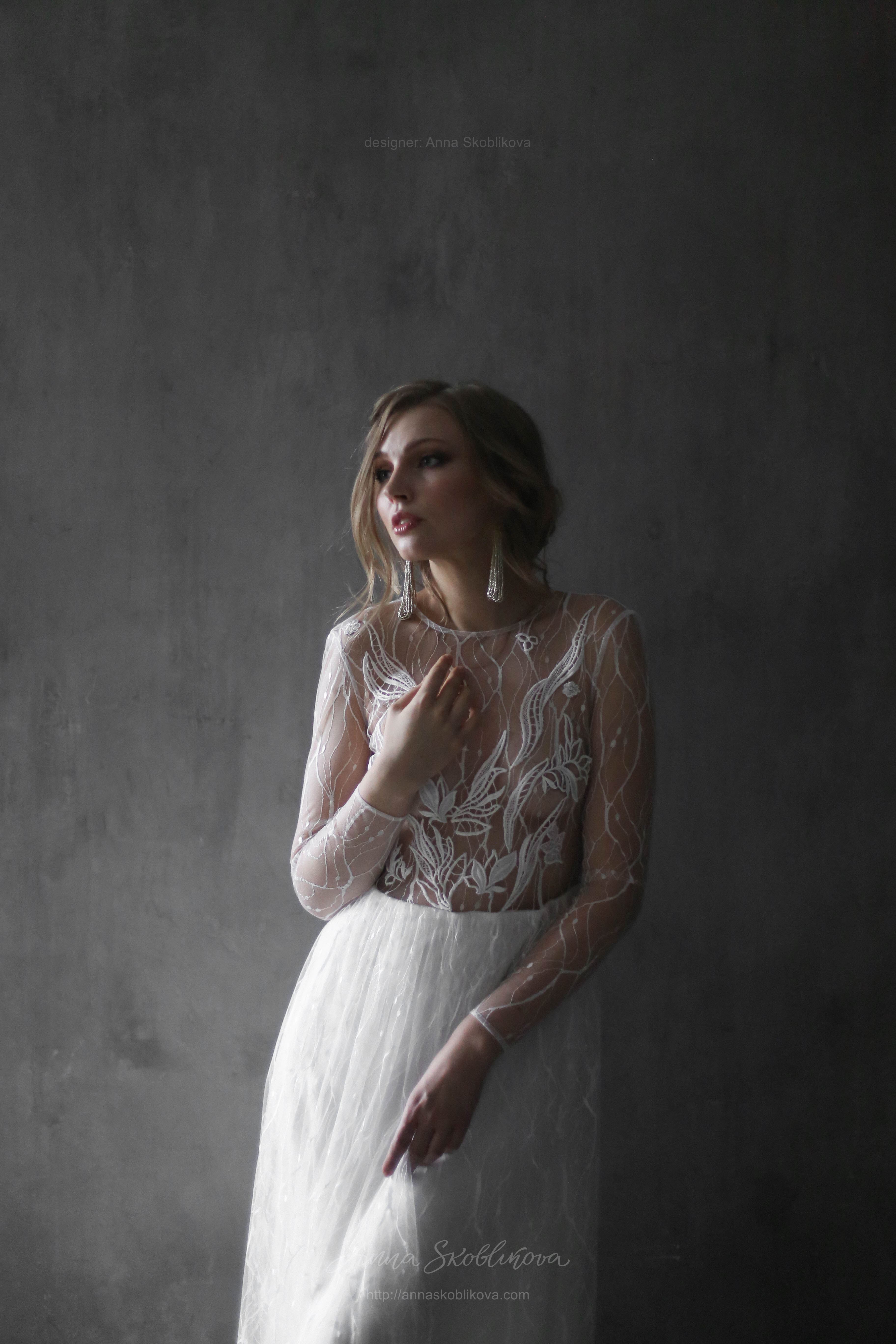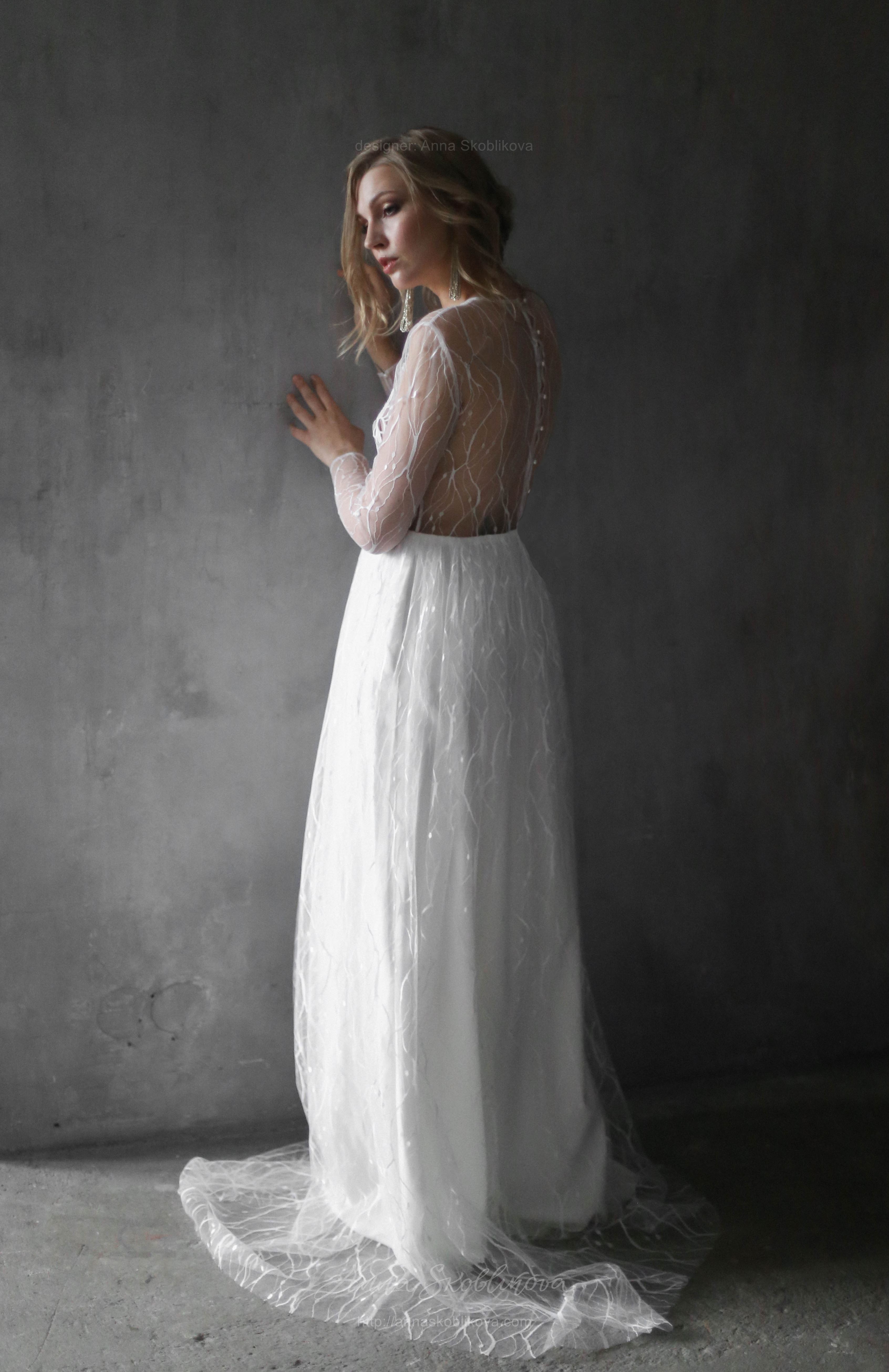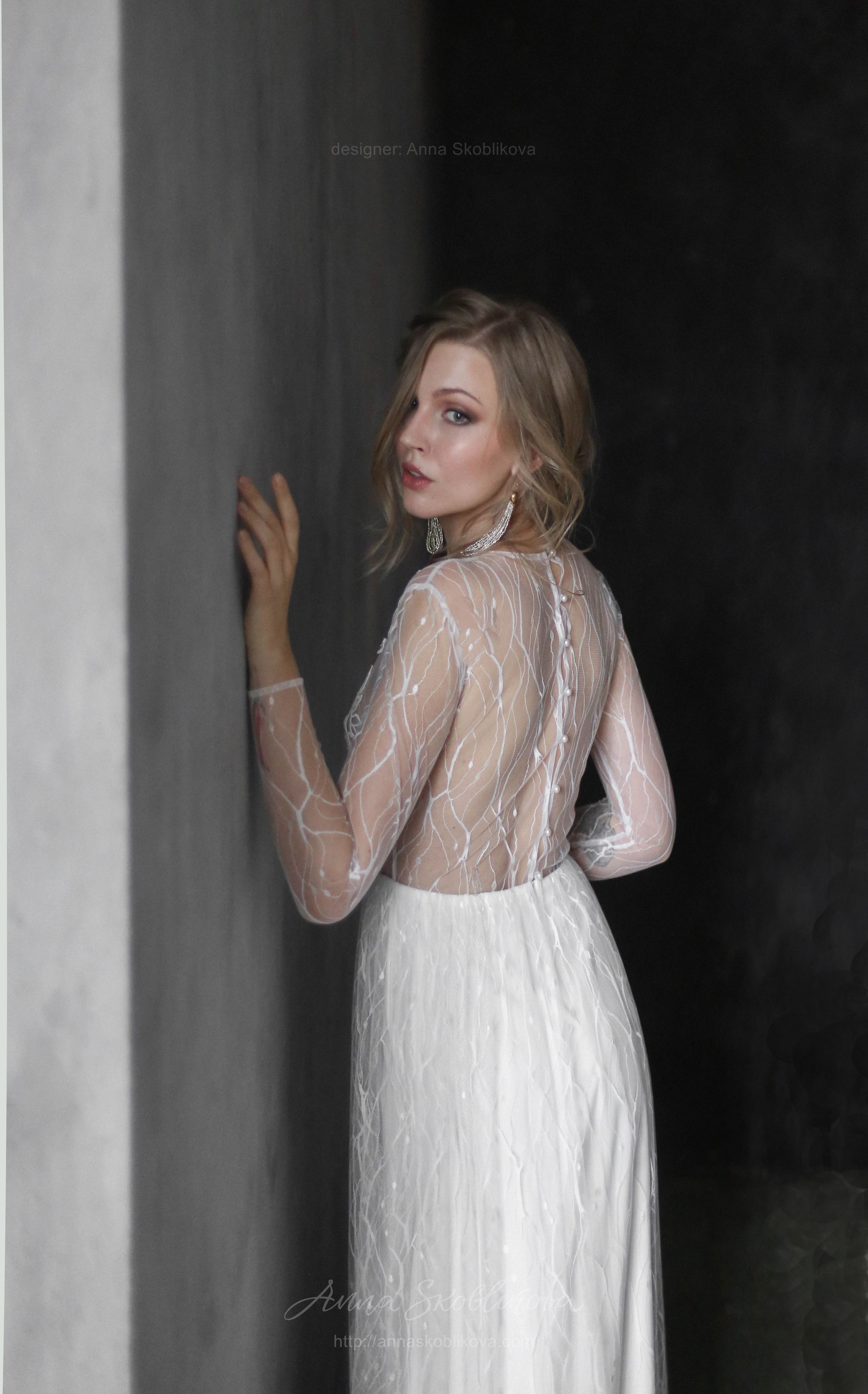 Weightless airy handmade dress. It`s created of the texture net and top is hand-embroidered. Back and sleeves are transparent. Back fastens with small buttons. Skirt has 2 layers: bottom layer – stretch-satin, top layer is of the net fitted on the waist.
