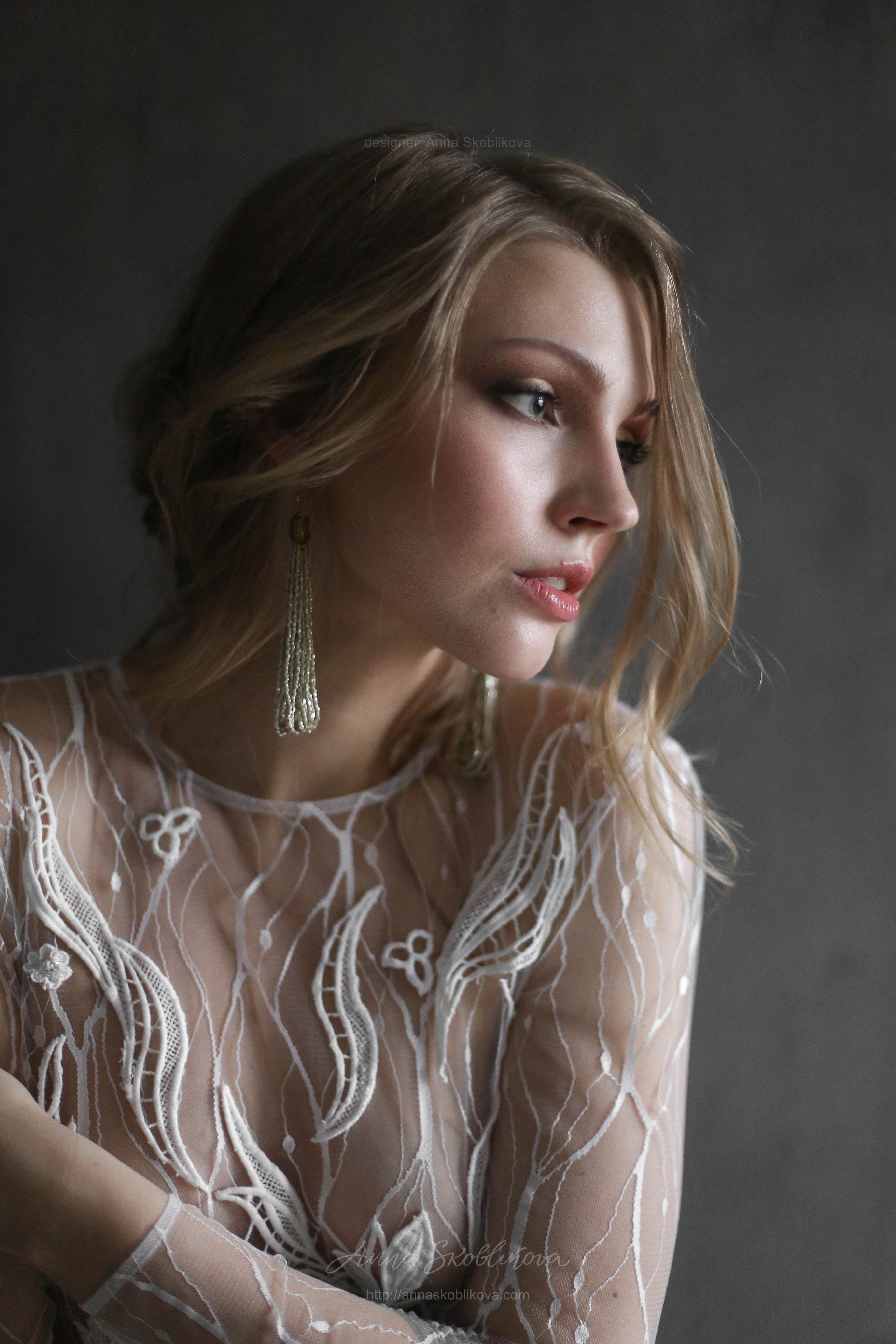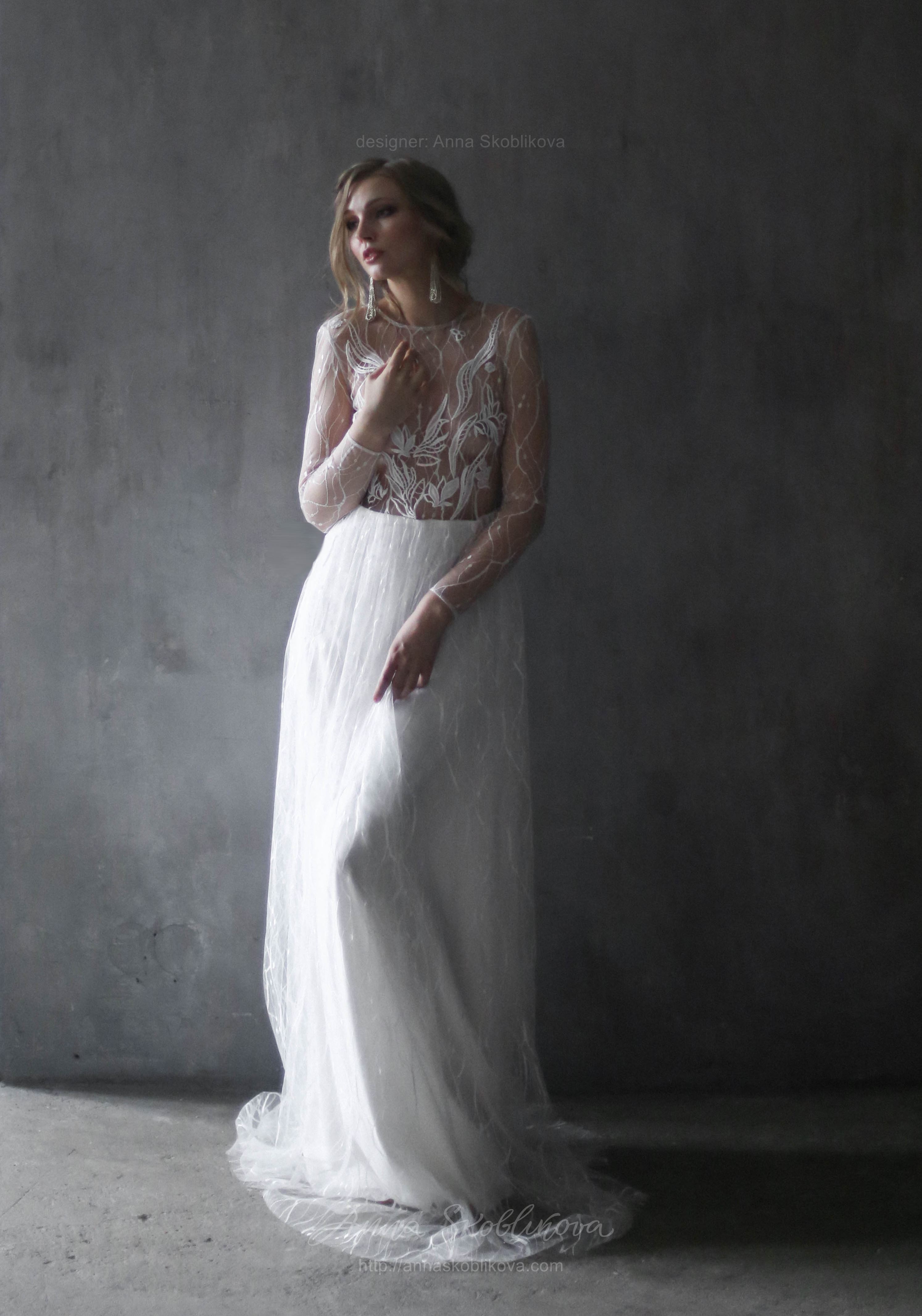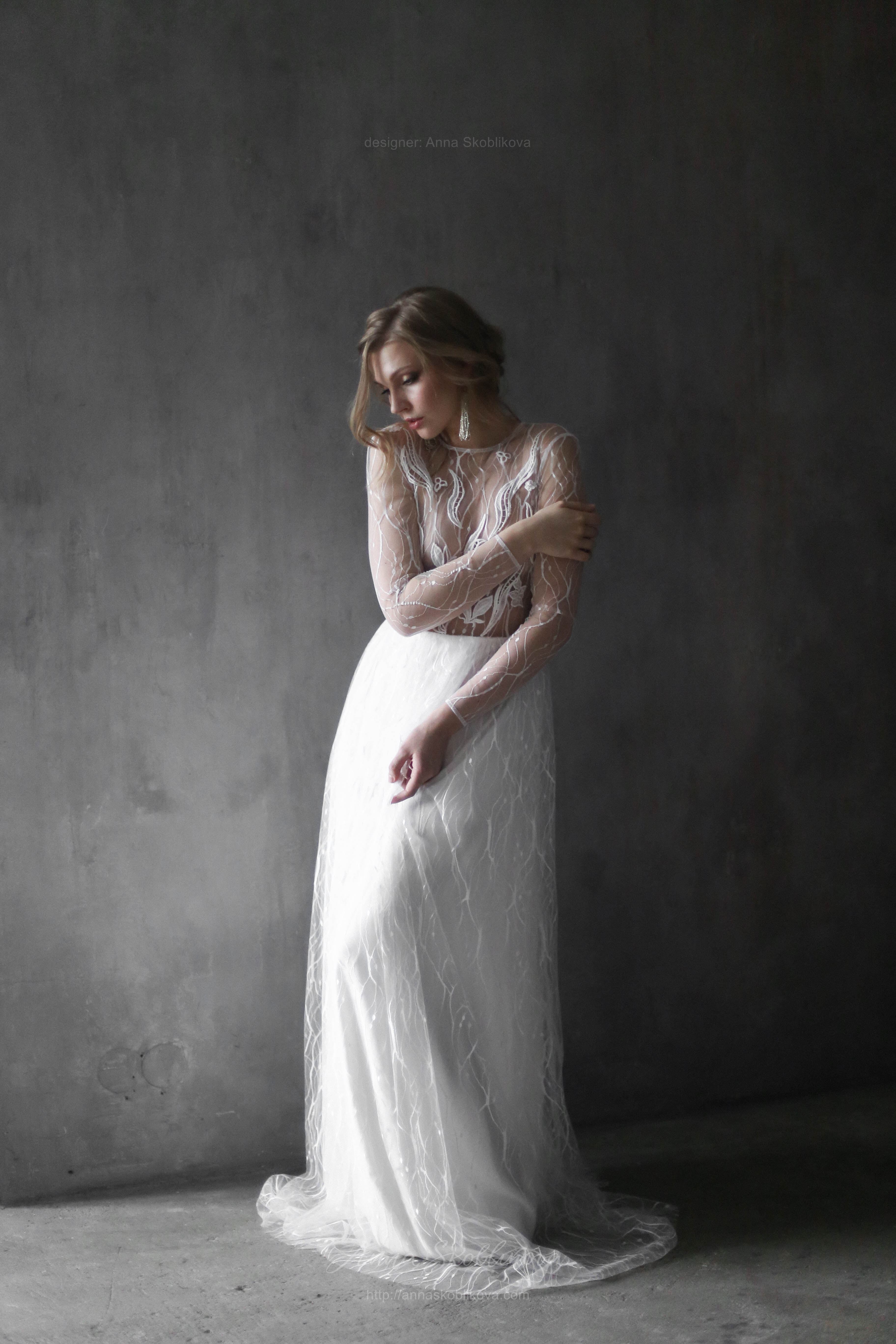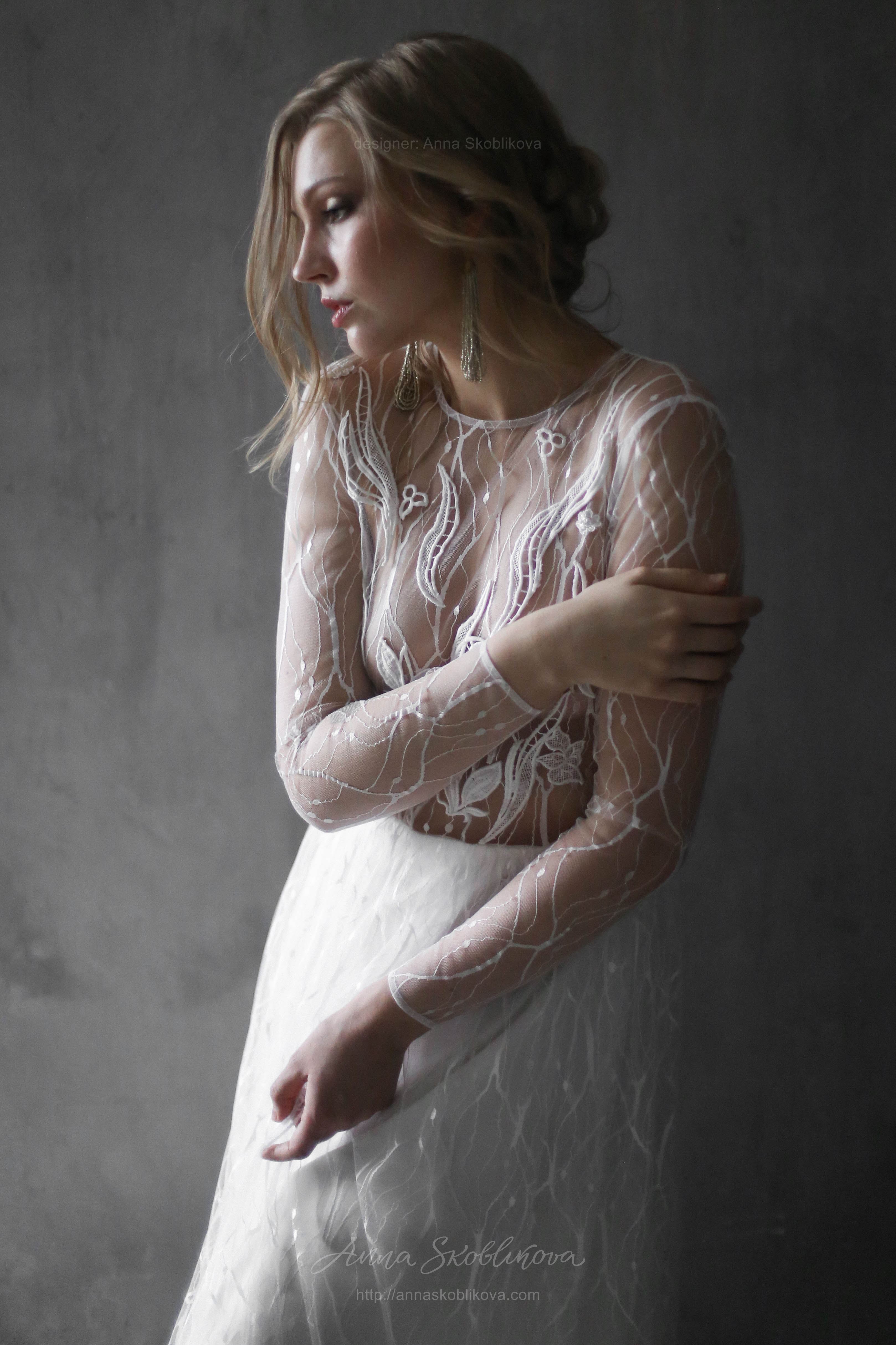 Weightless airy handmade dress. It`s created of the texture net and top is hand-embroidered. Back and sleeves are transparent. Back fastens with small buttons. Skirt has 2 layers: bottom layer – stretch-satin, top layer is of the net fitted on the waist.